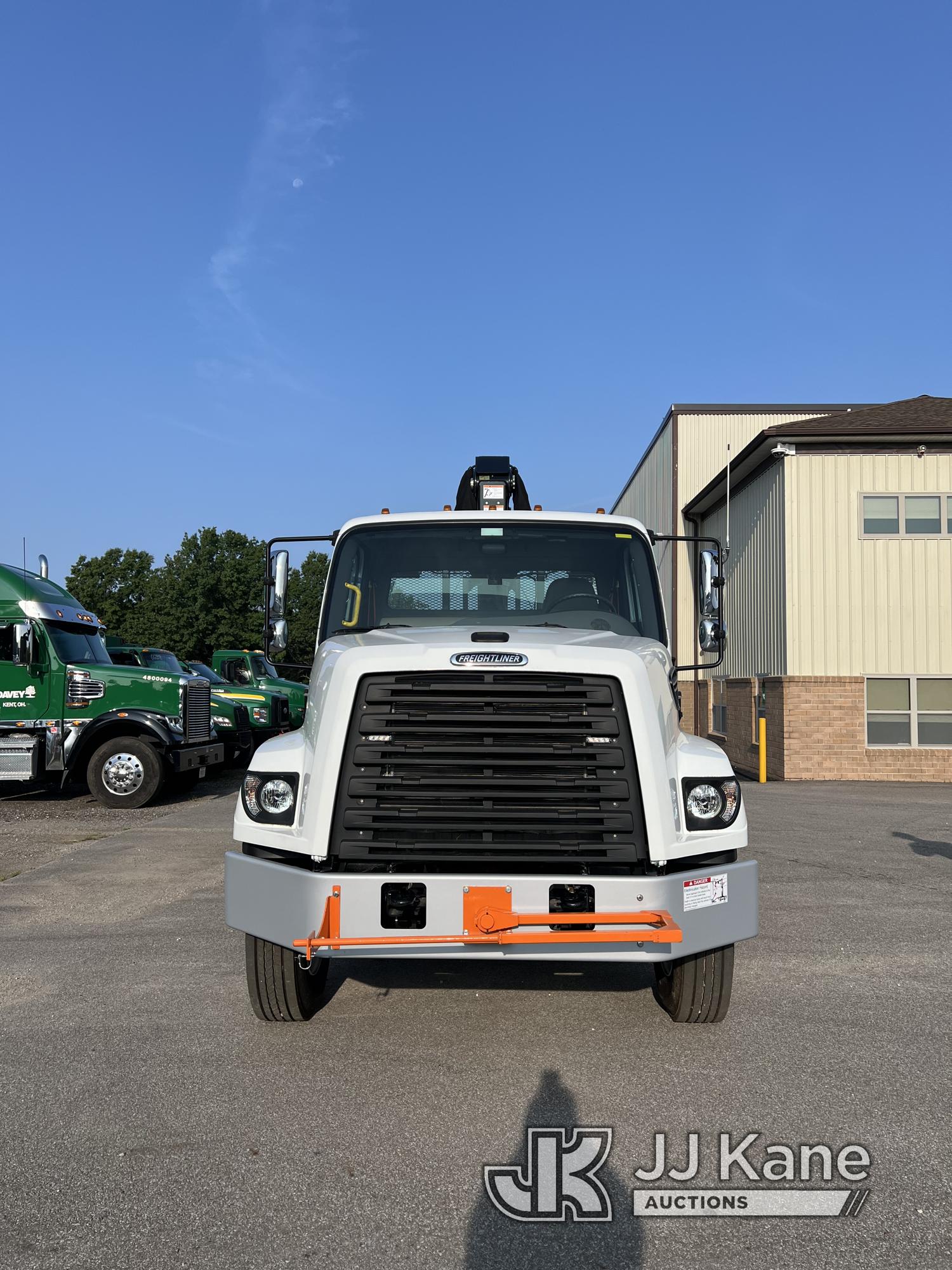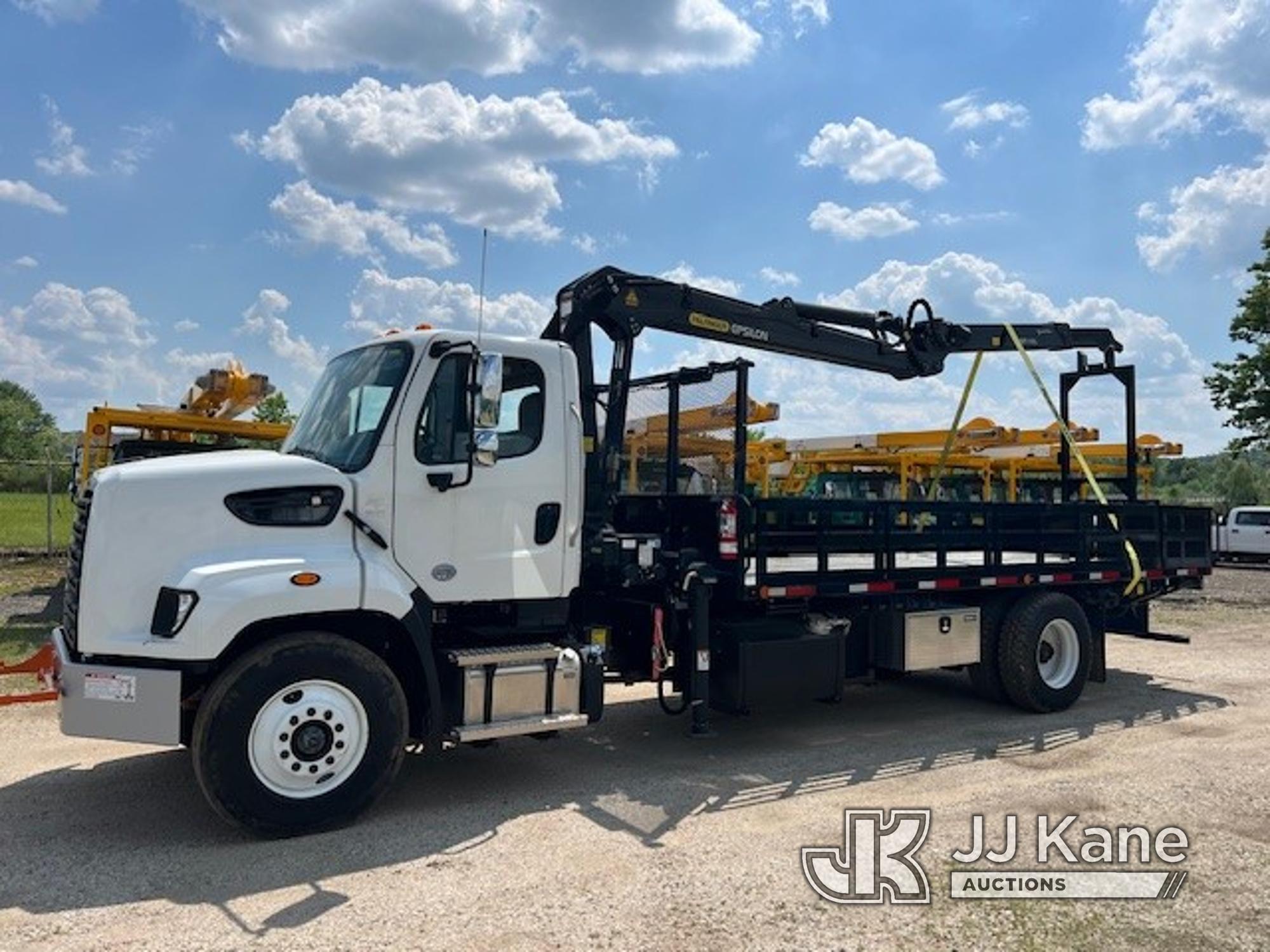 Palfinger Epsilon M110L80, Grappleboom Crane s/n 1100087825, with 79,660 ft-lbs. Maximum Lifting Moment, 26 ft. 2-Stage Boom, Scanreco wireless remote, hydraulic stabilization control from remote, overload protection, load holding valves on main outer cylinder, main boom cylinder protection, mounted behind cab on 2023 Freightliner 108SD Flatbed Truck, Cummins L9 diesel, Auto, A/C, with 33,000 GVWR, 13,300 Front Axle, 23,000 Rear Axle, 250 in. Wheelbase, 20 ft. bed, tool circuit with hose reel, (931 miles) (Runs, Moves & Operates) (Full Freightliner Warranty to Begin Upon Sale, No Grapple Included) This is a Titled Item*