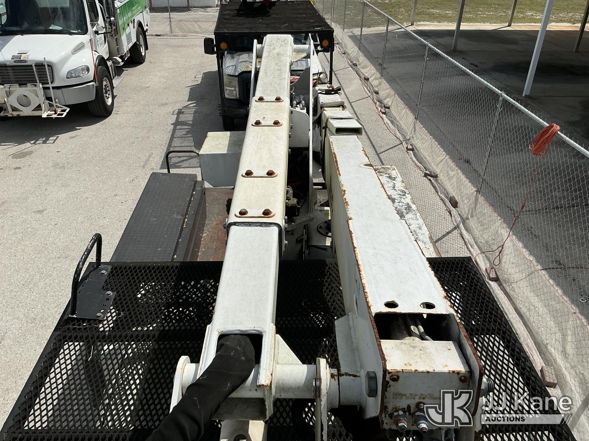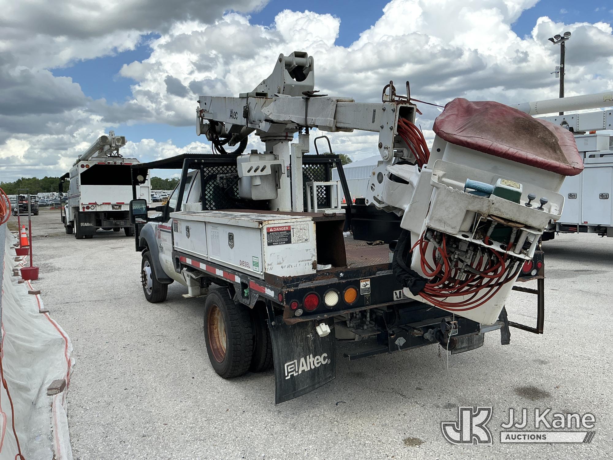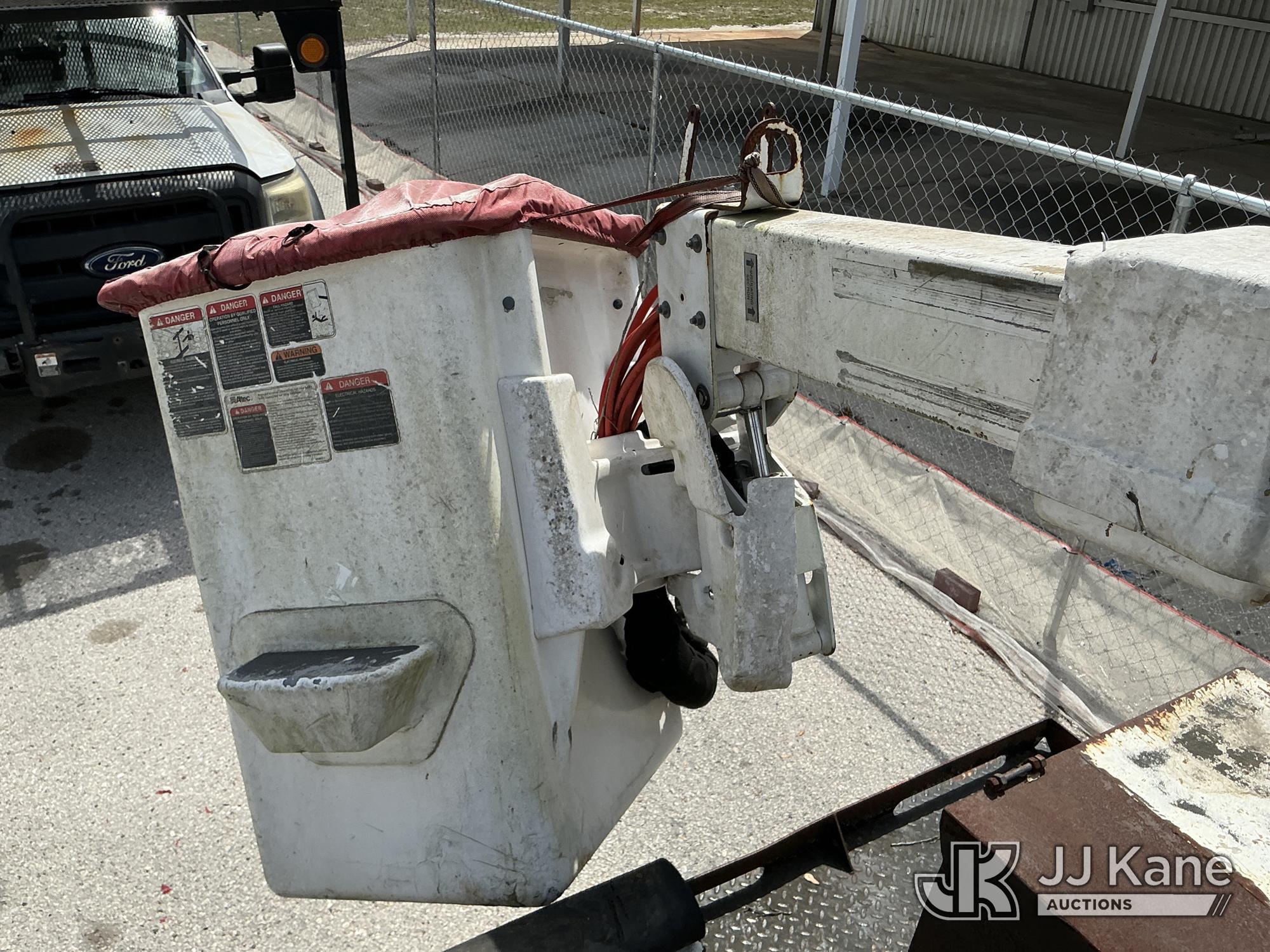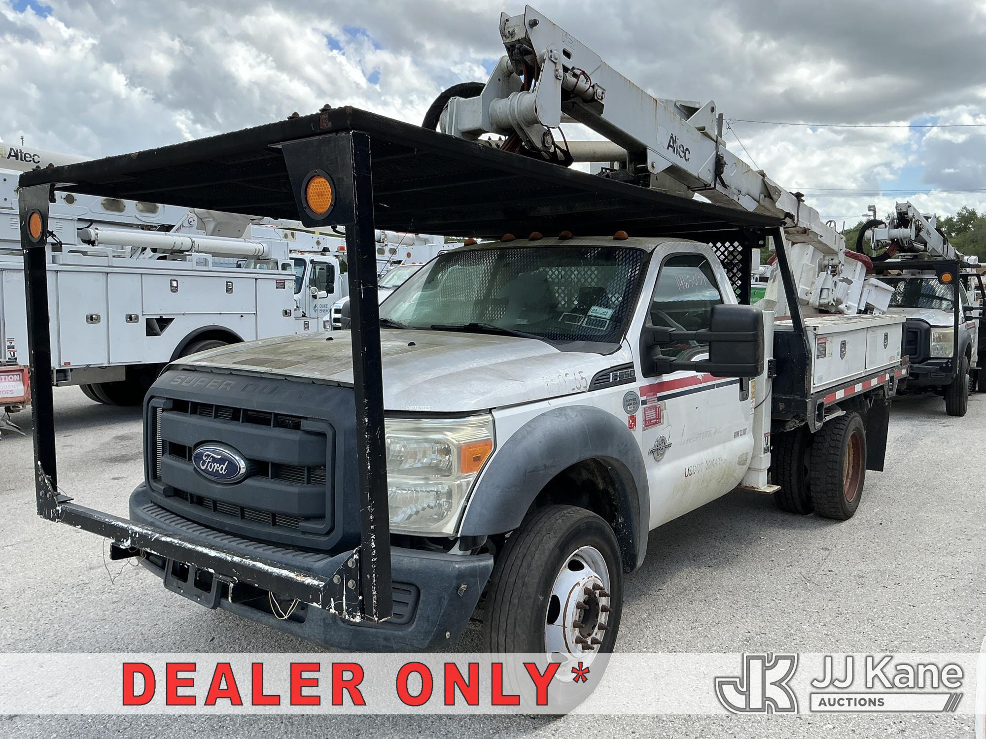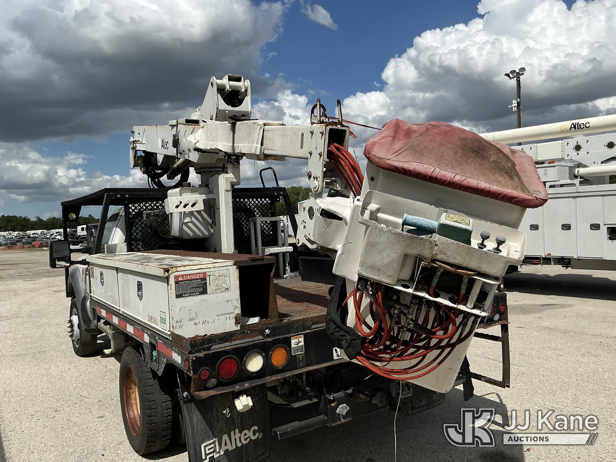 Altec AT37G, 42 ft, Articulating & Telescopic Bucket Truck s/n 0714DE16799, with single-man bucket & 2 hydraulic outriggers, mounted behind cab on 2015 Ford F550 4x4 Flatbed Truck, 6.7L diesel, Auto, A/C, (54,179 miles (unverified)) (**Dealer Only** Not Running, Condition Unknown) (Check Engine Light On, Body & Paint Damage); **Note**This item has been removed from service due to the listed safety repairs that were not completed. The safety items below must be completed by an approved OEM facility before the unit can return to service: REPLACE DAMAGED LOWER BOOM ASSEMBLY, REPLACE DAMAGED LOWER BOOM LIFT CYLINDER, COMPLETE ANSI INSPECTION, COMPLETE ANY REQUIRED TESTING AND REPAIRS AFTER INSPECTIONS ARE COMPLETED)(FL Residents Purchasing Titled Items - tax, title & registration fees will be collected at the maximum rate of $400.00 under 25,999 and $800.00 for Over 26,000 and $250.00 for Trailers - Proof of insurance is mandatory; Out of State Residents Purchasing Title Items - tax will be collected based upon your state rate.) (Bidding Restricted to Licensed Vehicle Dealers Only), This is a Titled Item*