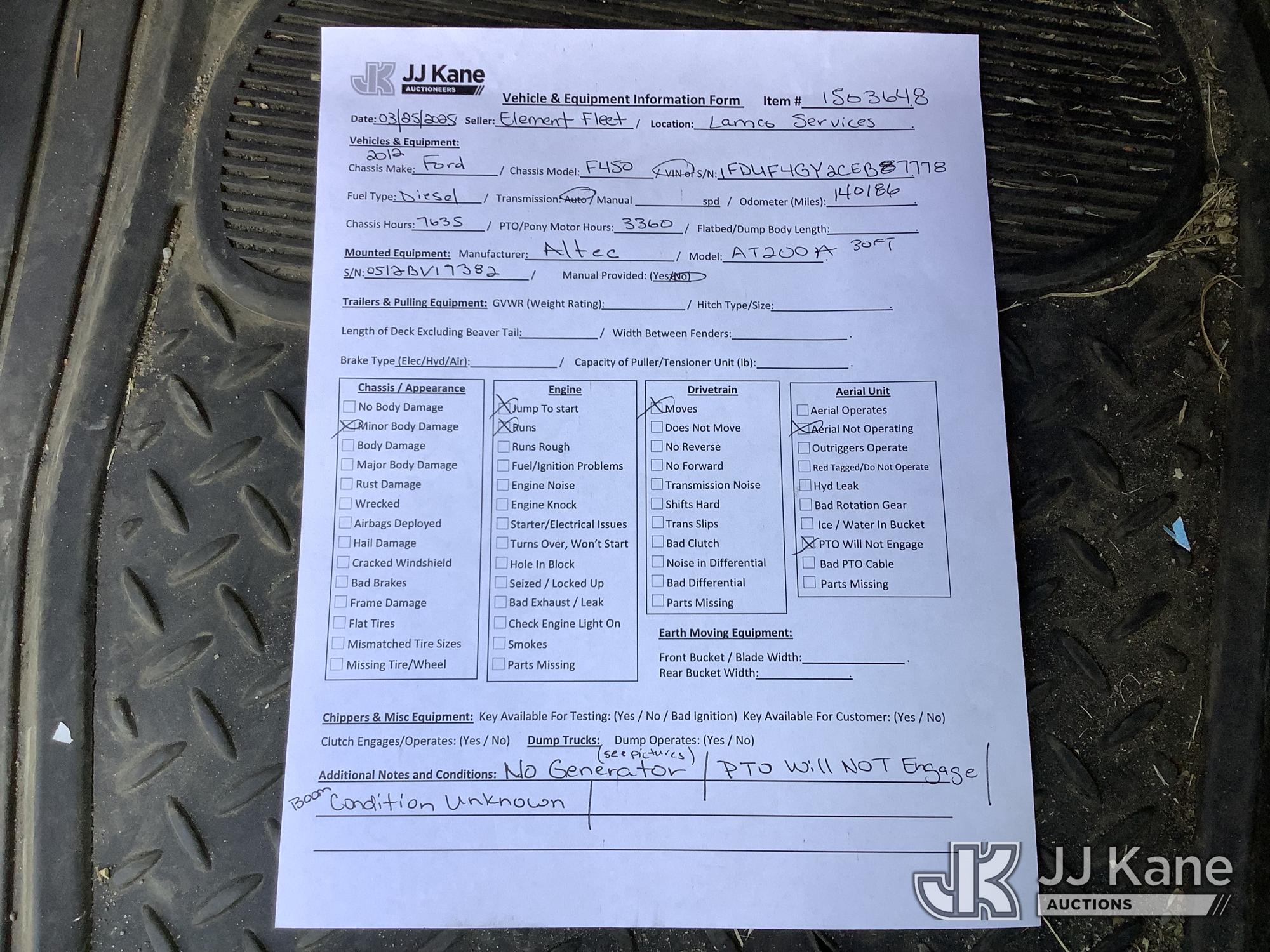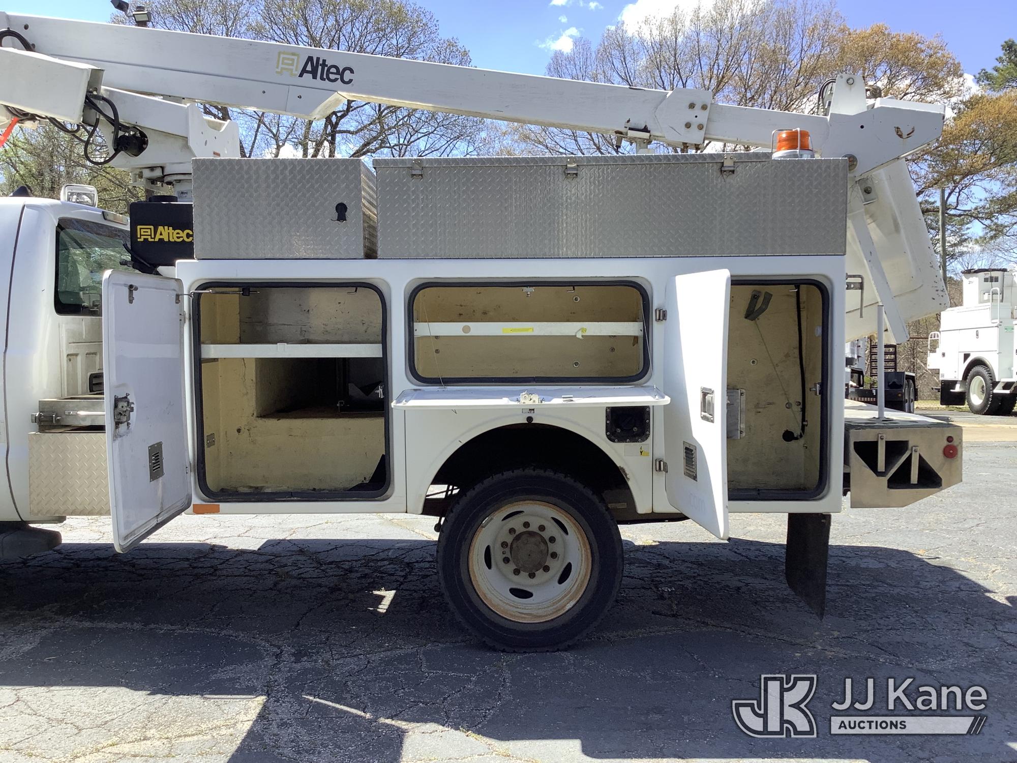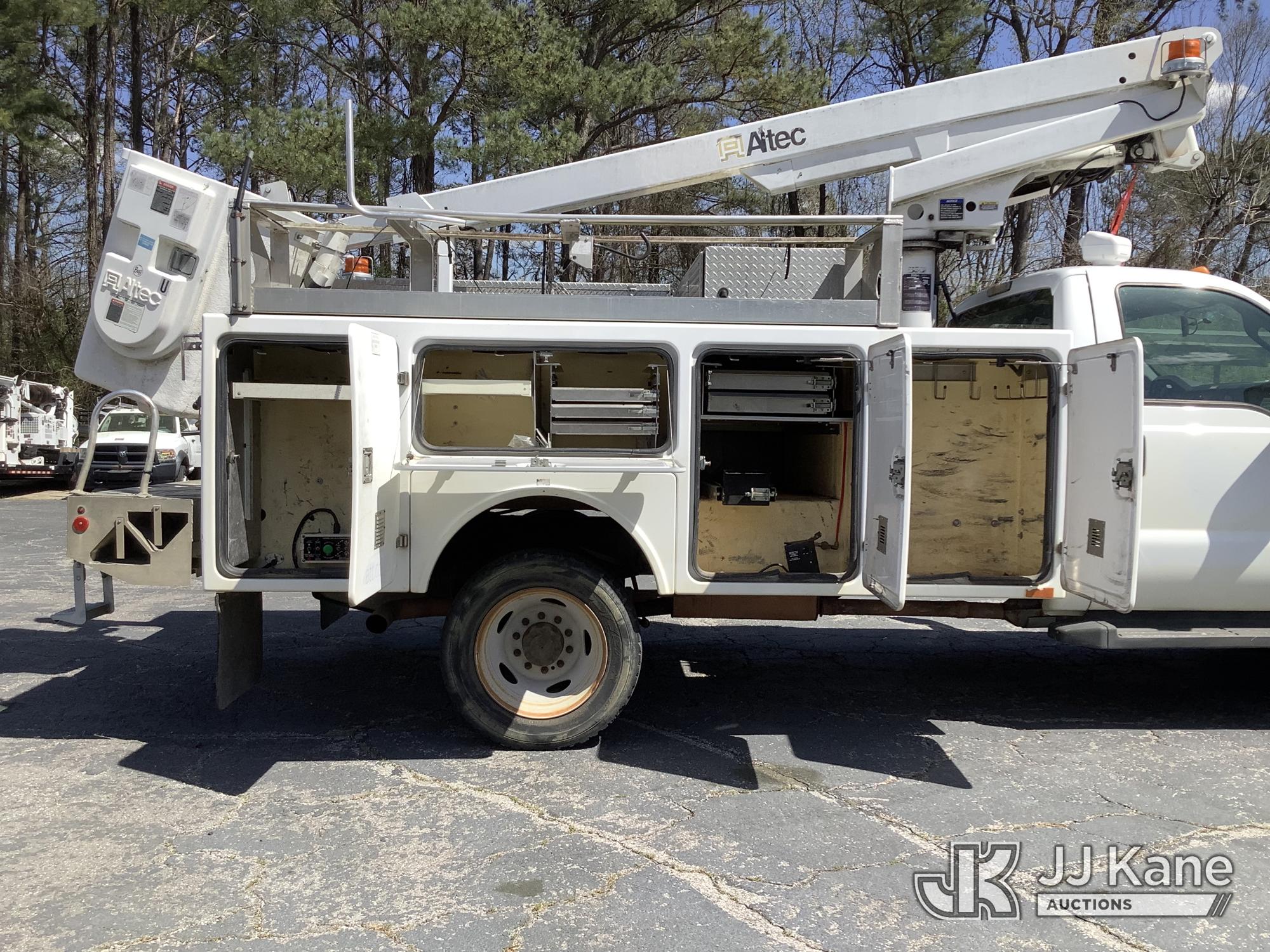 Altec AT200-A, 35 ft, Articulating & Telescopic Non-Insulated Bucket Truck s/n 0512BV17382, with Single Man Bucket, mounted behind cab on 2012 Ford F-450 SD Service Truck, 10-cyl gas, Auto, A/C, (140,186 miles) (Runs, Moves & Upper Condition Unknown) (Missing Generator, Minor Body Damage, PTO Will Not Engage) This is a Titled Item*