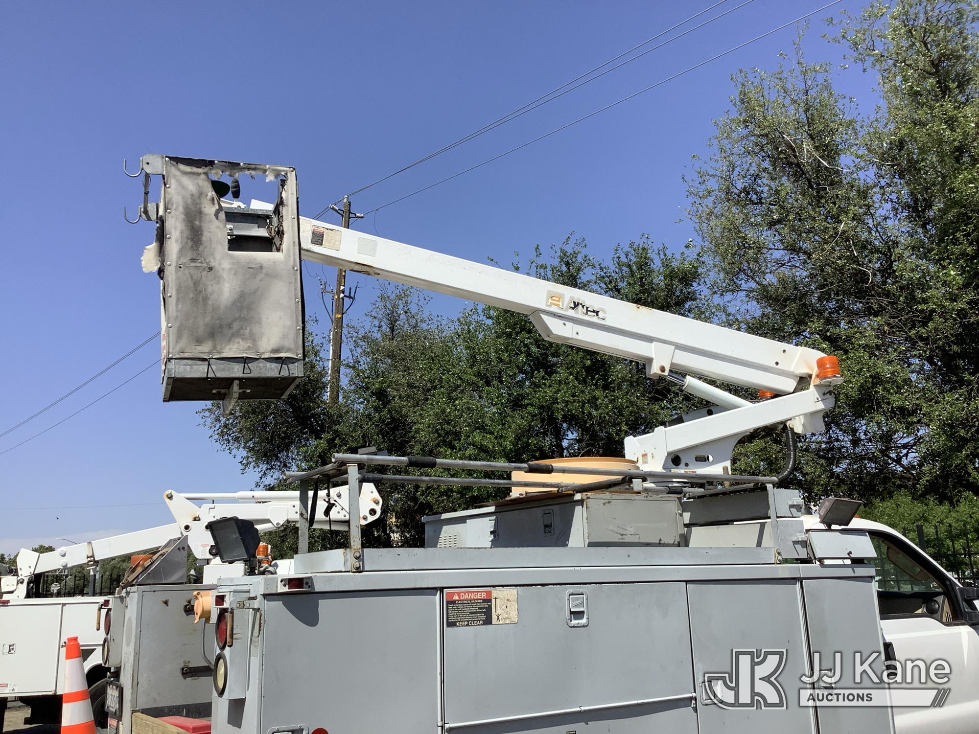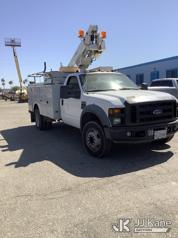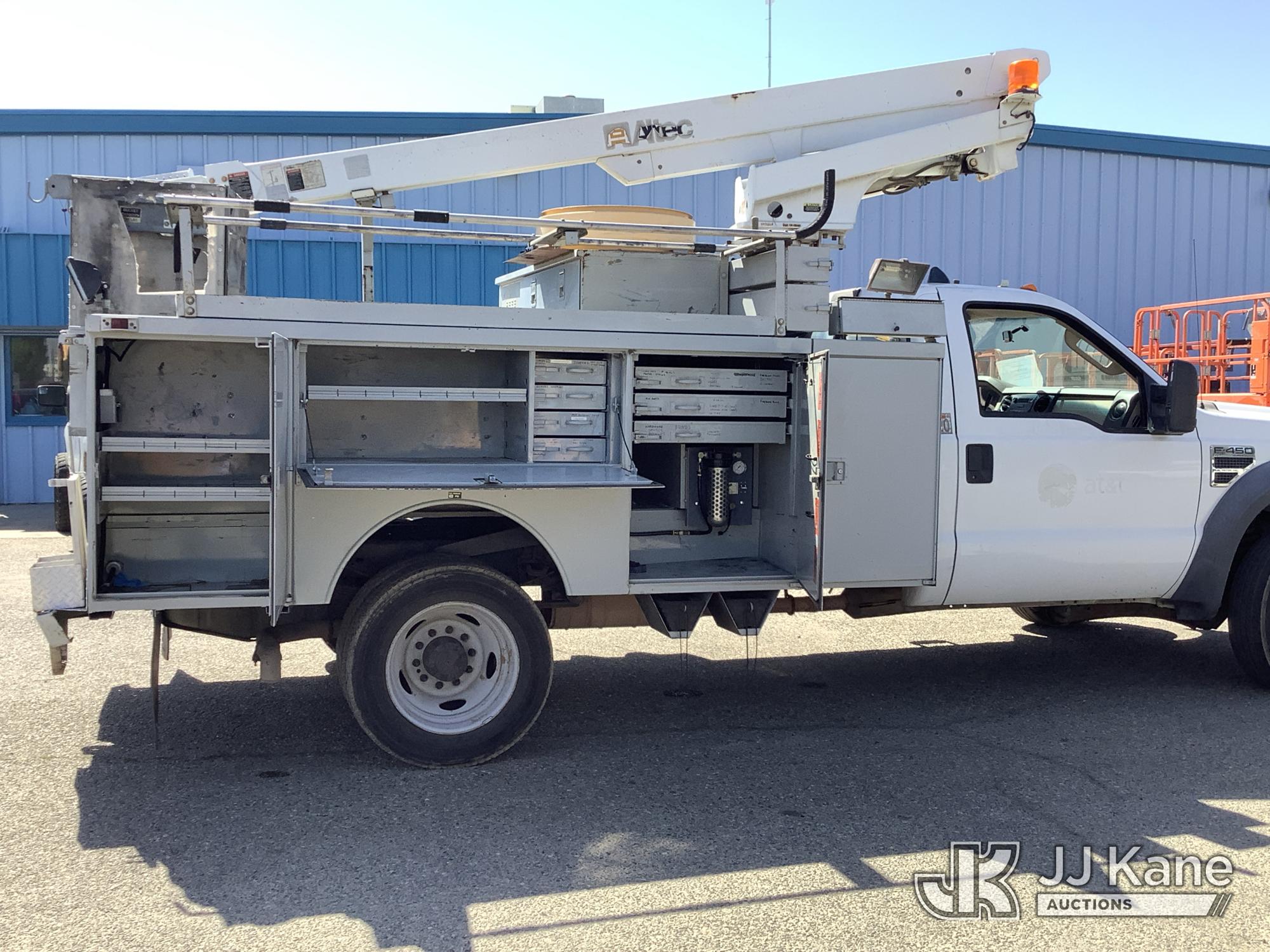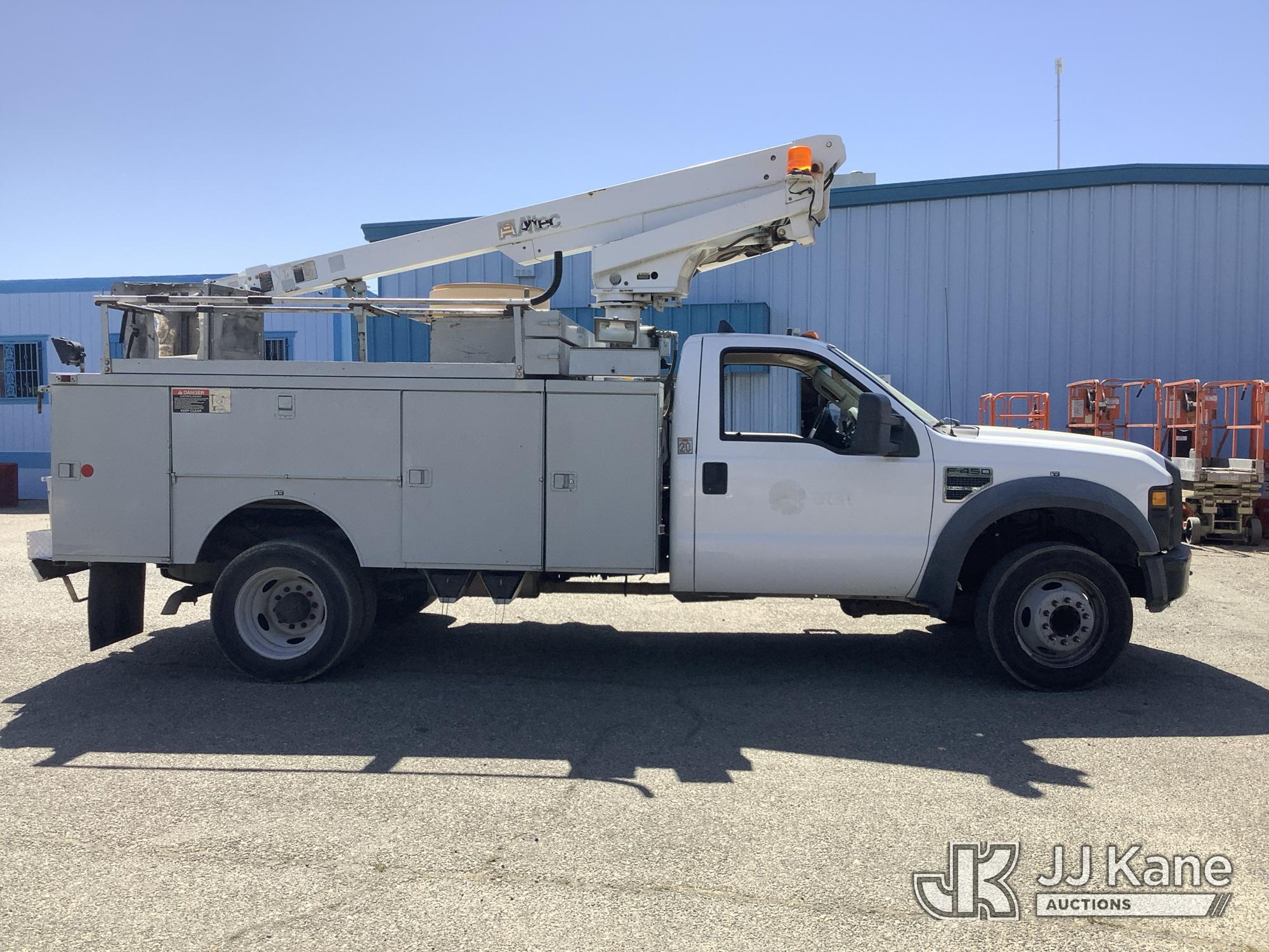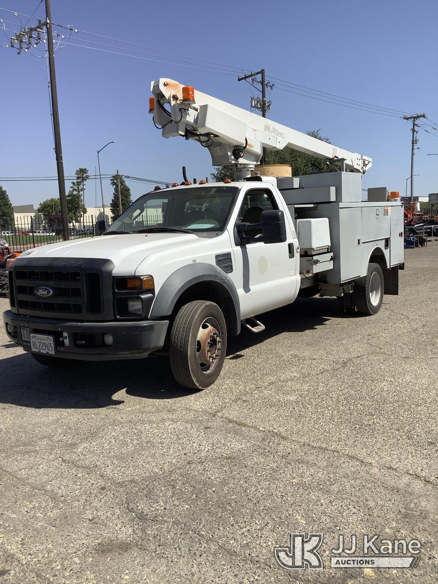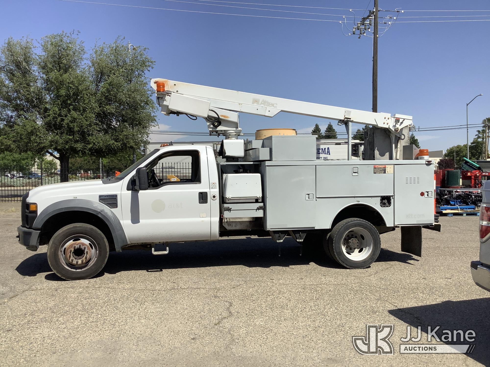 Altec AT200A, 35 ft, Telescopic Non-Insulated Bucket Truck s/n 0807BV13091, with single-man platform(non-insulated), mounted behind cab on 2008 Ford F-450 SD Service Truck, 10-cyl gas, 4X2, Auto, A/C, (142,147 miles) (Runs, Moves & Upper Operates) (Check Engine Light On, Minor Body Damage, ABS Light On, Rim Bent On Rear Drivers Side, Bucket Damaged, A/C Does Not Blow Cold Air) This is a Titled Item*