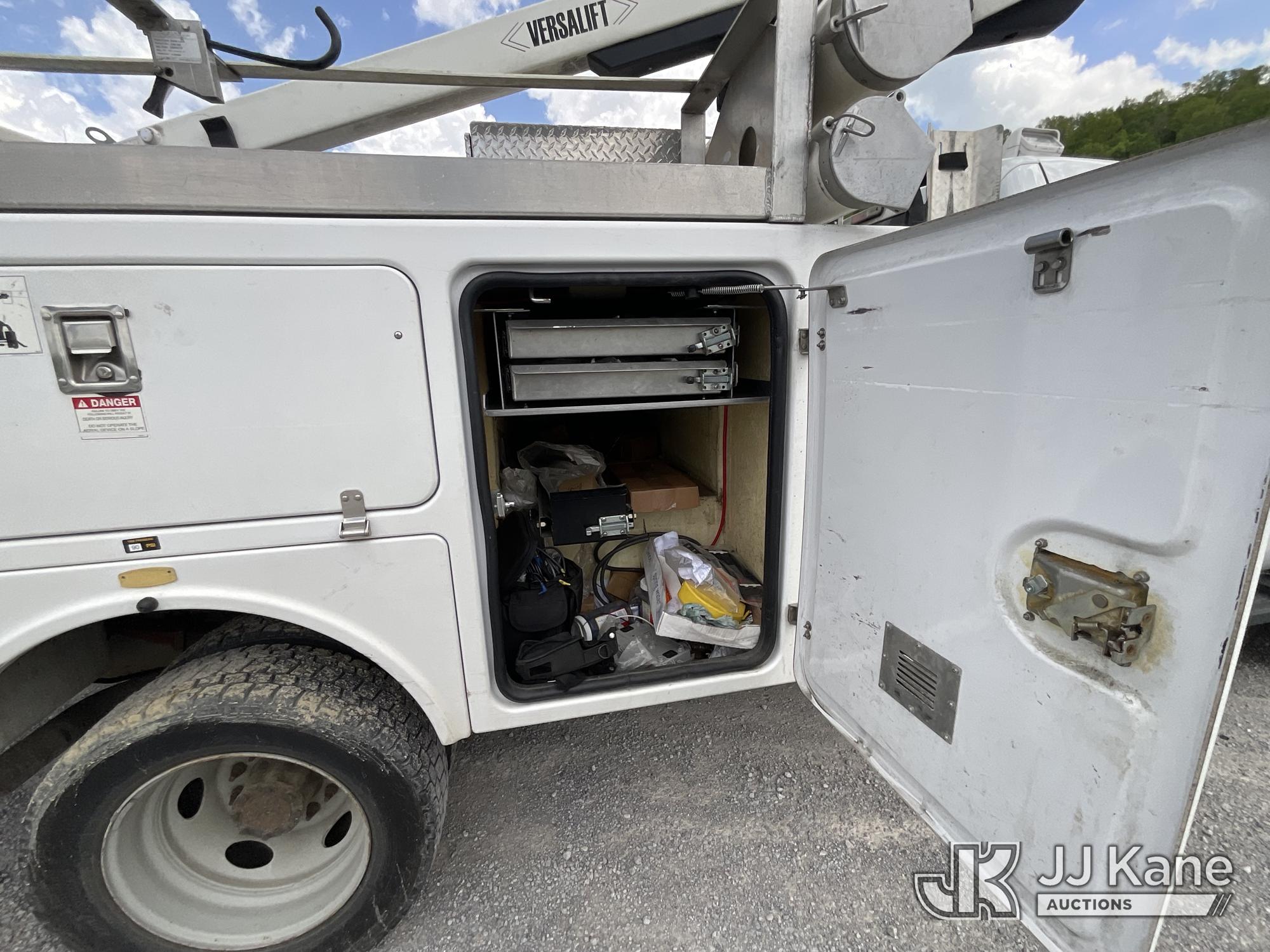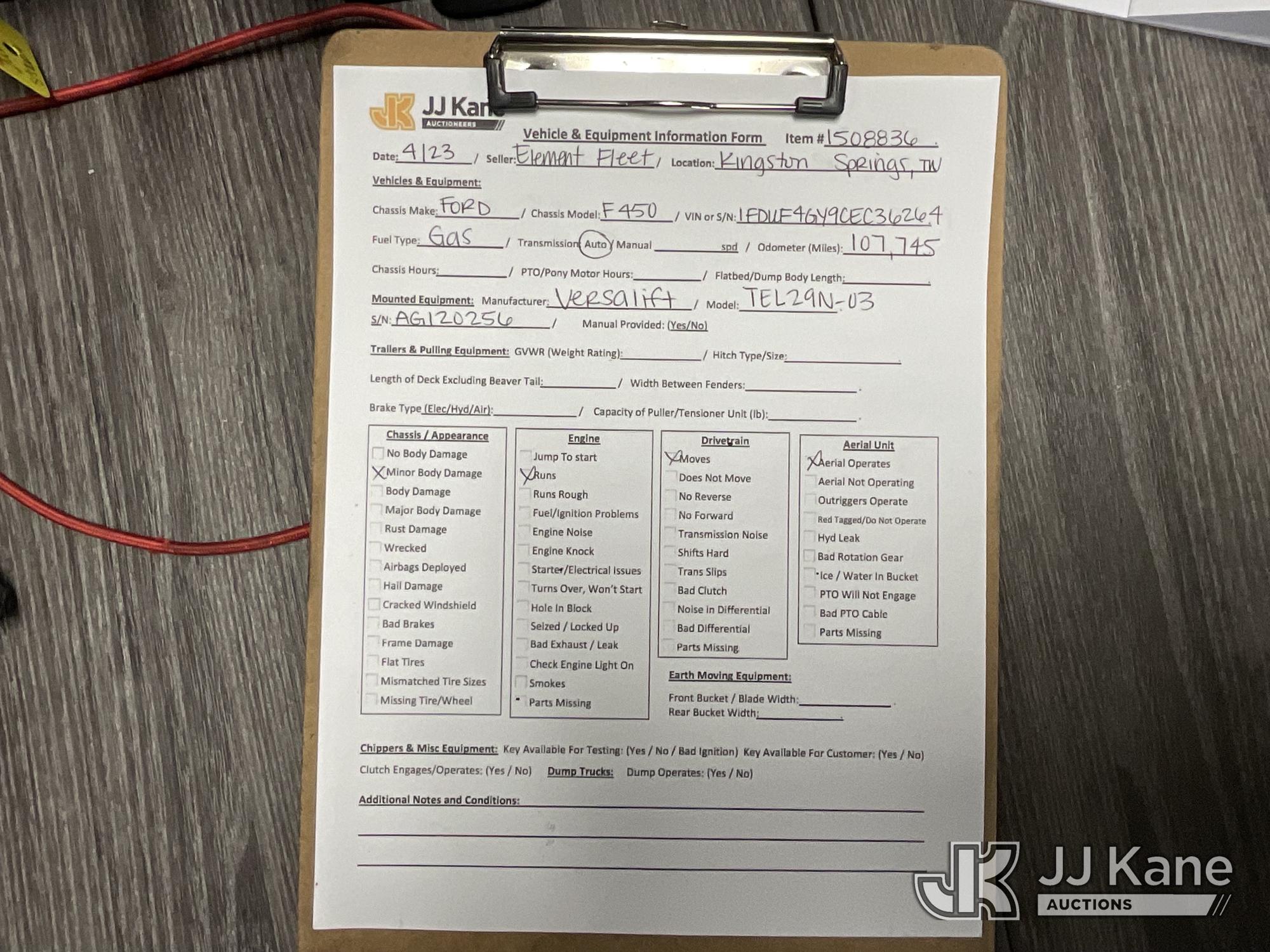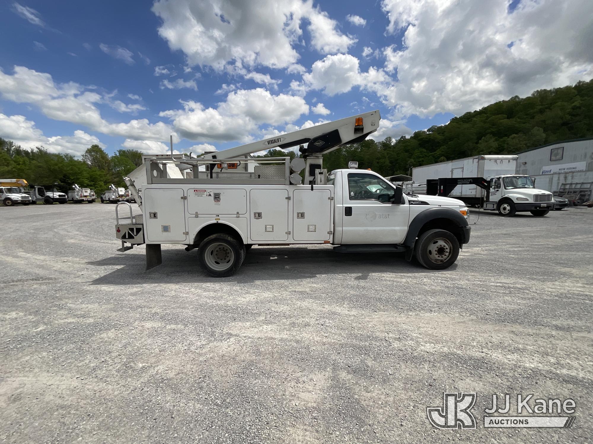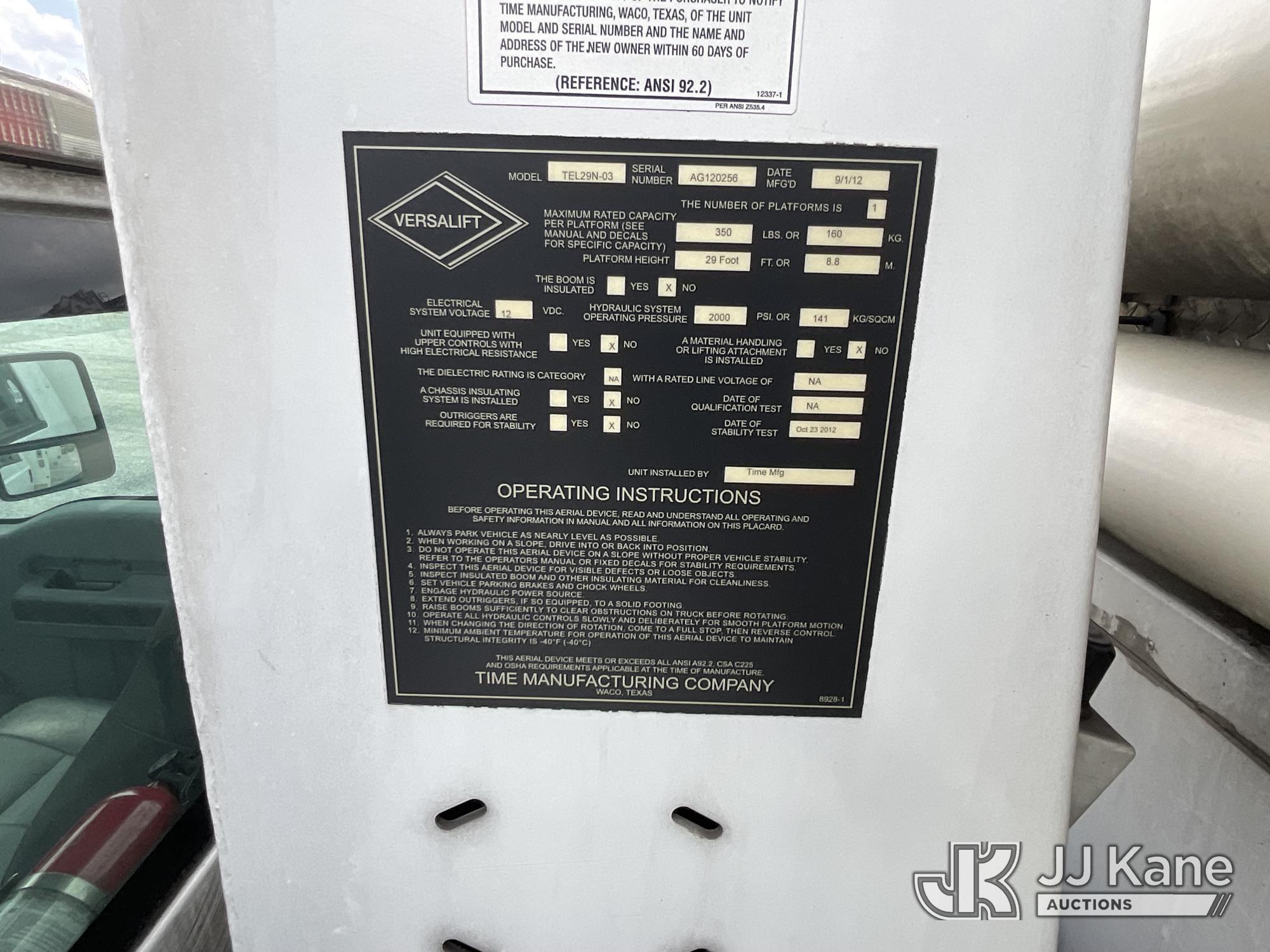 Versalift TEL29N-03, 34 ft, Telescopic Non-Insulated Bucket Truck s/n AG120256, with single-man bucket, mounted behind cab on 2012 Ford F450 Service Truck, 10-cyl gas, Auto, A/C, with Cummins/Onan generator, (107,745 miles) Element Lease Return (Runs, Moves & Upper Operates) (Body Damage) This is a Titled Item*