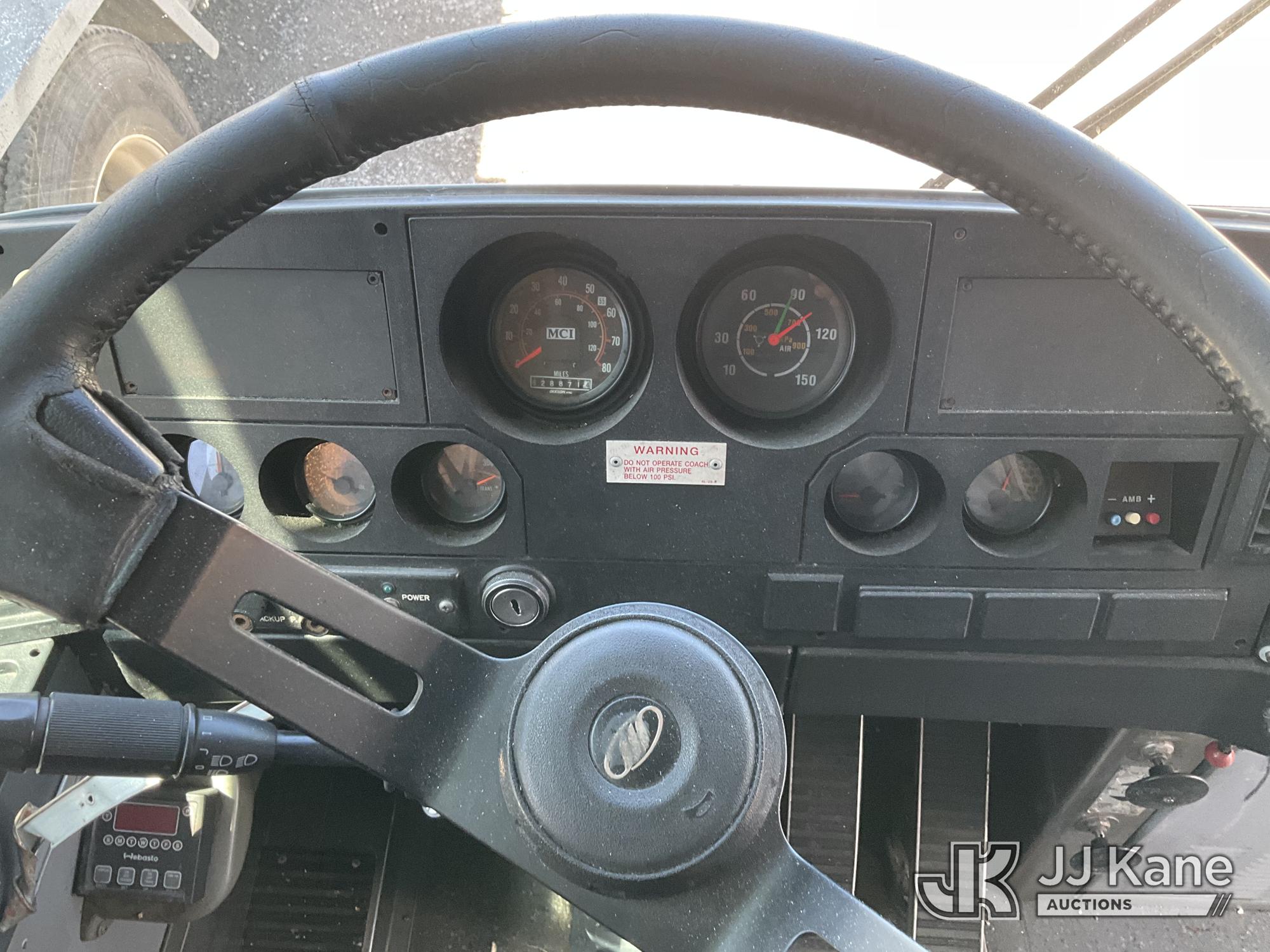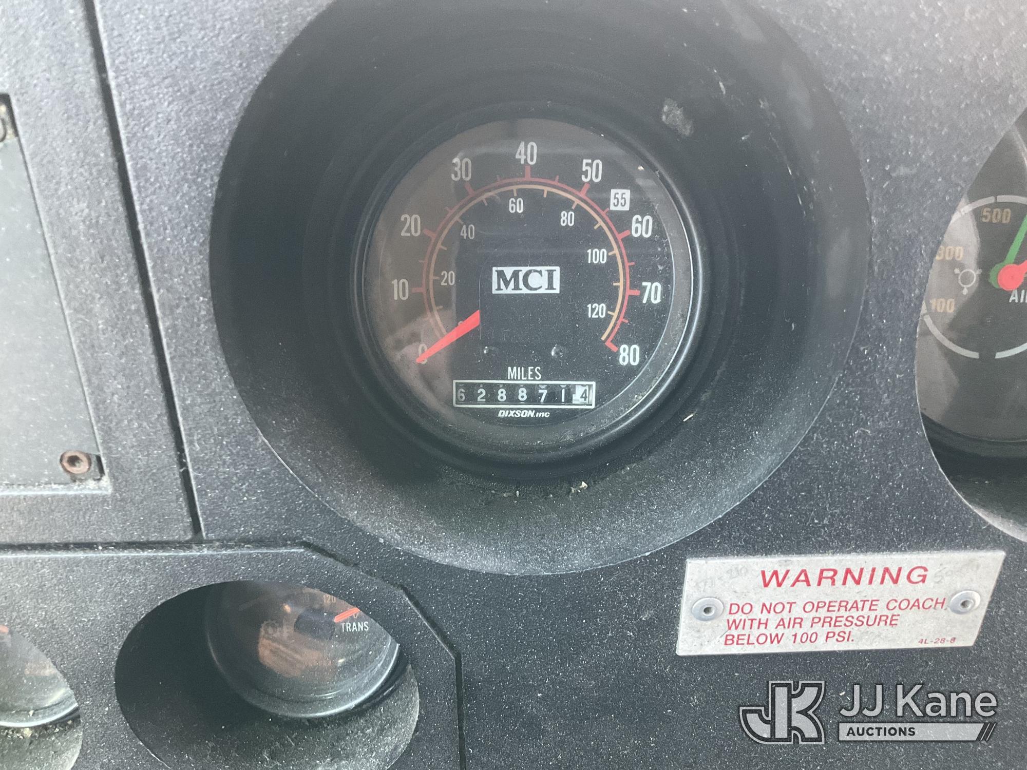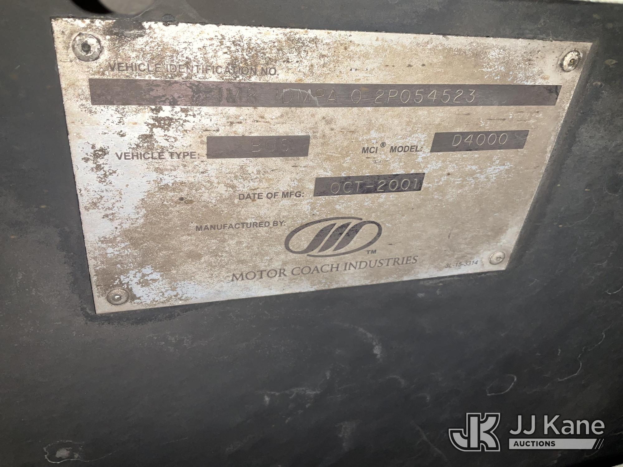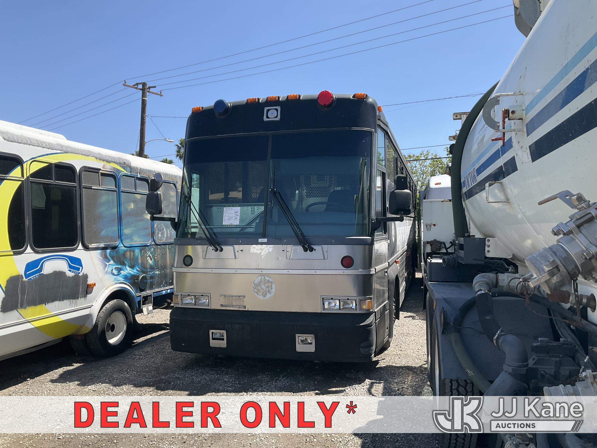 2002 MCI 102D3 I3TV Bus, s/n 1M81DMPA02P054523, 12.7L L6 diesel, Auto, (Exempt from Odometer Disclosure - Reads 628,871 miles) (Not Running, Condition Unknown) No Keys, Door To Rear Is Locked, Rear Axel Is Leaking ) (Branded Title - Police Vehicle) (Bidding Restricted to Licensed Vehicle Dealers Only), Subject to CARB Regs,CARB non Compliant,Cannot Operate on CA Roads/Highways until Compliant This is a Titled Item*