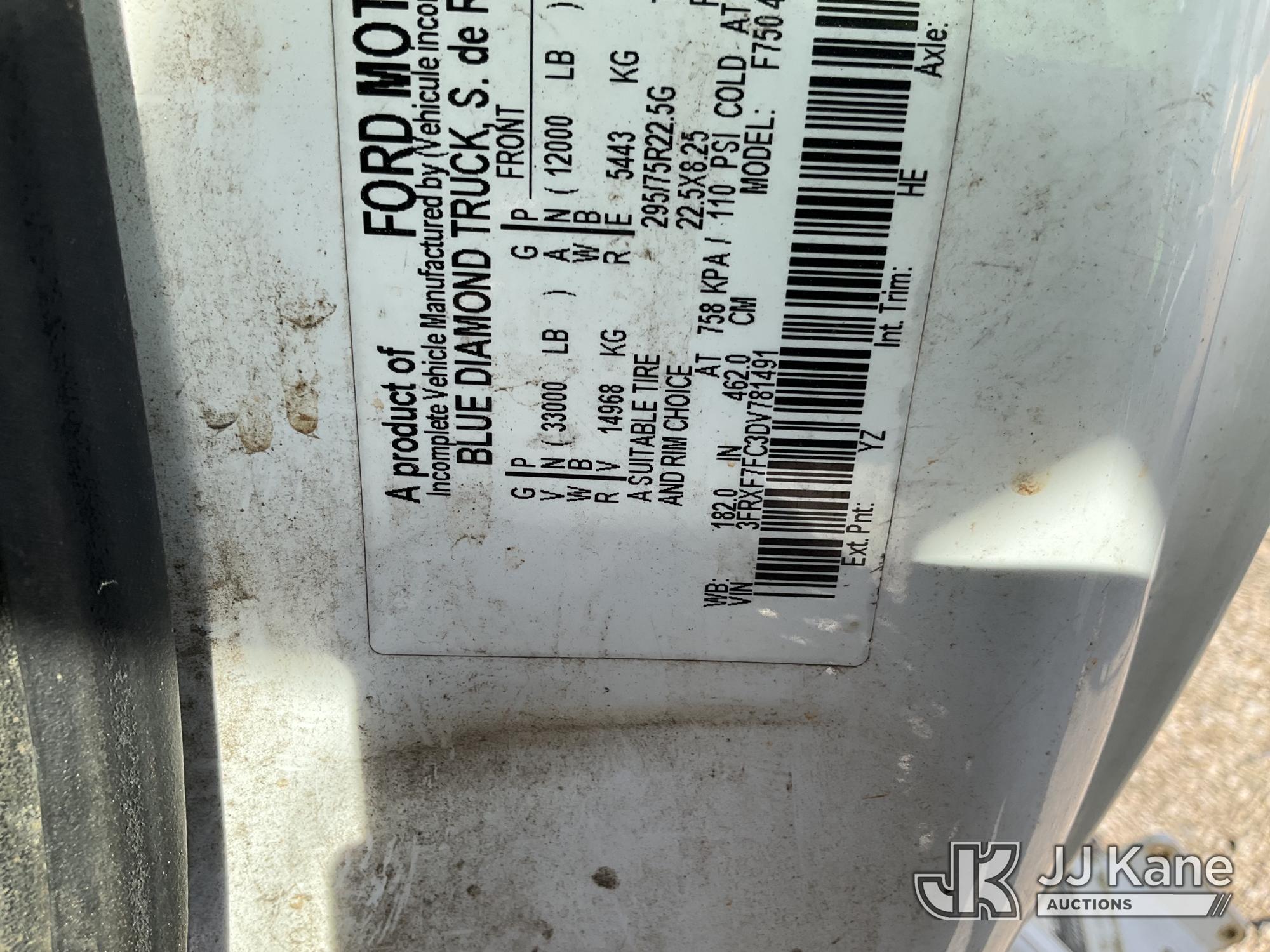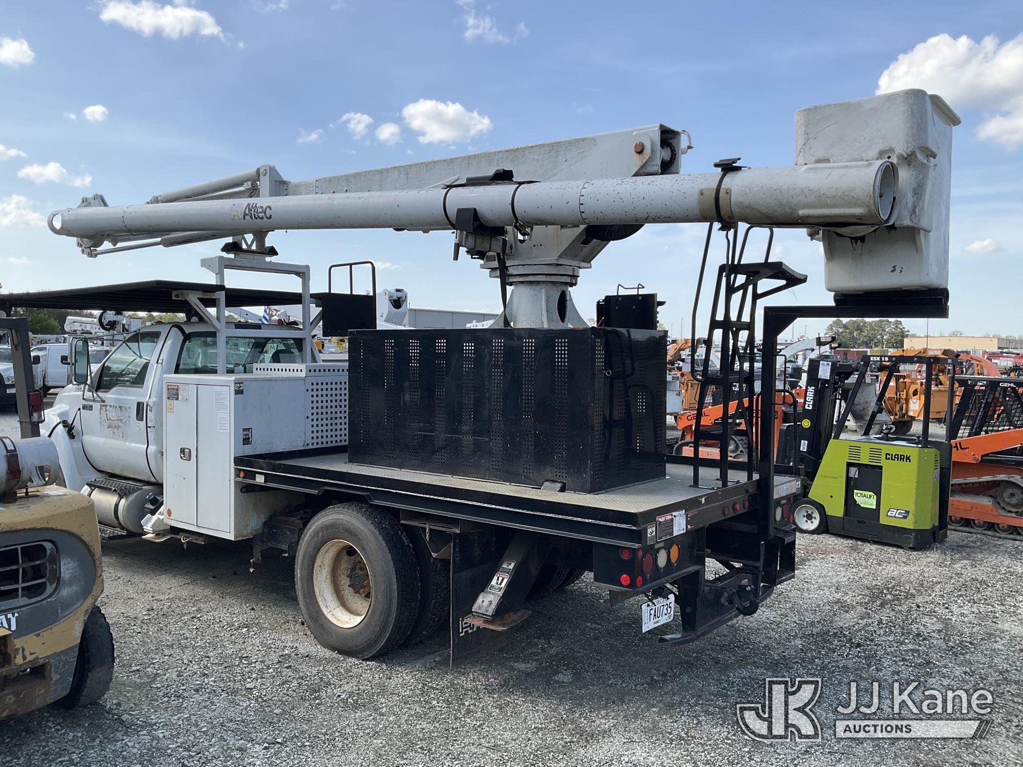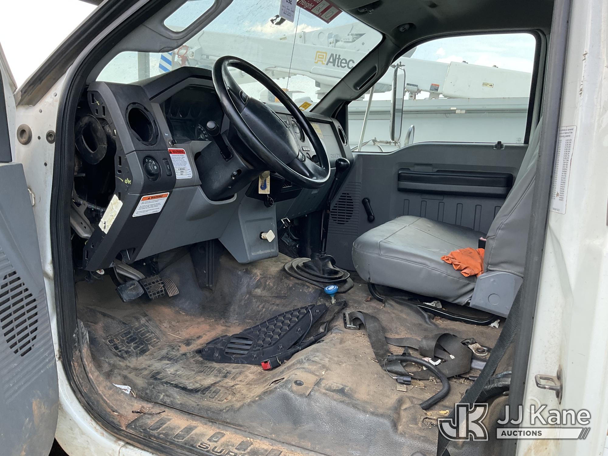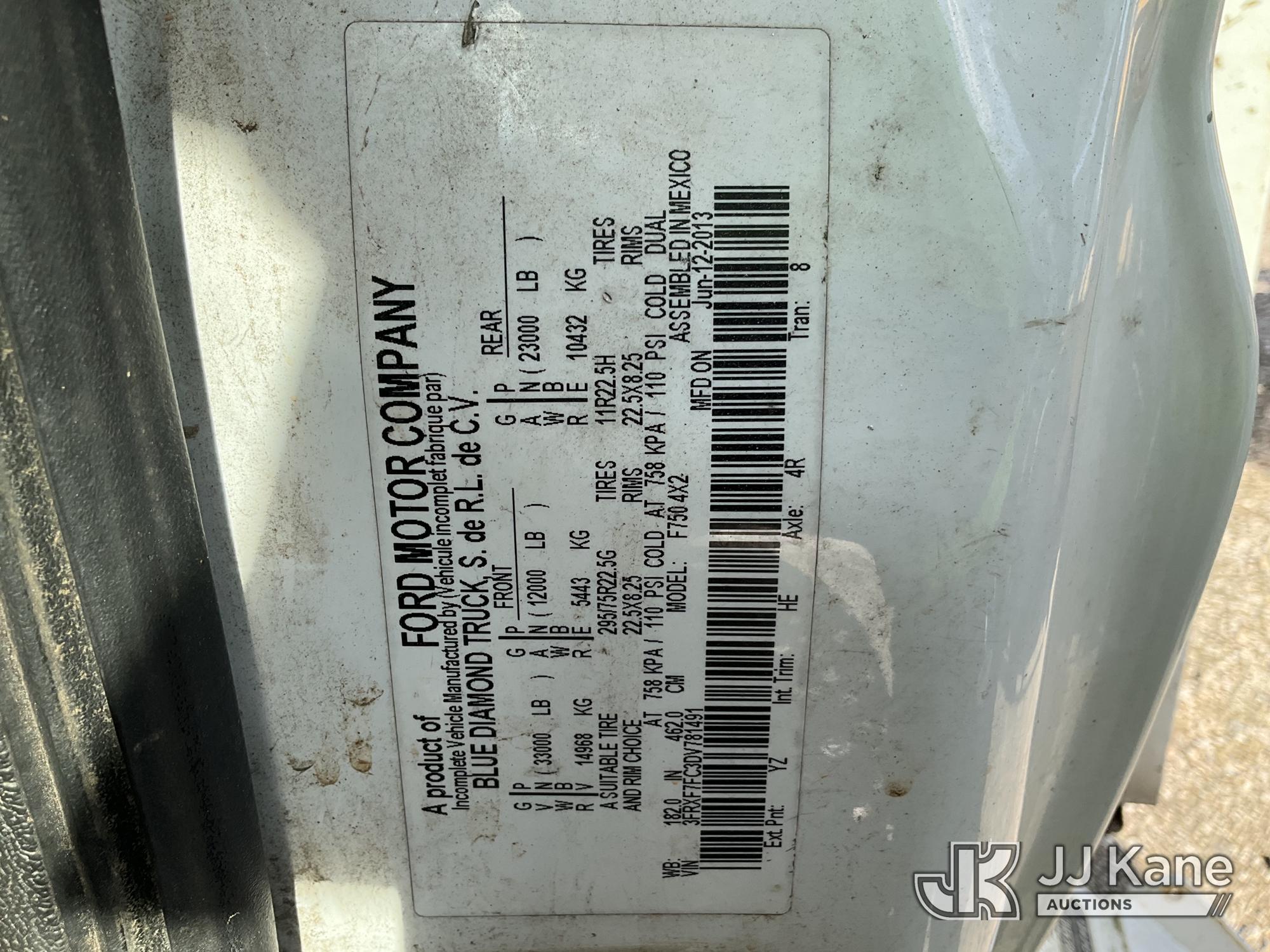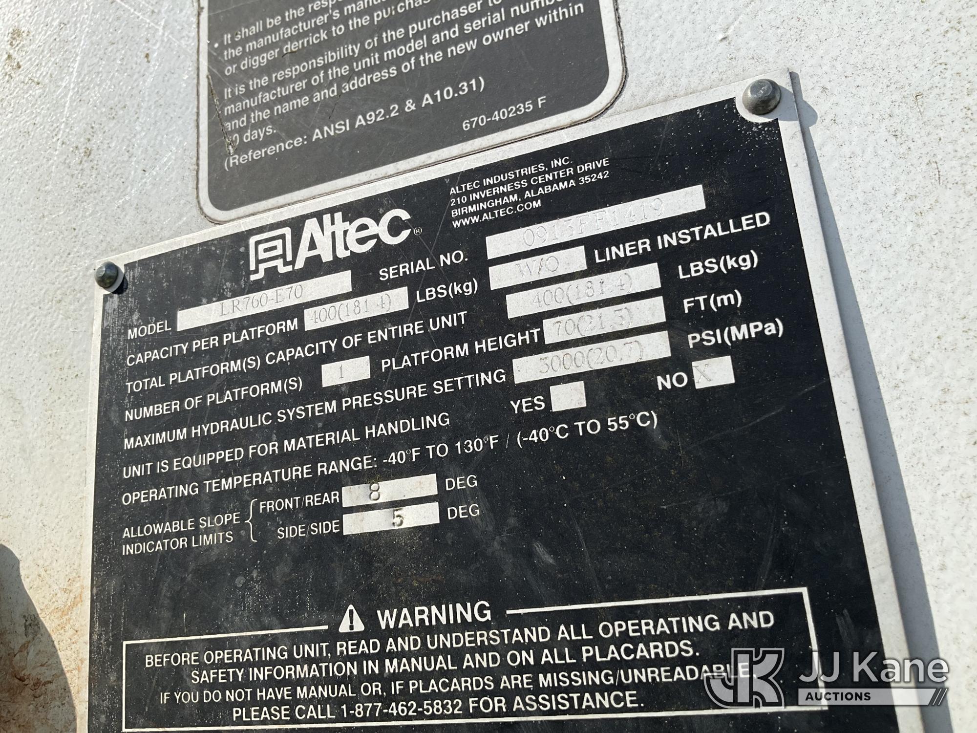 Altec LR760-E70, 75 ft, Over-Center Elevator Bucket Truck s/n 0913FF1419, with single-man bucket & 4 hyd outriggers, rear mounted on 2013 Ford F750 Flatbed/Utility Truck, 6.7L diesel, 6-spd, A/C, (63,055 miles) (Not Running, Condition Unknown, No Driver's Seat, Upper Condition Unknown) (Seller States: this item has been removed from service due to the listed safety repairs that were not completed. The safety items below must be completed by an approved OEM facility before the unit can return to service: REPLACE THE BOOM DRUM PIN, BEARINGS, THRUST WASHERS, AND RETAINING RINGS AT THE BOOM ELBOW, REPLACE THE DAMAGED PLATFORM, COMPLETE ANSI INSPECTION; COMPLETE ANY REQUIRED TESTING AND REPAIRS AFTER INSPECTIONS ARE COMPLETED) (Bidding Restricted to Licensed Vehicle Dealers Only), This is a Titled Item*