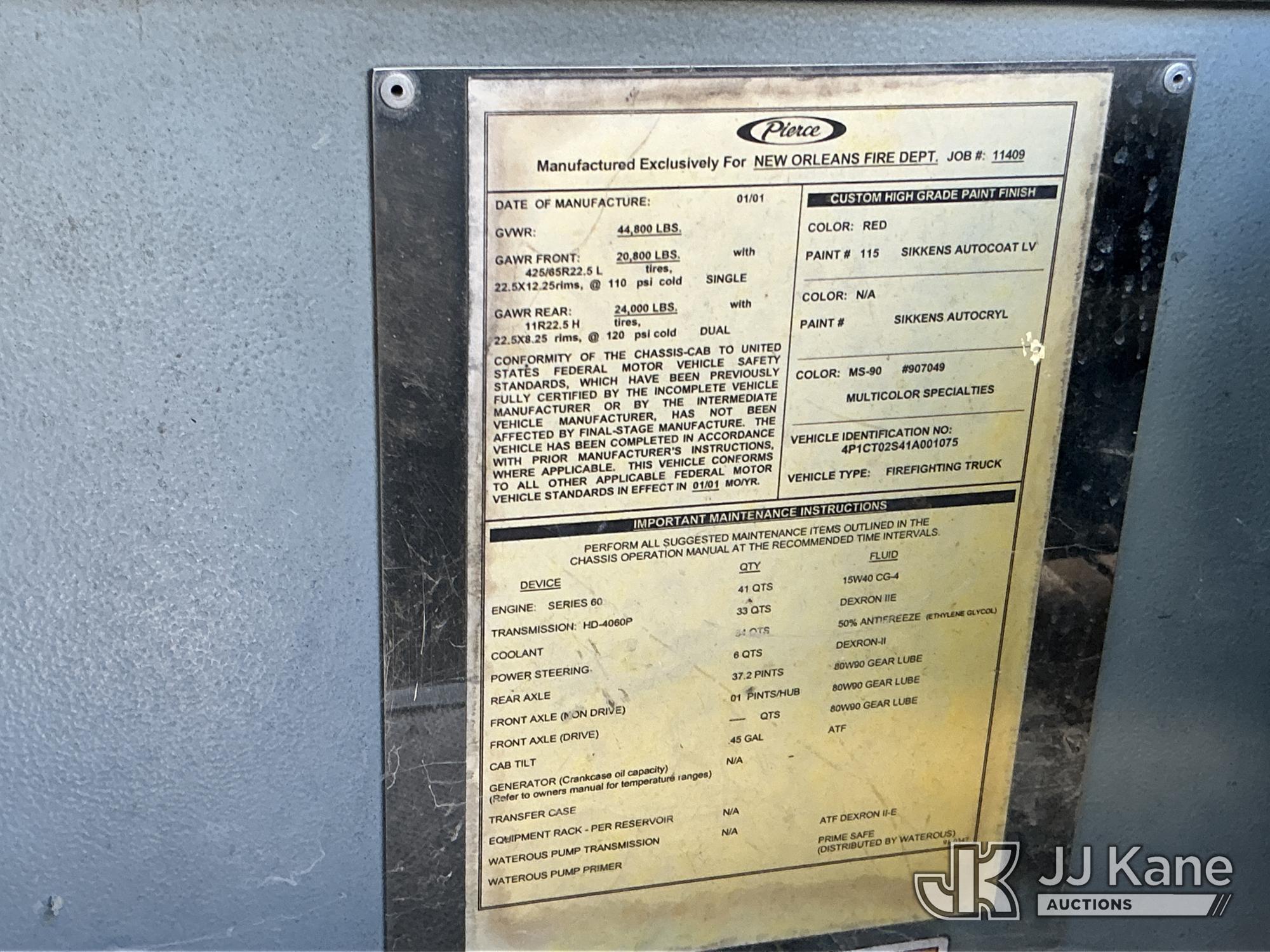 2001 Pierce Model Tilt Cab Fire Truck, 12.7L diesel, Auto, True Mileage Unknown (Not Running, Condition Unknown) This is a Titled Item*