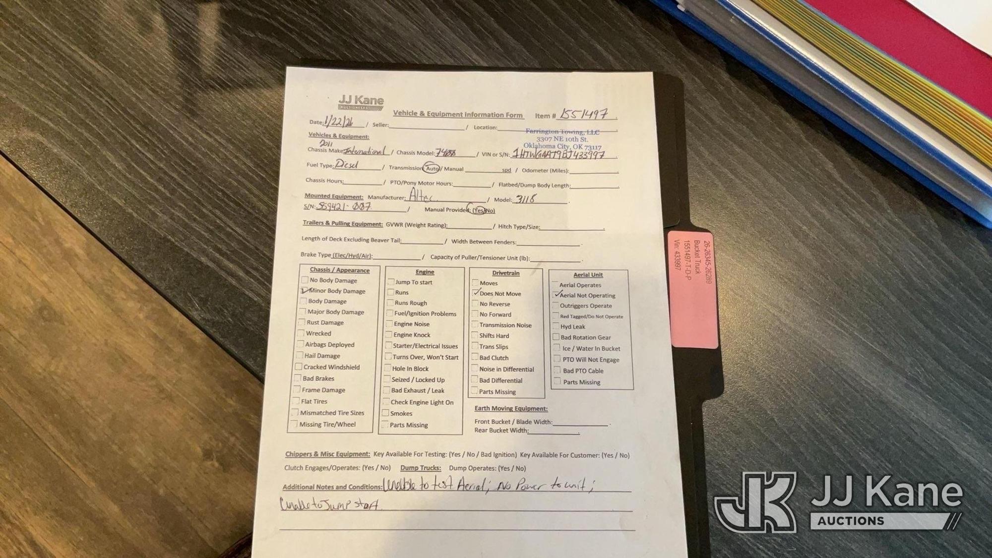 Altec D4065A-TR, 29,310 Lb Digger Derrick s/n 0111-DF0374, with 65 ft sheave height, 2 spd digger, heel winch, pole grabs & riding console, corner mounted on 2011 International 7400 T/A T/A Utility Truck, 7.6L L6 DIESEL 6X4, Auto, A/C, True Mileage Unknown (Not Running) (No Power To Unit, Conditions Unknown, Mileage Unknown) This is a Titled Item*