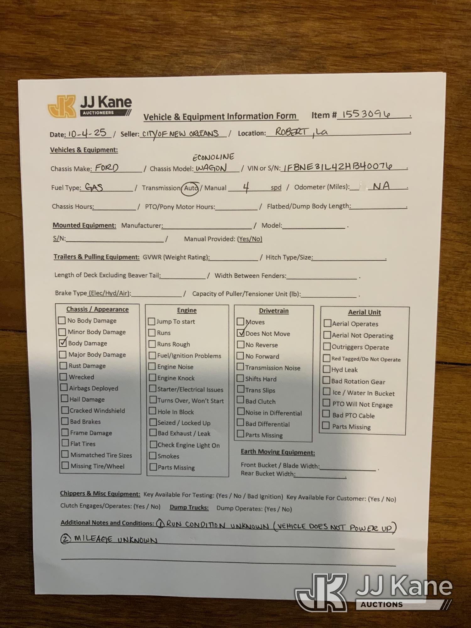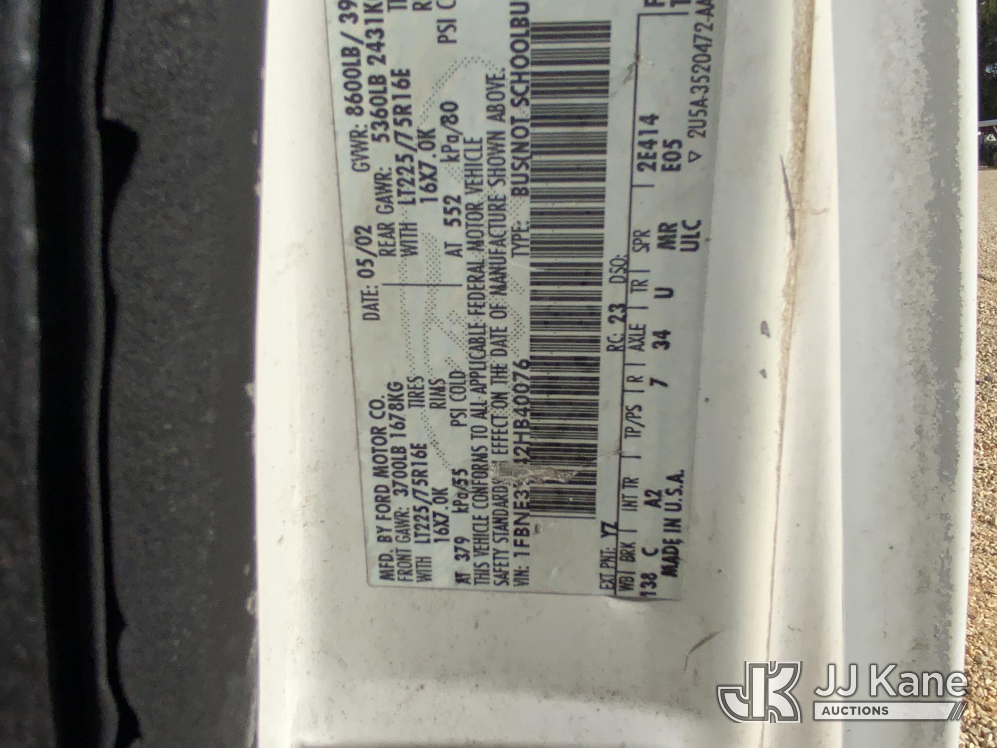 2002 Ford E350 Passenger Van, 8-cyl gas, RWD, 4-Speed Automatic, A/C, True Mileage Unknown (Not Running, Condition Unknown) (Body/Paint Damage) This is a Titled Item*