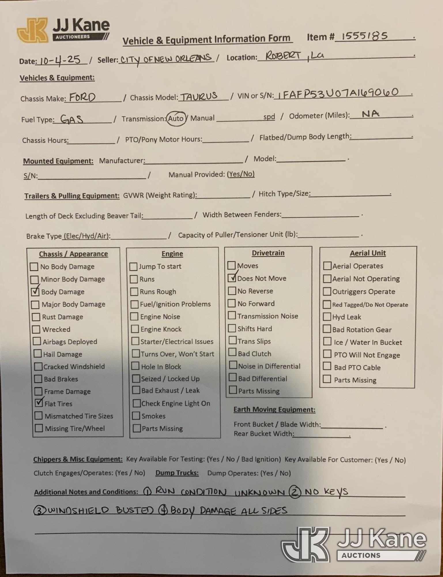 2007 Ford Taurus 4-Door Sedan, 6-cyl gas, Auto, A/C, True Mileage Unknown (Not Running, Condition Unknown, No keys, Windshield Busted, Body/Paint Damage) This is a Titled Item*