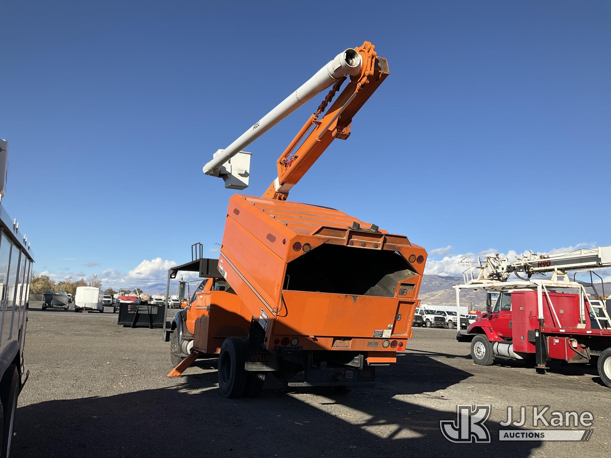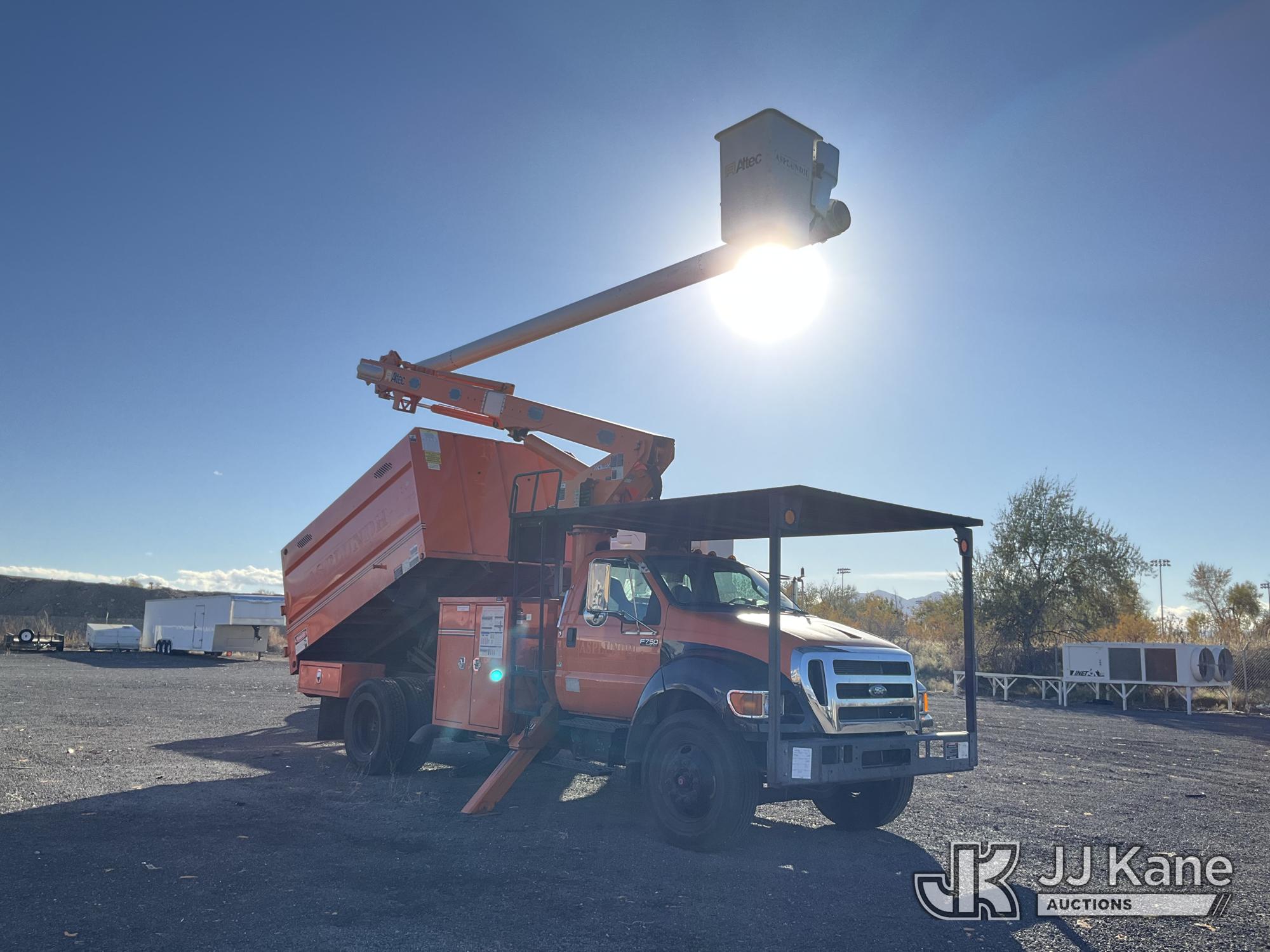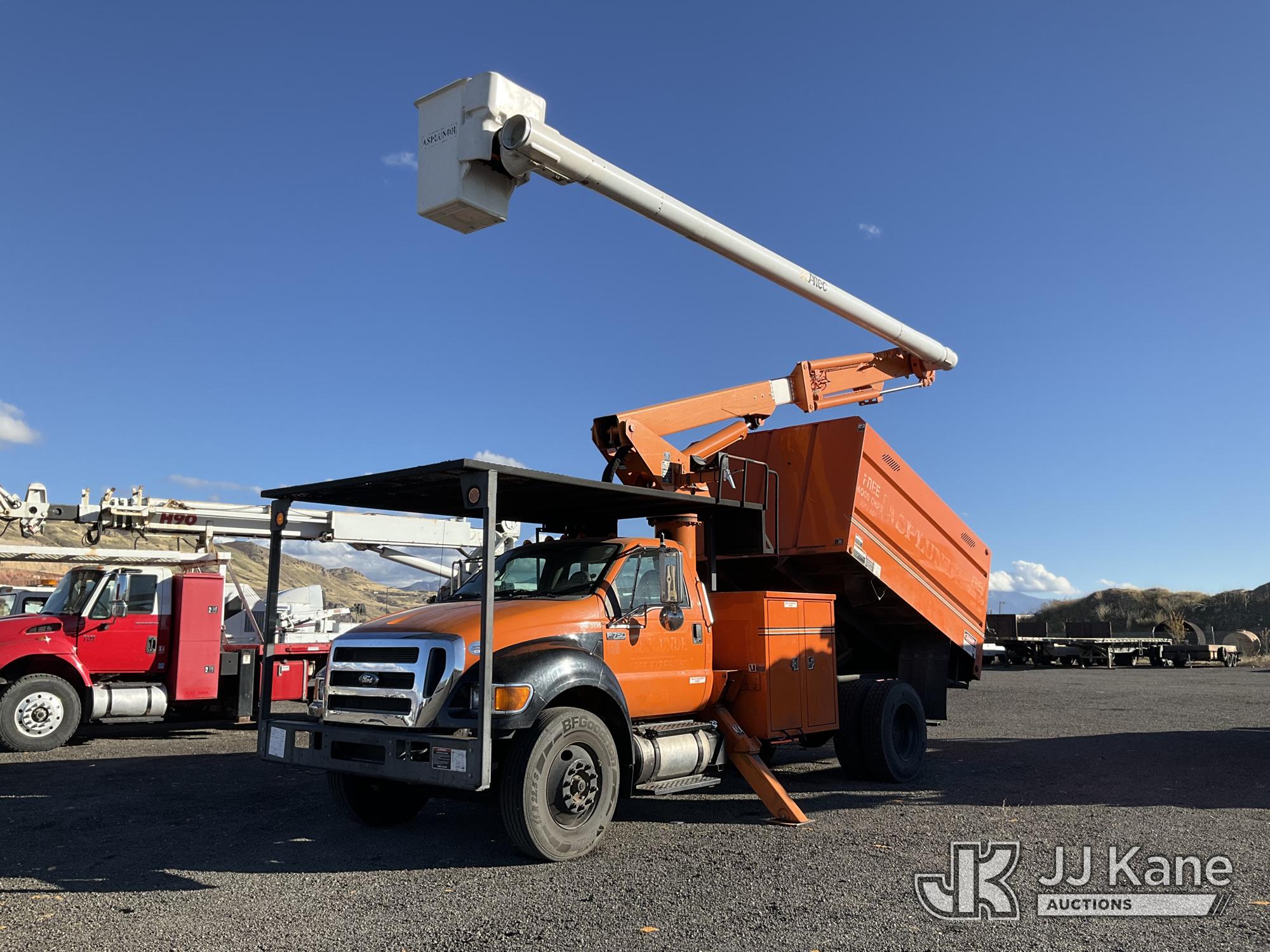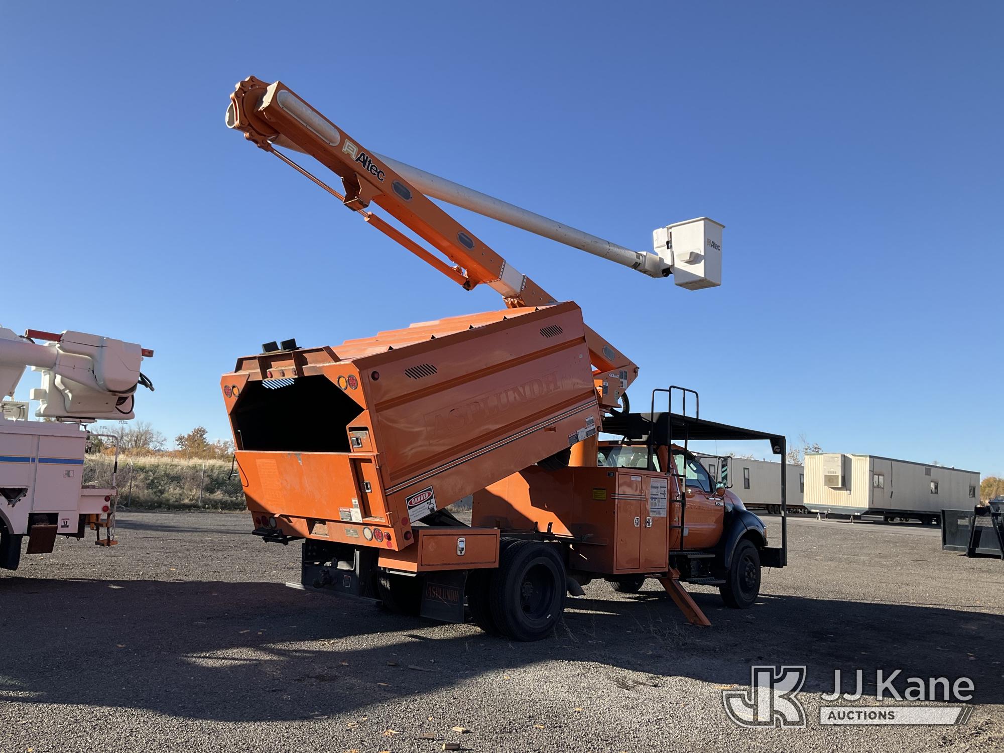 Altec LR756, 61 ft, Over Center Bucket Truck s/n 0614FF2460, with single man bucket & 2 hyd outriggers, mounted behind cab on 2013 Ford F750 Chipper Dump Truck, Cummins 6.7L diesel, 6-spd, (33,977 miles) (Runs, Upper Unit & Dump Operate) (Does Not Move, Driveline Removed, Smokes When On - Wiring Issues - Water Pump Leaks, Check Engine Light On) This is a Titled Item*