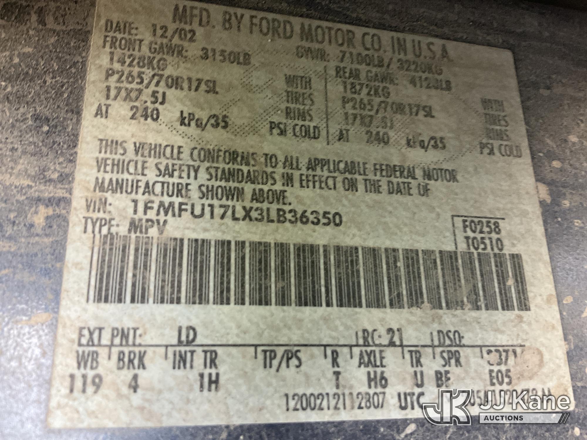 2003 Ford Expedition 4-Door Sport Utility Vehicle, 5.4L V8 SOHC 16V gas, RWD, 4-Speed Automatic, A/C, (Exempt from Odometer Disclosure - Reads 216,227 miles) (Runs & Moves) (RED TAG: NO BRAKES) This is a Titled Item*