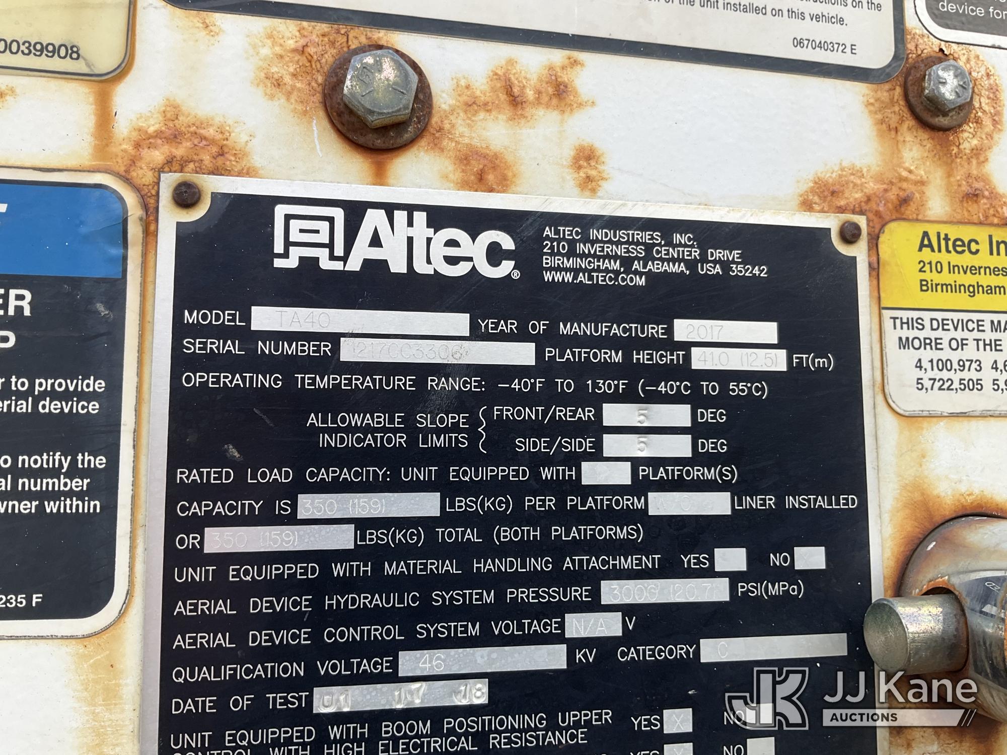 Altec TA40, 46 ft, Articulating & Telescopic Bucket Truck s/n 1217CC3306, with Single-Man Bucket, mounted behind cab on 2018 Freightliner M2 106 Utility Truck, Cummins 6.7L diesel, Auto, A/C, (172,814 miles) (Runs, Moves & Upper Operates) (Reads 11,557 hours) This is a Titled Item*