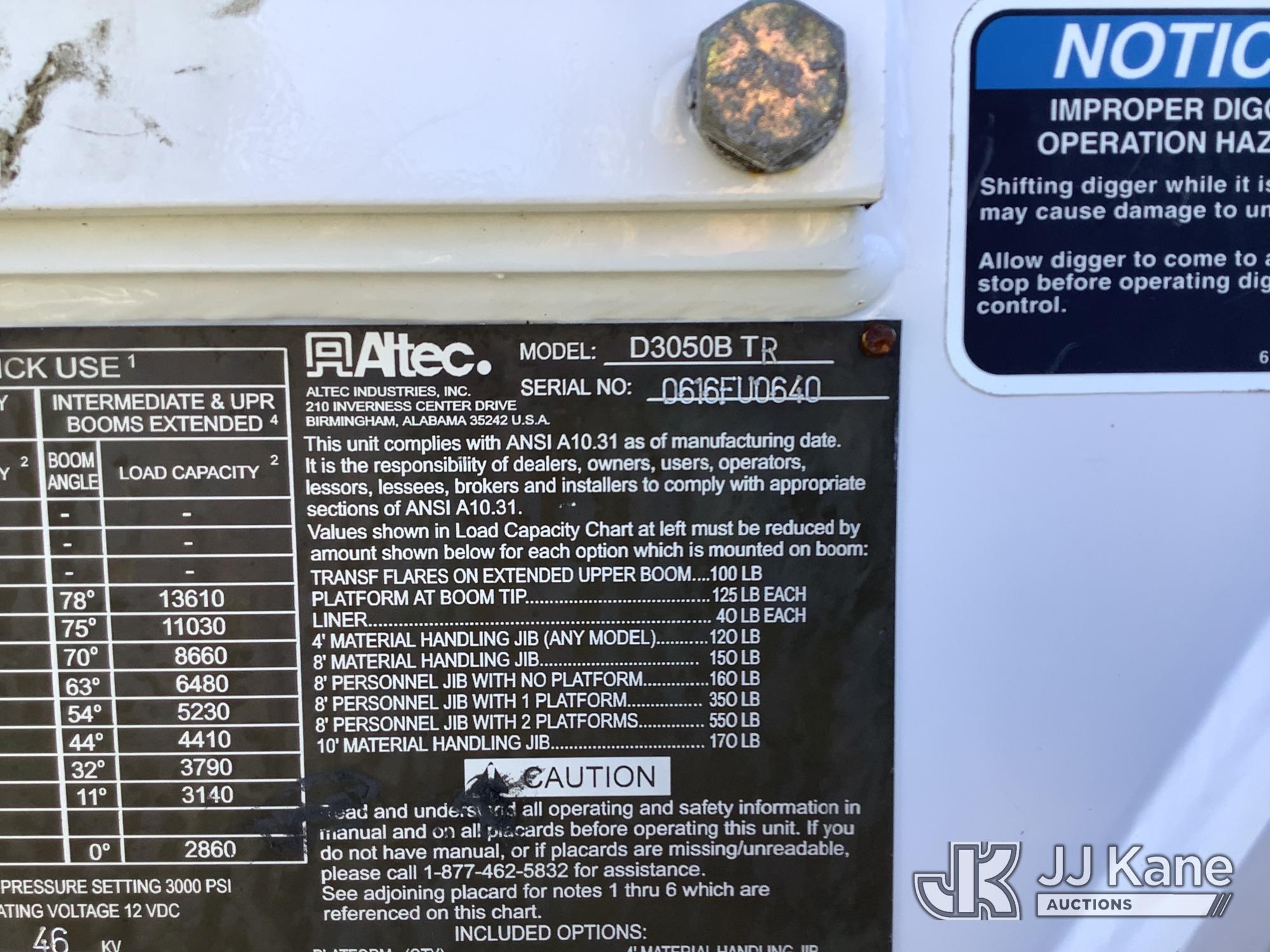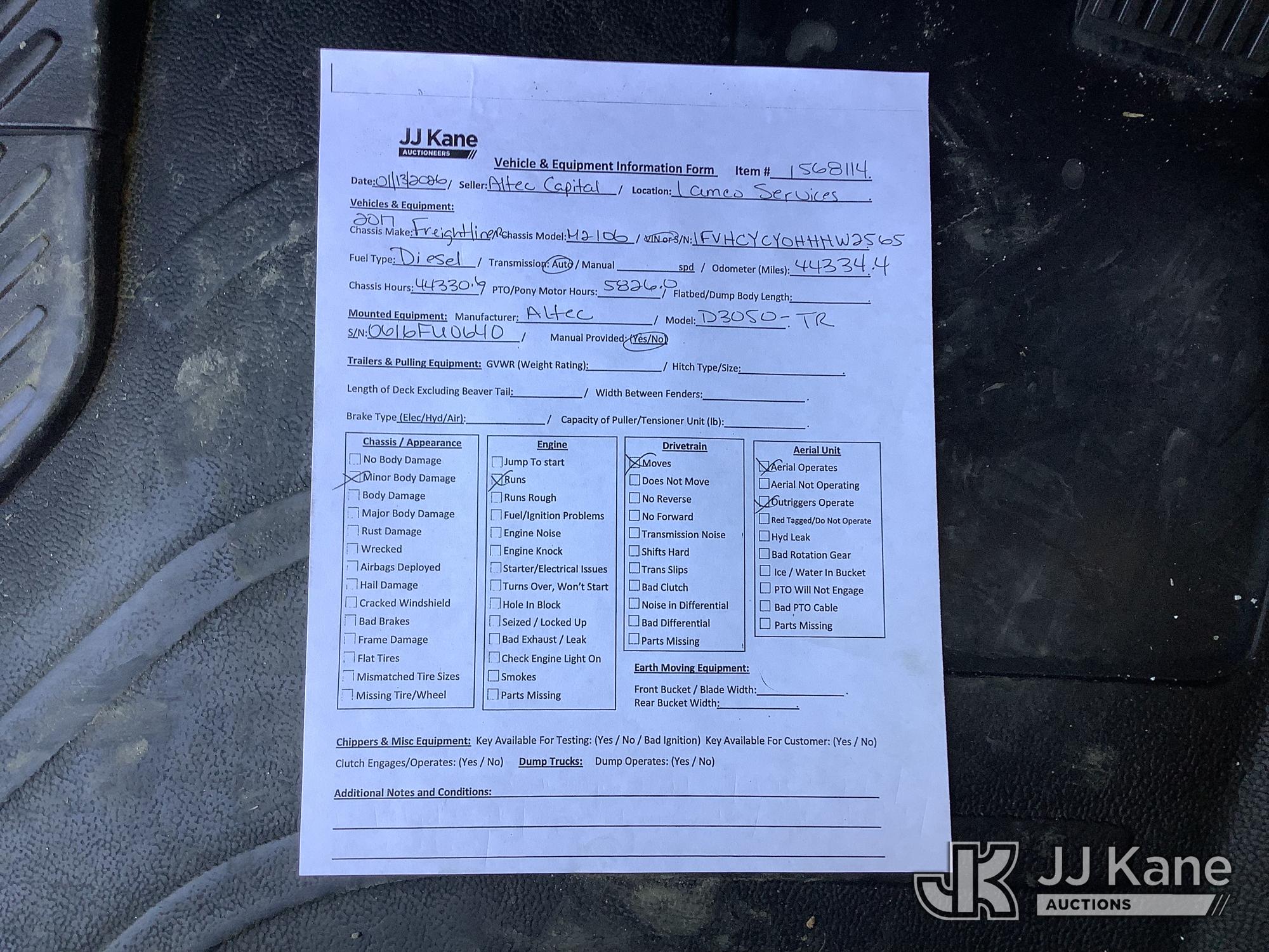 Altec D3050-TR, 30,000 Lb Digger Derrick s/n 0616FU0640, with 50 ft sheave height, 2-spd digger, pole gabs, heel winch, riding console, 4 hydraulic outriggers & remote, rear mounted on 2017 Freightliner M2 106 T/A Utility Truck, Cummins ISL 8.9L Diesel Auto, A/C, with rear winch, (044,334 miles) (Runs, Moves & Upper Operates) (Body Damage) This is a Titled Item*