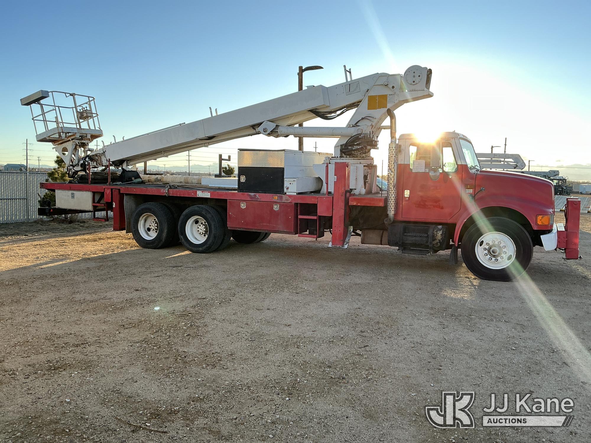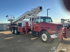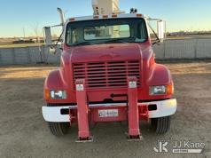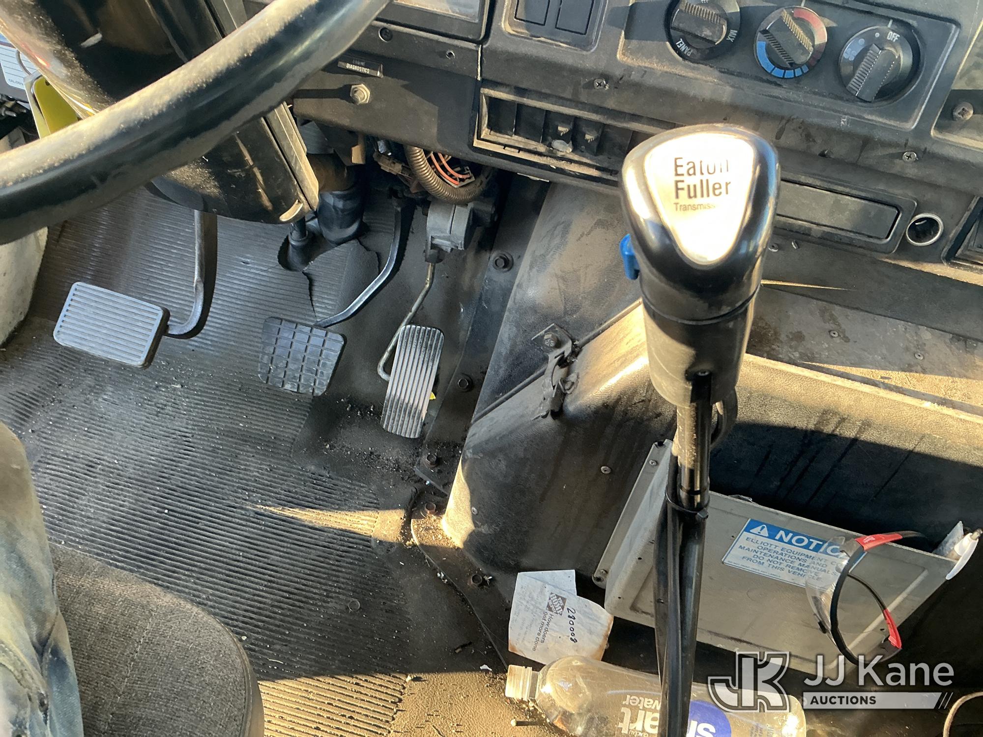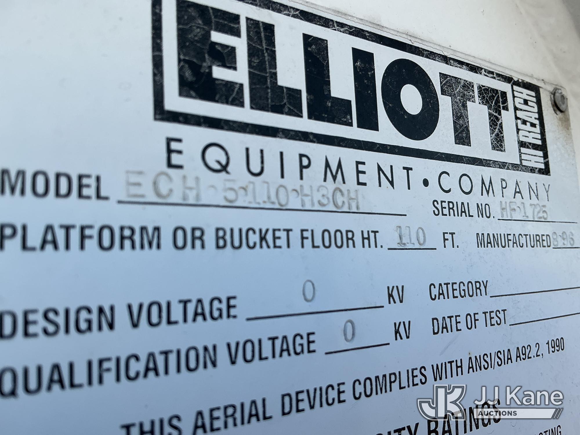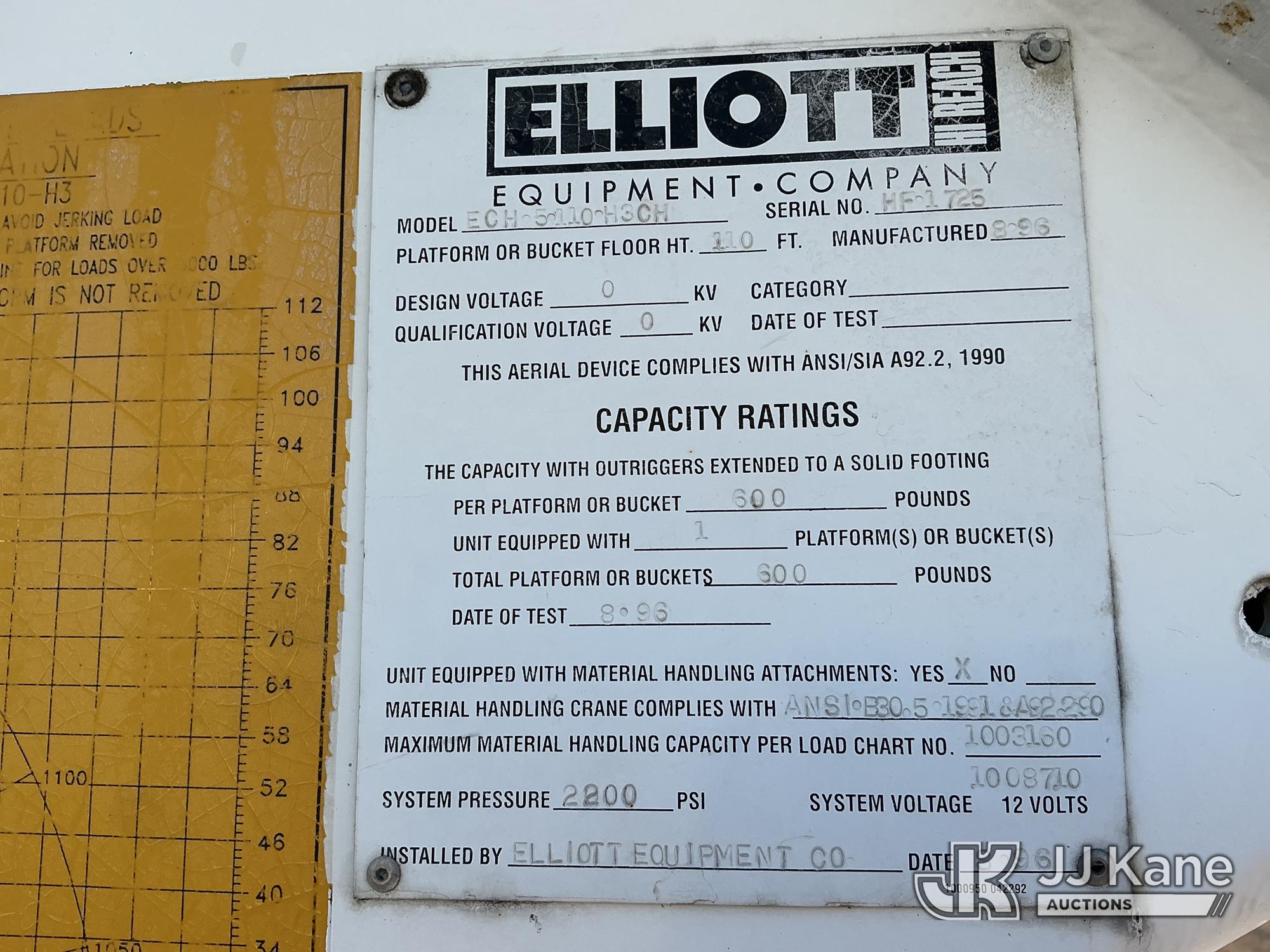 Elliott ECH-5-110-HC3H, 110 ft, Sign Crane Platform Lift s/n HF1725, with single man platform, mounted behind cab on 1996 International 4900 T/A Flatbed/Utility Truck, 8.7L diesel, 6X4, 8-spd w/ Lo-Lo, A/C, (Exempt from Odometer Disclosure - Reads 110,812 miles) (**Dealer Only**Runs & Moves) (Does Not Operate, Drivers Side Rear Outrigger Falls, Engine Rattle, Headlights Do Not Operate, Requires Cool Down After Stall) (No Emissions Provided, See Bidder Agreement) (Non Drive Away Removal Only: Safety Inspect An Altec inspection of the unit identified above has determined that the unit cannot be safely operated without completion of significant repairs. The unit has been removed from service until these repairs are accomplished. Serious injury or death can result for any attempt to operate the unit without the benefit of these repairs. Altec has recorded the out of service status of the unit. Until Altec has been notified, in writing, that the required repairs have been performed, or Altec performs the repairs, further service work, technical support, and part sales by Altec may be limited on this unit.) (Bidding Restricted to Licensed Vehicle Dealers Only), This is a Titled Item*