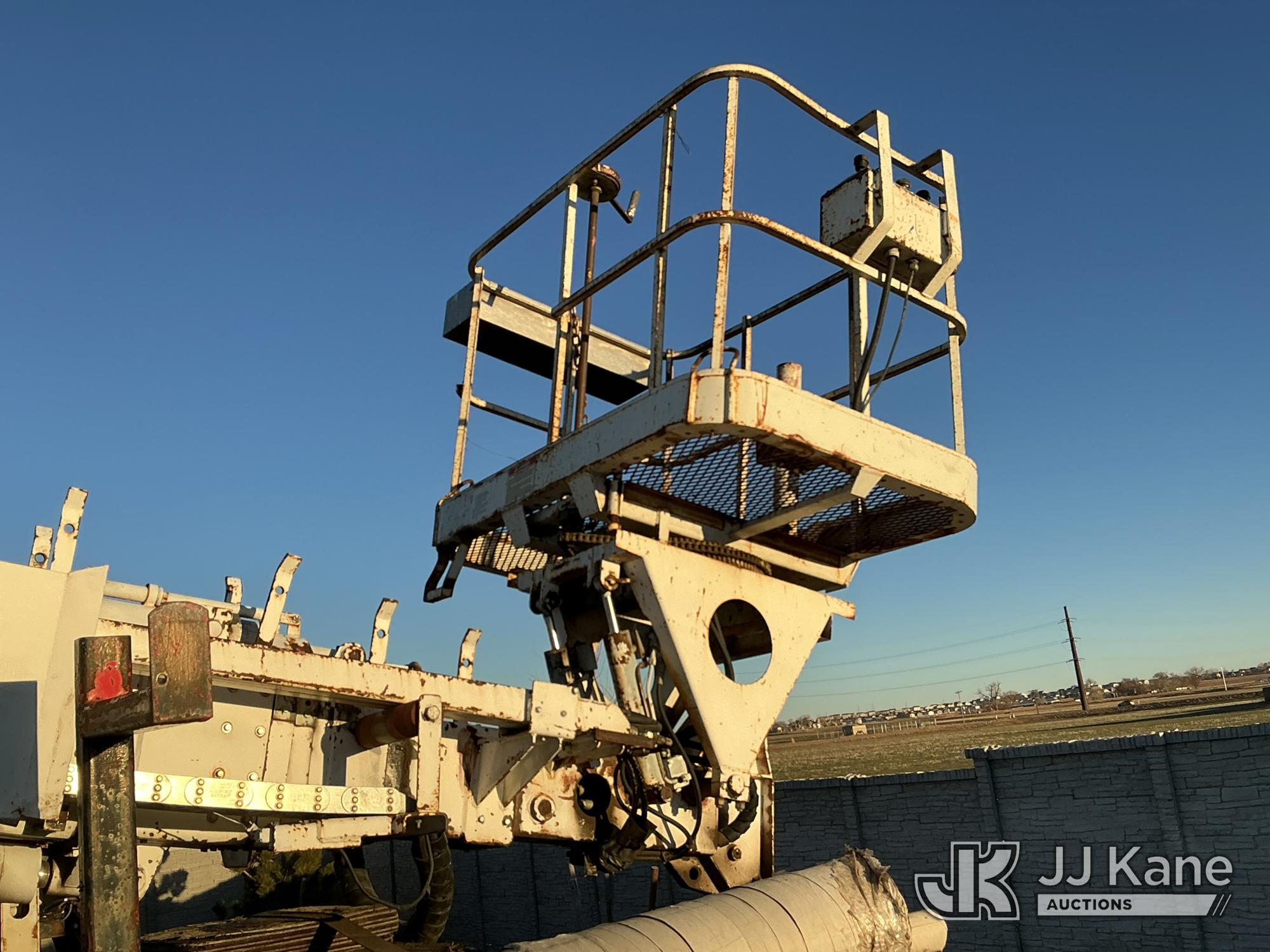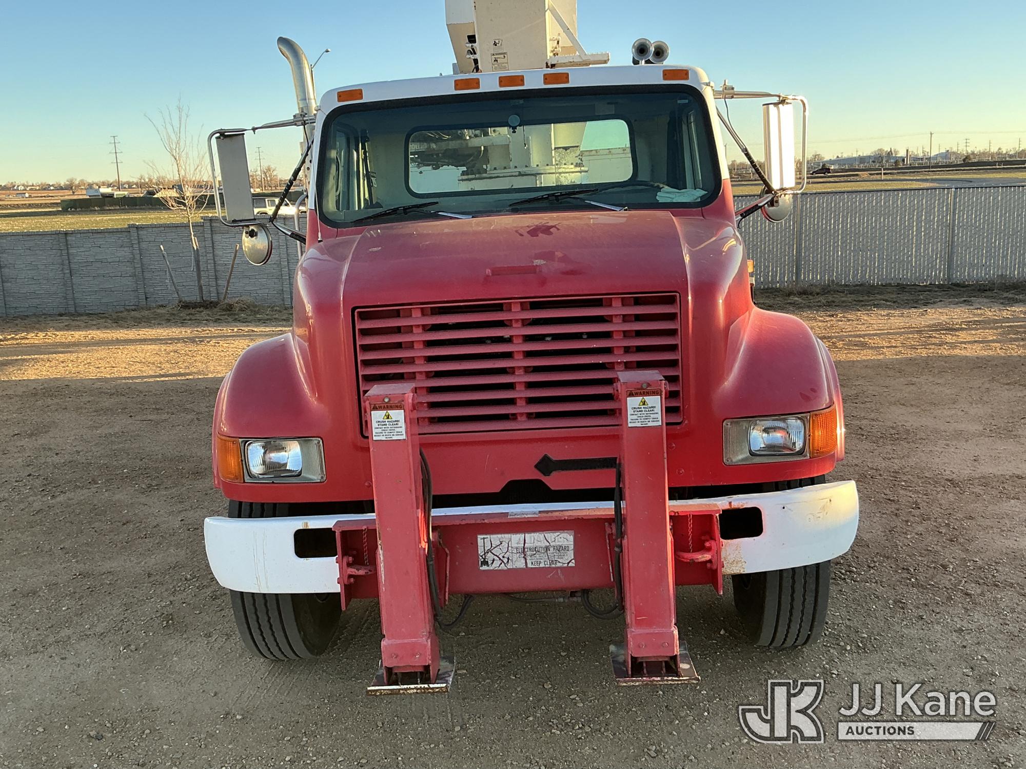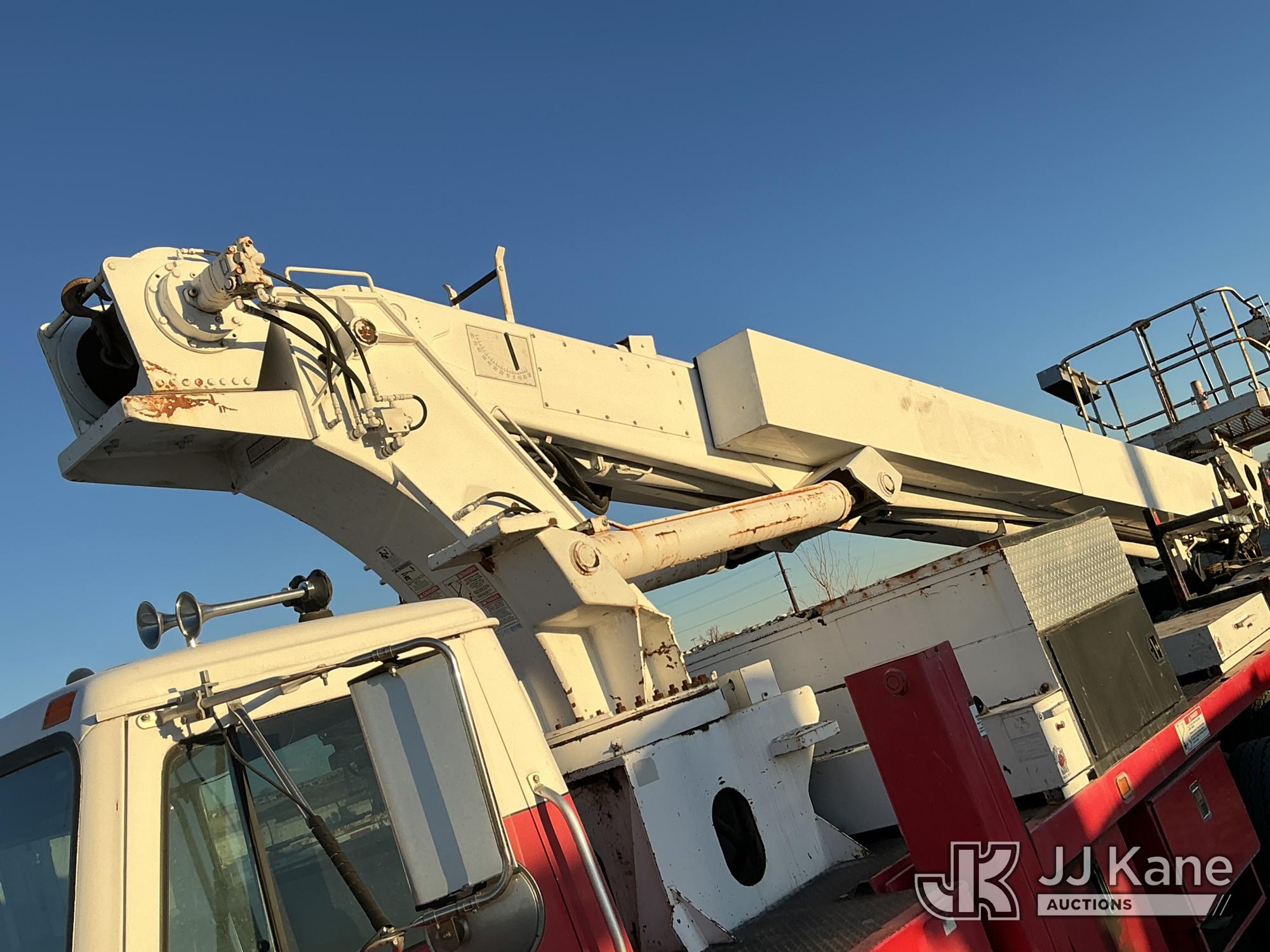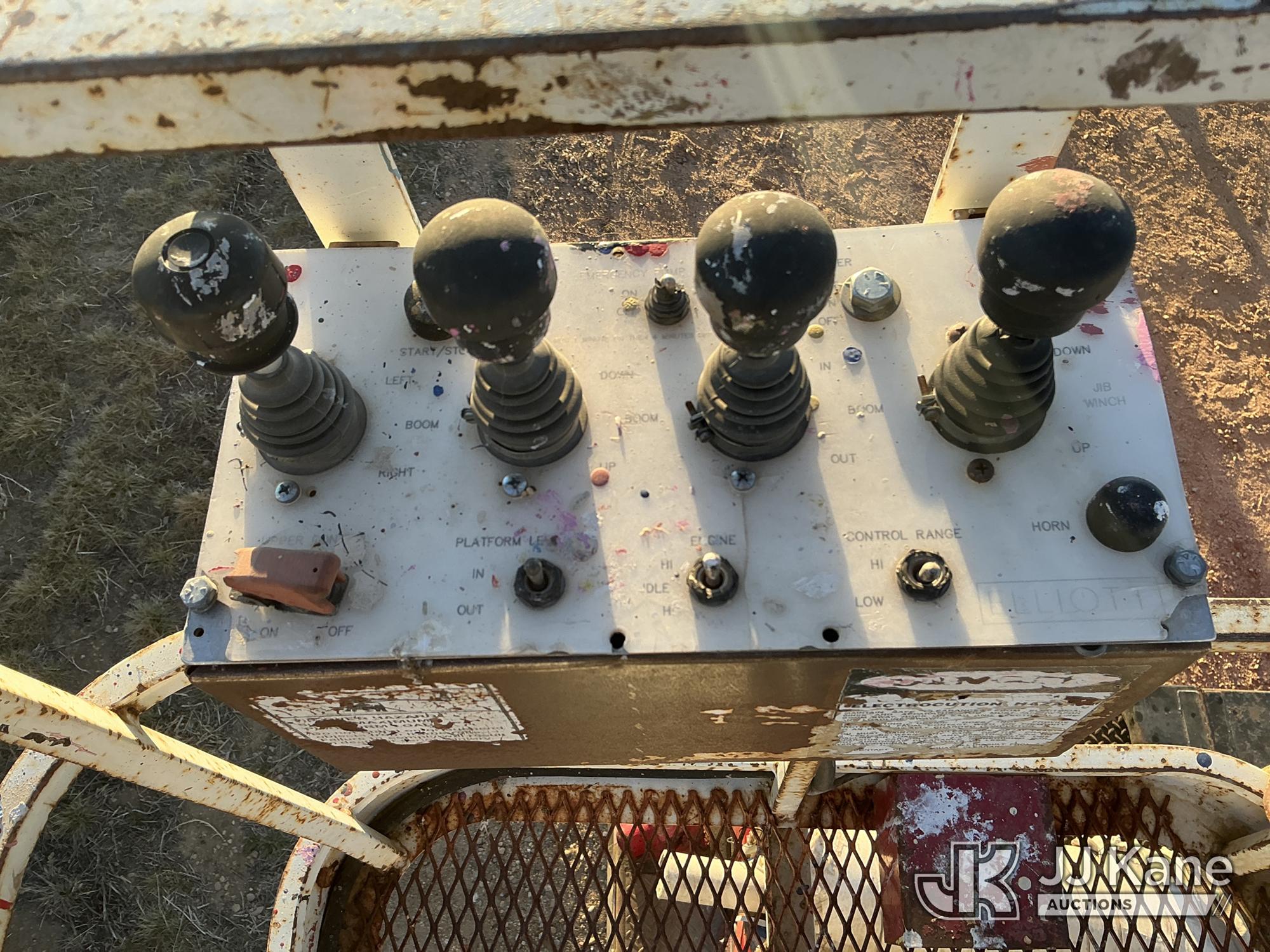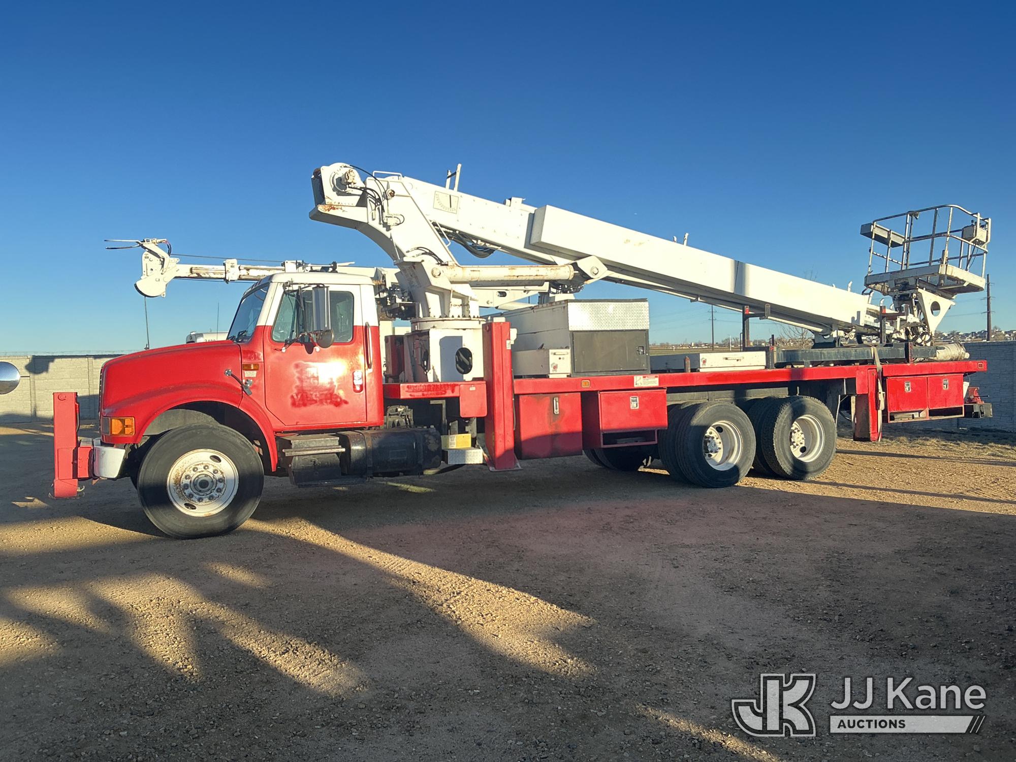 Elliott ECH-5-110-HC3H, 110 ft, Sign Crane Platform Lift s/n HF1725, with single man platform, mounted behind cab on 1996 International 4900 T/A Flatbed/Utility Truck, 8.7L diesel, 6X4, 8-spd w/ Lo-Lo, A/C, (Exempt from Odometer Disclosure - Reads 110,812 miles) (**Dealer Only**Runs & Moves) (Does Not Operate, Drivers Side Rear Outrigger Falls, Engine Rattle, Headlights Do Not Operate, Requires Cool Down After Stall) (No Emissions Provided, See Bidder Agreement) (Non Drive Away Removal Only: Safety Inspect An Altec inspection of the unit identified above has determined that the unit cannot be safely operated without completion of significant repairs. The unit has been removed from service until these repairs are accomplished. Serious injury or death can result for any attempt to operate the unit without the benefit of these repairs. Altec has recorded the out of service status of the unit. Until Altec has been notified, in writing, that the required repairs have been performed, or Altec performs the repairs, further service work, technical support, and part sales by Altec may be limited on this unit.) (Bidding Restricted to Licensed Vehicle Dealers Only), This is a Titled Item*