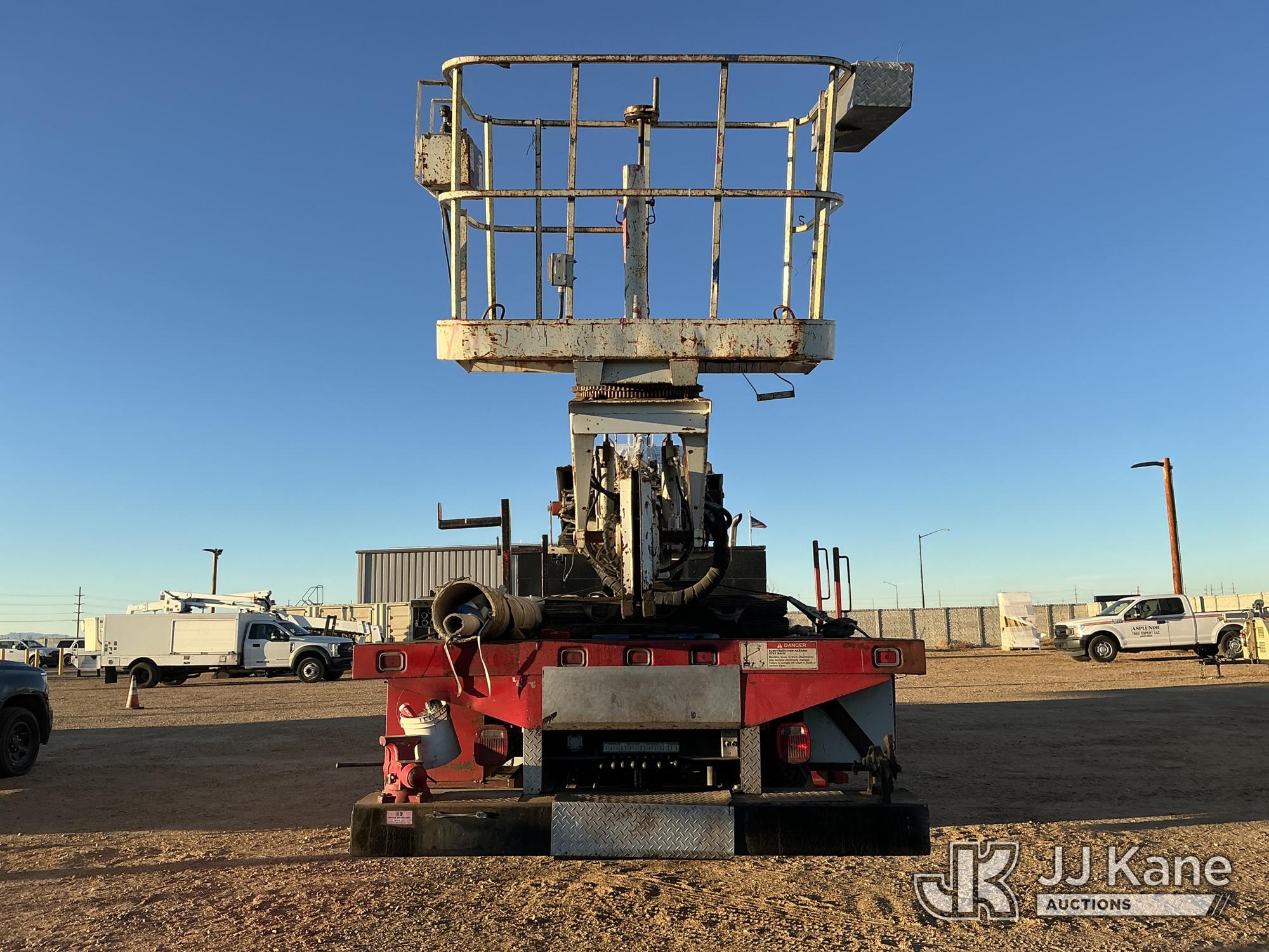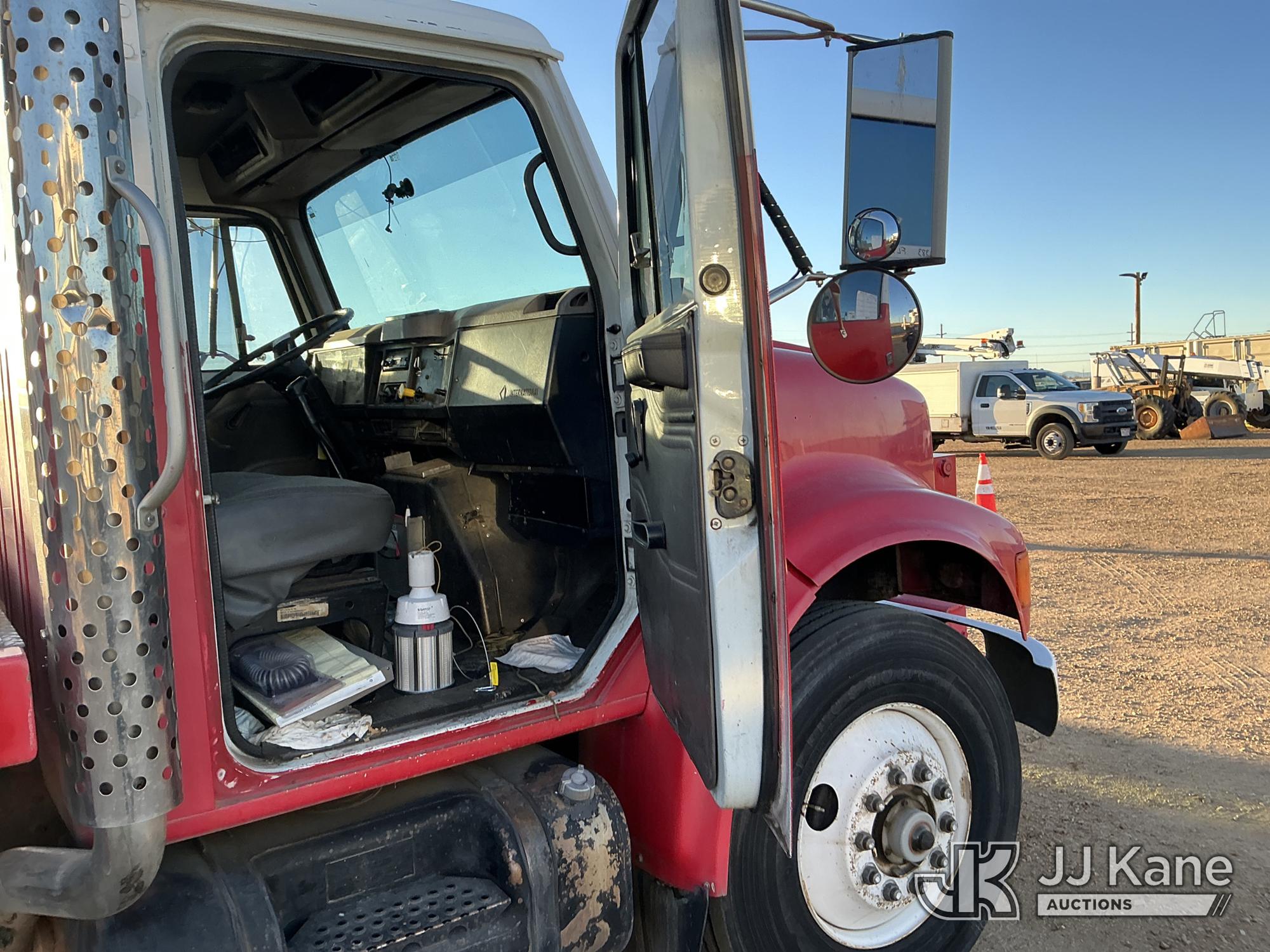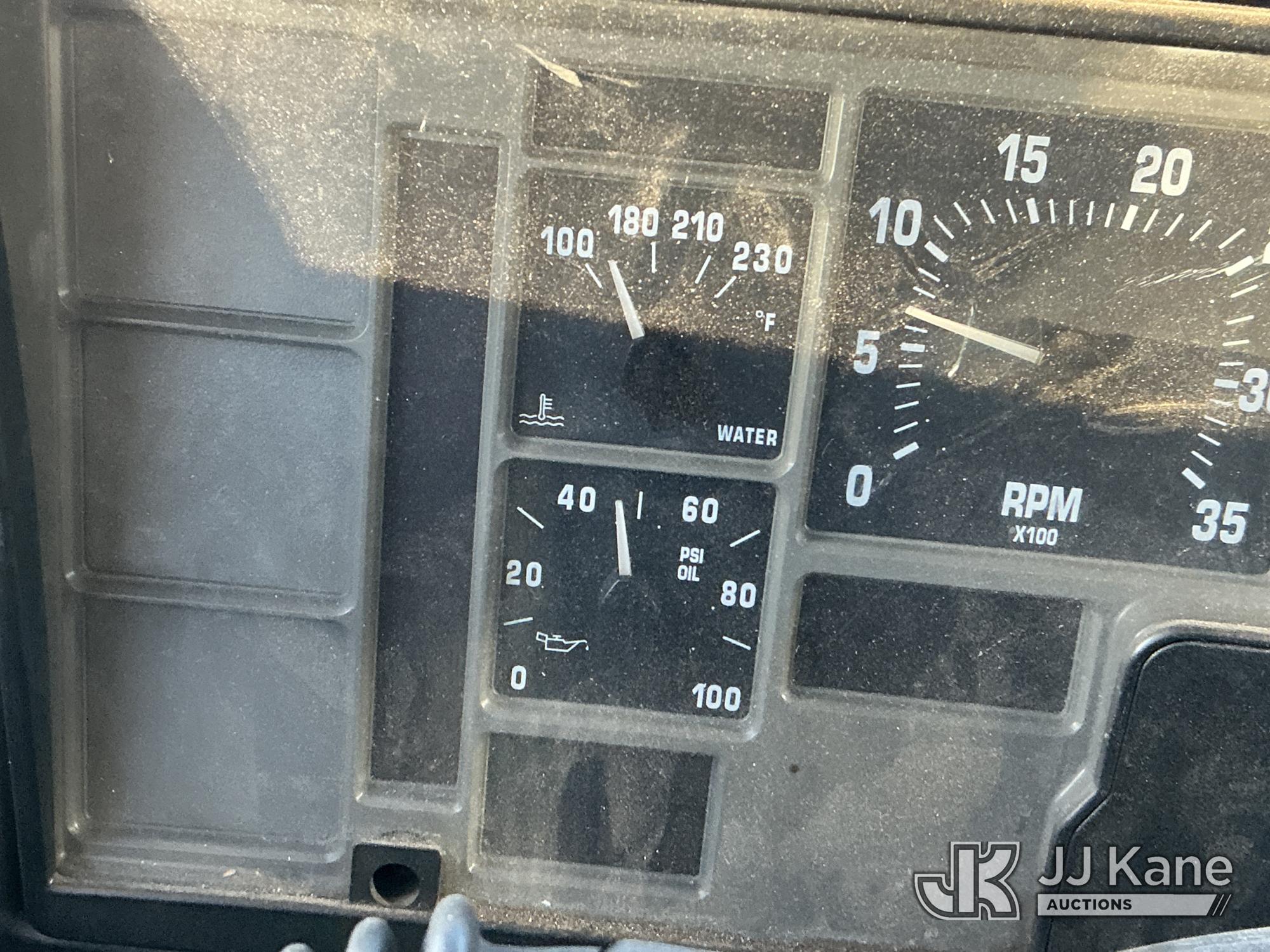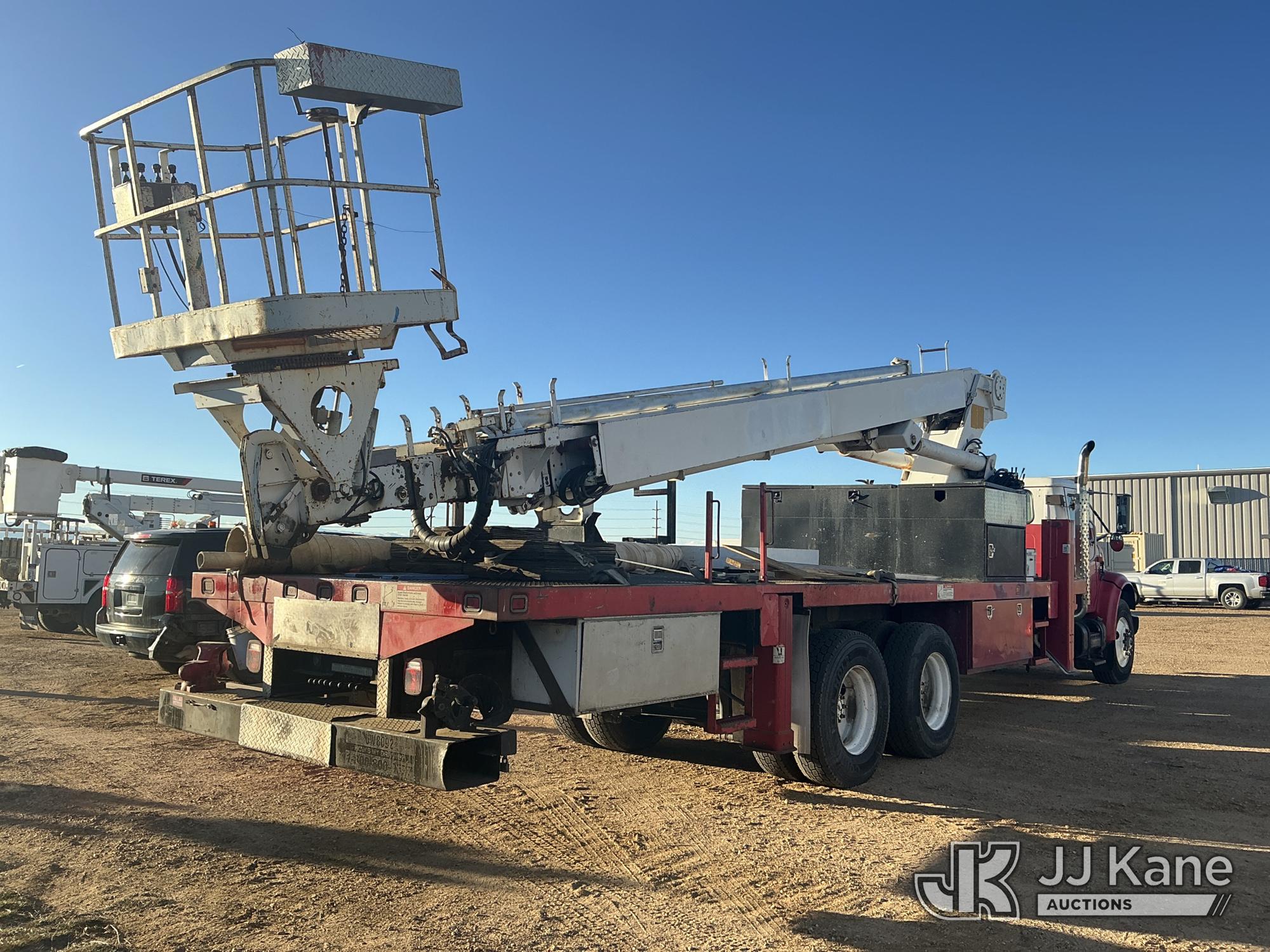 Elliott ECH-5-110-HC3H, 110 ft, Sign Crane Platform Lift s/n HF1725, with single man platform, mounted behind cab on 1996 International 4900 T/A Flatbed/Utility Truck, 8.7L diesel, 6X4, 8-spd w/ Lo-Lo, A/C, (Exempt from Odometer Disclosure - Reads 110,812 miles) (**Dealer Only**Runs & Moves) (Does Not Operate, Drivers Side Rear Outrigger Falls, Engine Rattle, Headlights Do Not Operate, Requires Cool Down After Stall) (No Emissions Provided, See Bidder Agreement) (Non Drive Away Removal Only: Safety Inspect An Altec inspection of the unit identified above has determined that the unit cannot be safely operated without completion of significant repairs. The unit has been removed from service until these repairs are accomplished. Serious injury or death can result for any attempt to operate the unit without the benefit of these repairs. Altec has recorded the out of service status of the unit. Until Altec has been notified, in writing, that the required repairs have been performed, or Altec performs the repairs, further service work, technical support, and part sales by Altec may be limited on this unit.) (Bidding Restricted to Licensed Vehicle Dealers Only), This is a Titled Item*