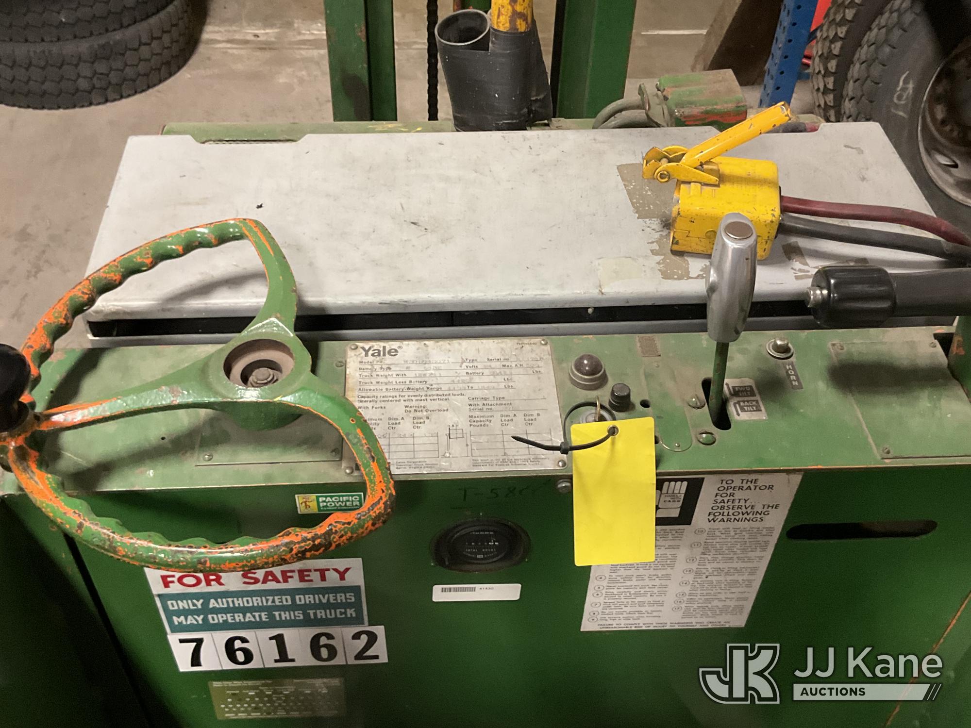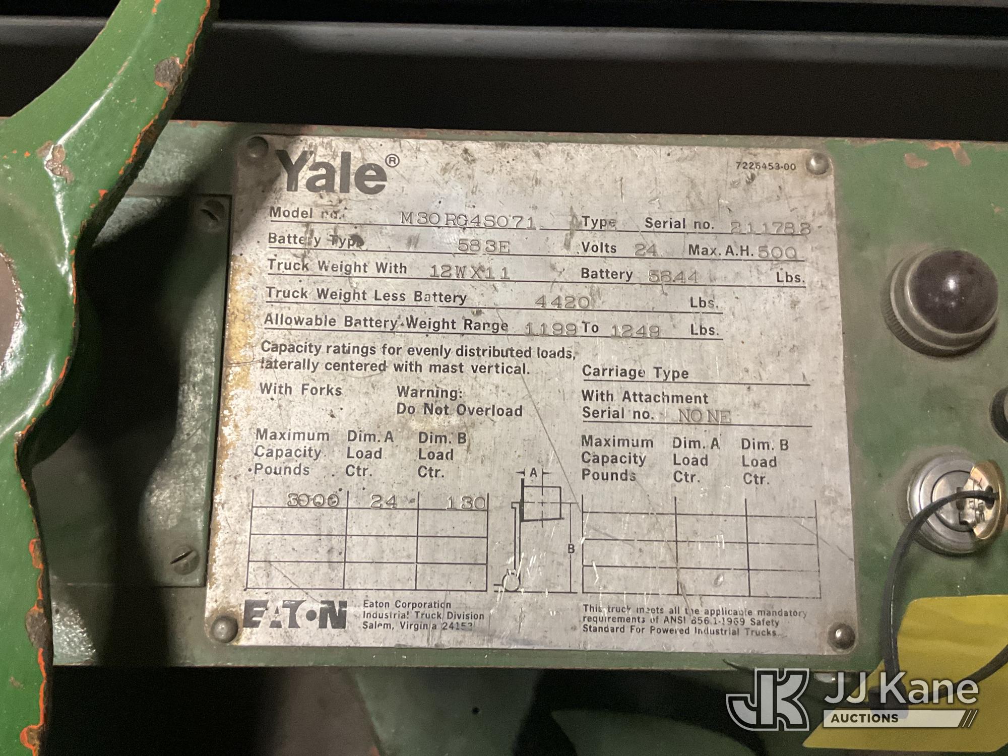 1978 Yale M30RG4S071 Stand-Up Forklift, s/n 211788, battery powered, Hydrostatic, with 3000lbs capacity, 130in fork height, (Does Not Operate, Condition Unknown) (Seller States: Battery Will Not Hold Charge) (Reads 1,923 hours)*