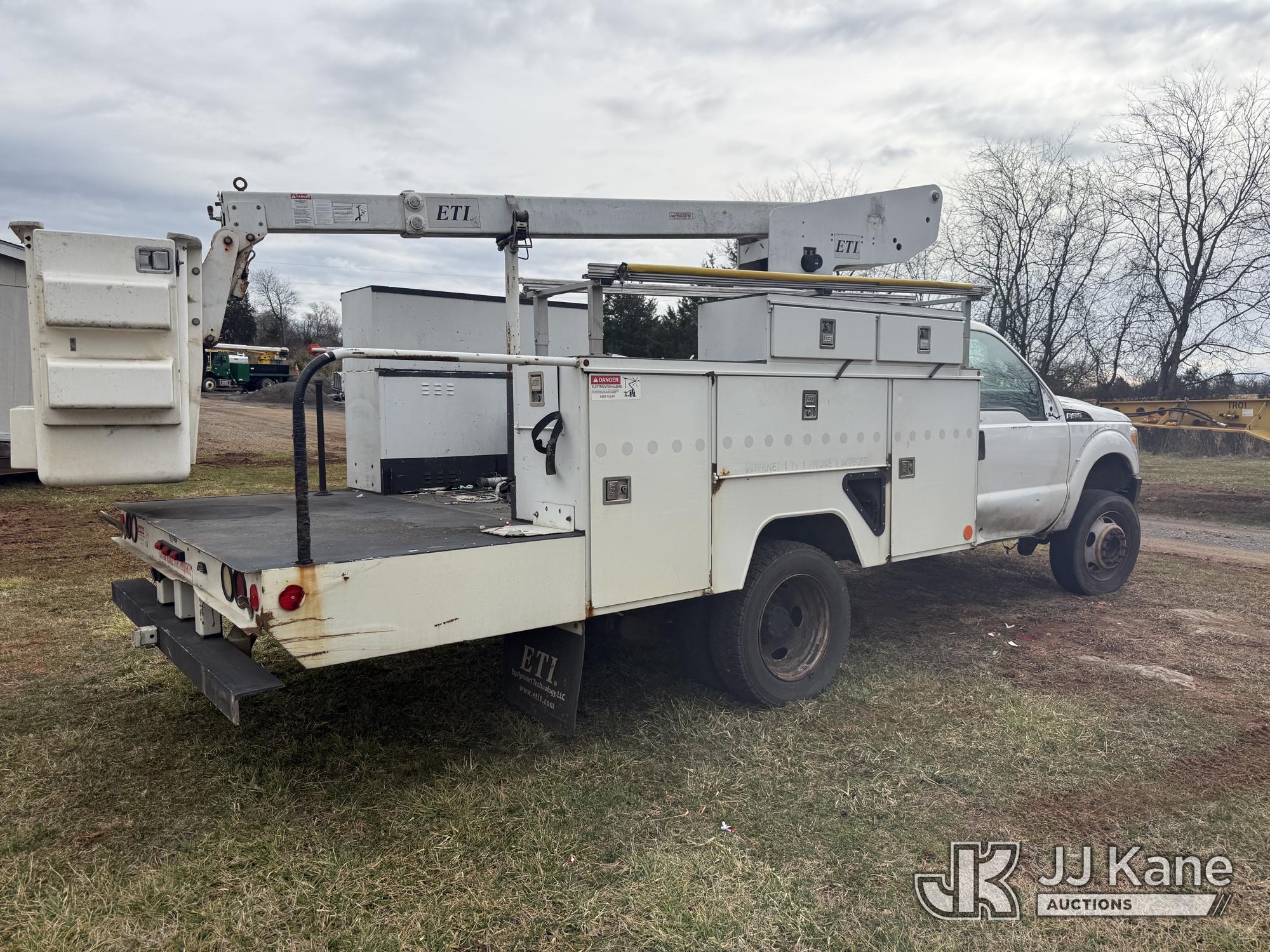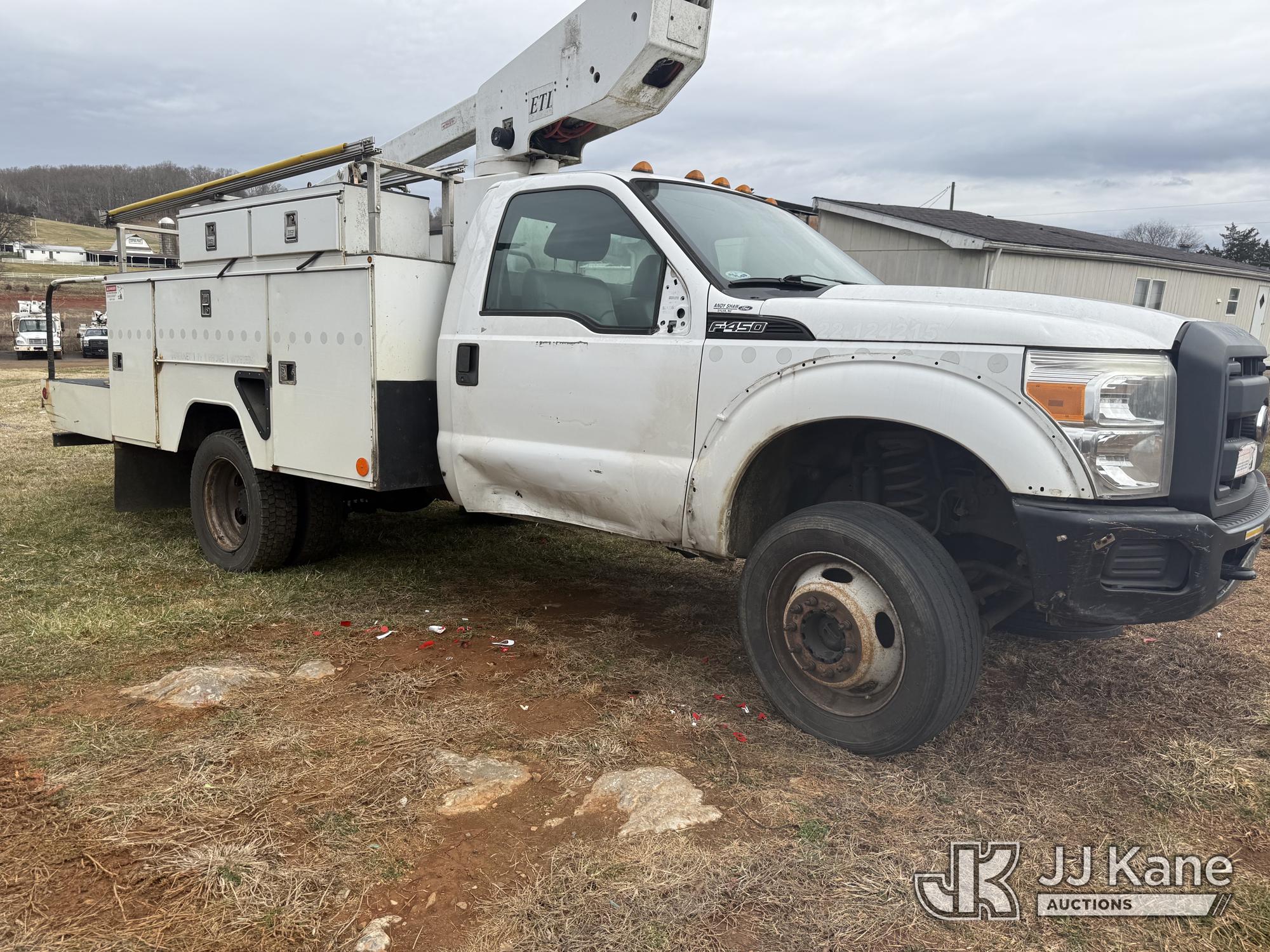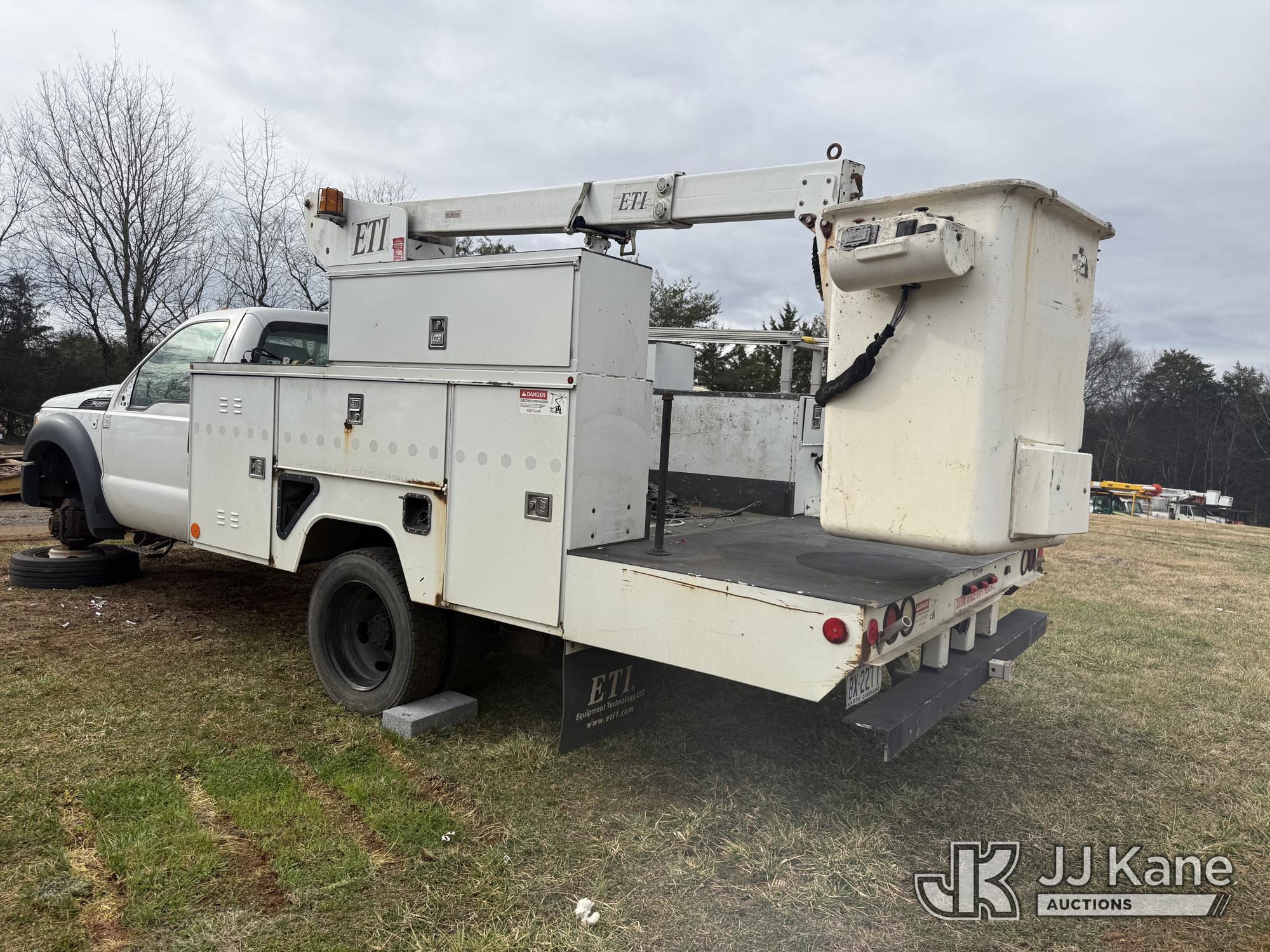 ETI ETT29-SNT, 34 ft, Telescopic Insulated Bucket Truck s/n 1212T99886, with single-man bucket, mounted behind cab on 2012 Ford F450 4x4 Service Truck, 10-cyl gas, Auto, True Mileage Unknown (Not Running, Missing Parts, Missing Tire, Condition Unknown, Upper Condition Unknown) This is a Titled Item*