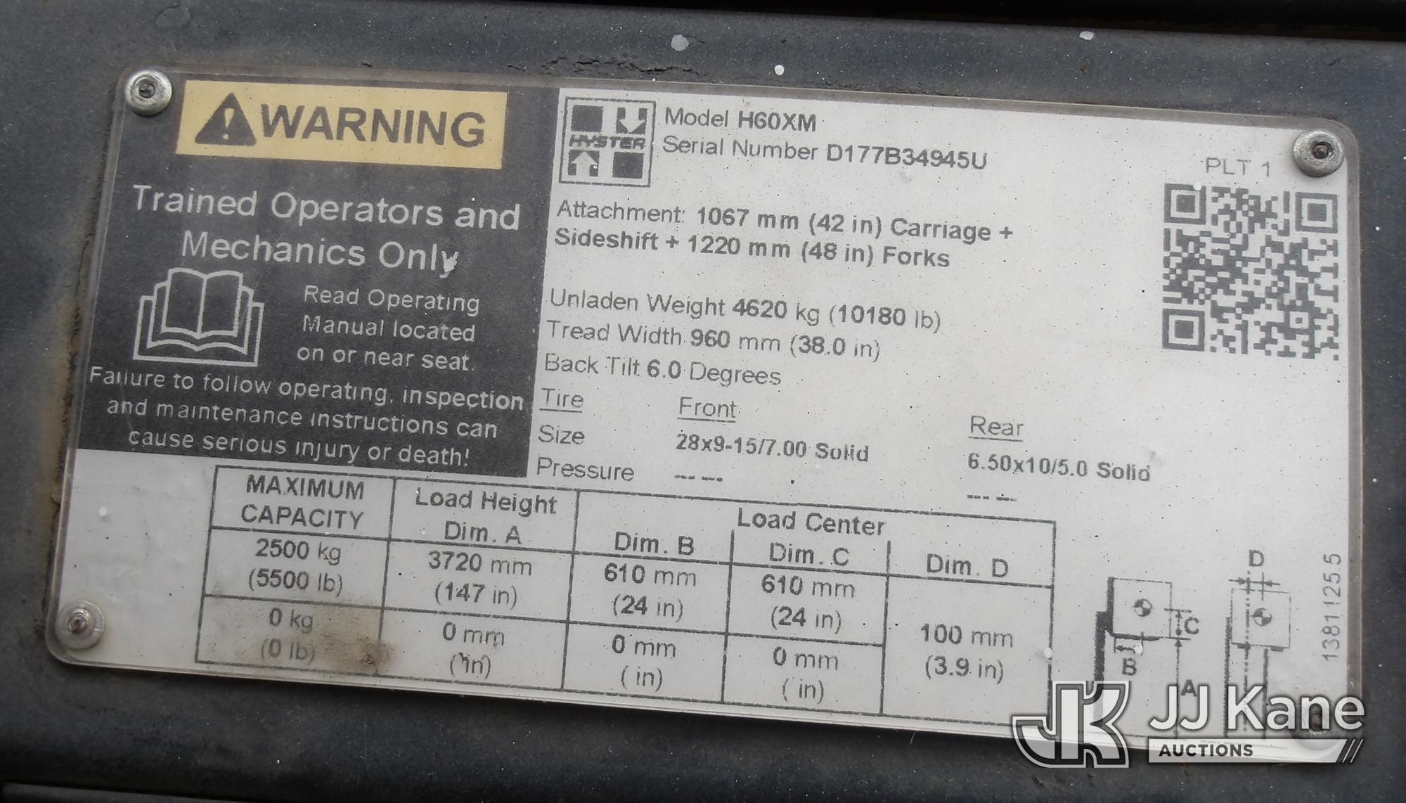 2020 Hyster H60XM Pneumatic Tired Forklift, s/n D177B34945U, diesel, Shuttle, with 5500 lb capacity, 147 in mast height, 3-stage mast, side shift & ROPS, (Runs, Operates) (Radiator Issue, Broken Seatbelt) (Reads 11,937 hours)*