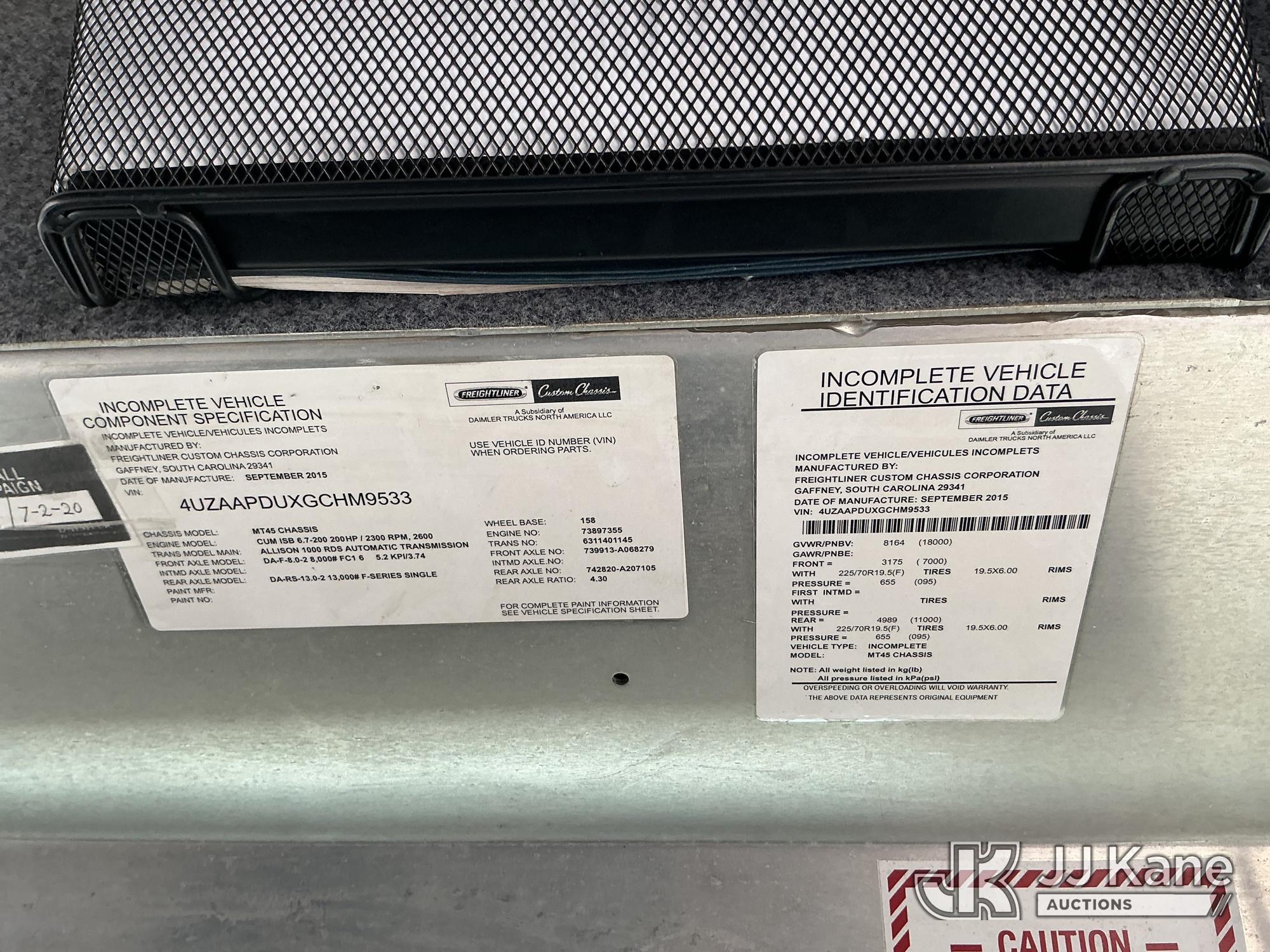2016 Freightliner MT45 Chassis Step Van, 6.7L 4X2, diesel, Auto, A/C, with Cummins/Onan Generator, Kubota Dsl. Arrowboard, (52,609 miles) (Jump To Start, Runs & Moves, Check Engine Light On) This is a Titled Item*