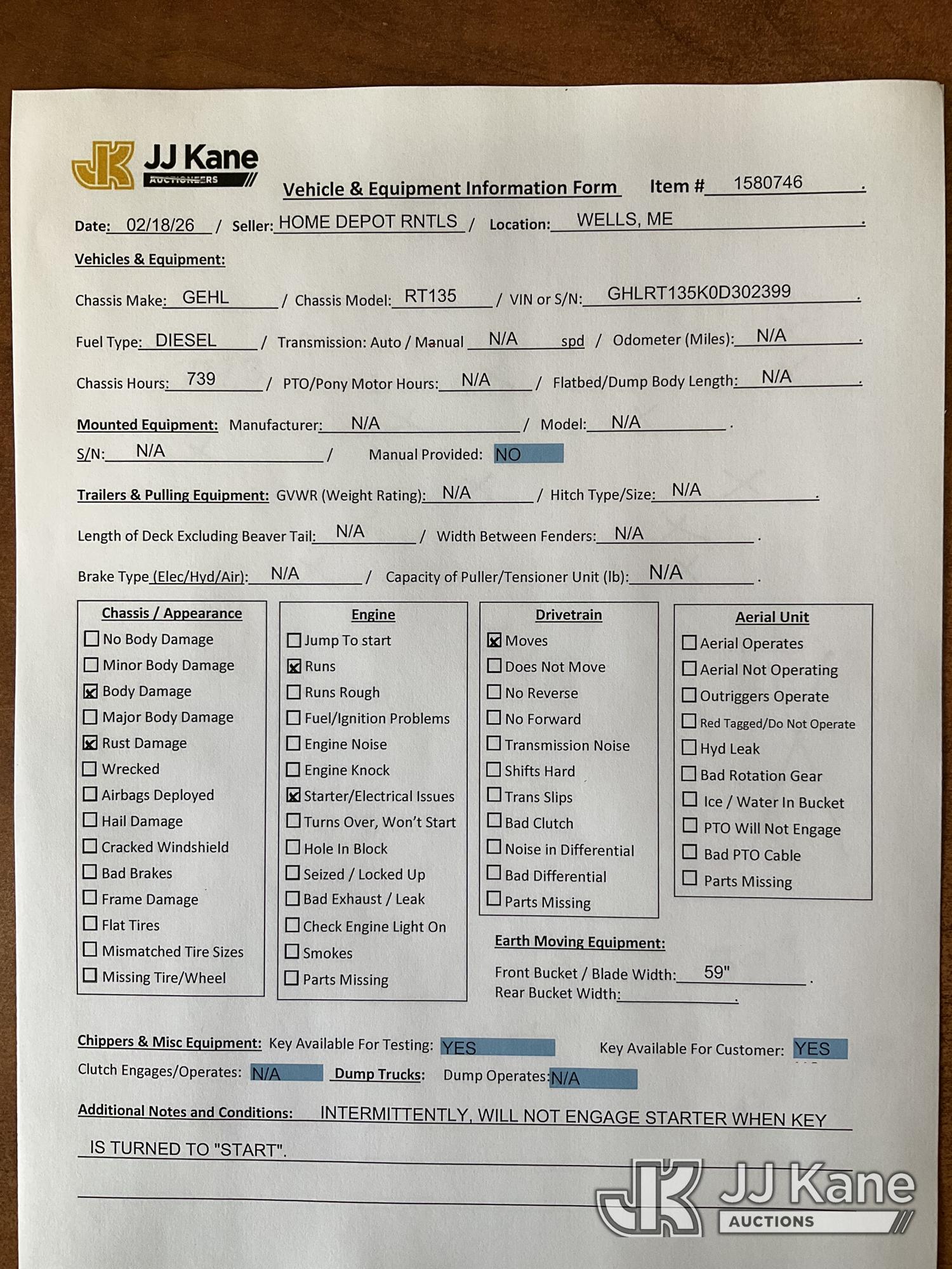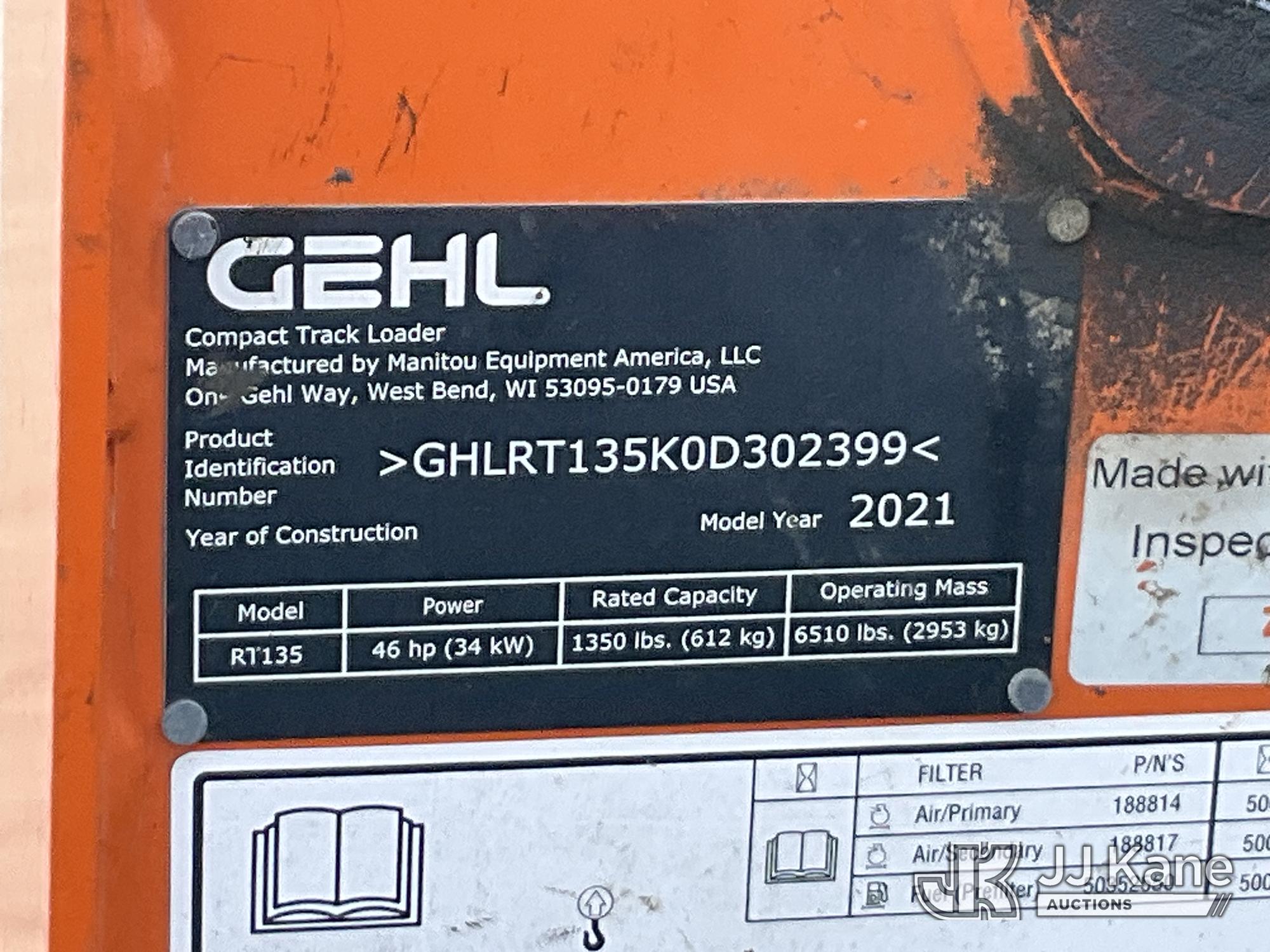2021 Gehl RT135 Skid Steer Loader, s/n GHLRT135K0D302399, Yanmar diesel, Hydraulic Drive, with rubber tracks, GP bucket & ROPS, (Runs & Operates, Starter/Electrical Issues) (Removal is by Appointment Only, Buyer MUST make a appointment prior to picking up, Buyer/Transporter Must have PAID IN FULL RELEASE. No onsite assistance available, Please Come prepared.) (Reads 739 hours)*