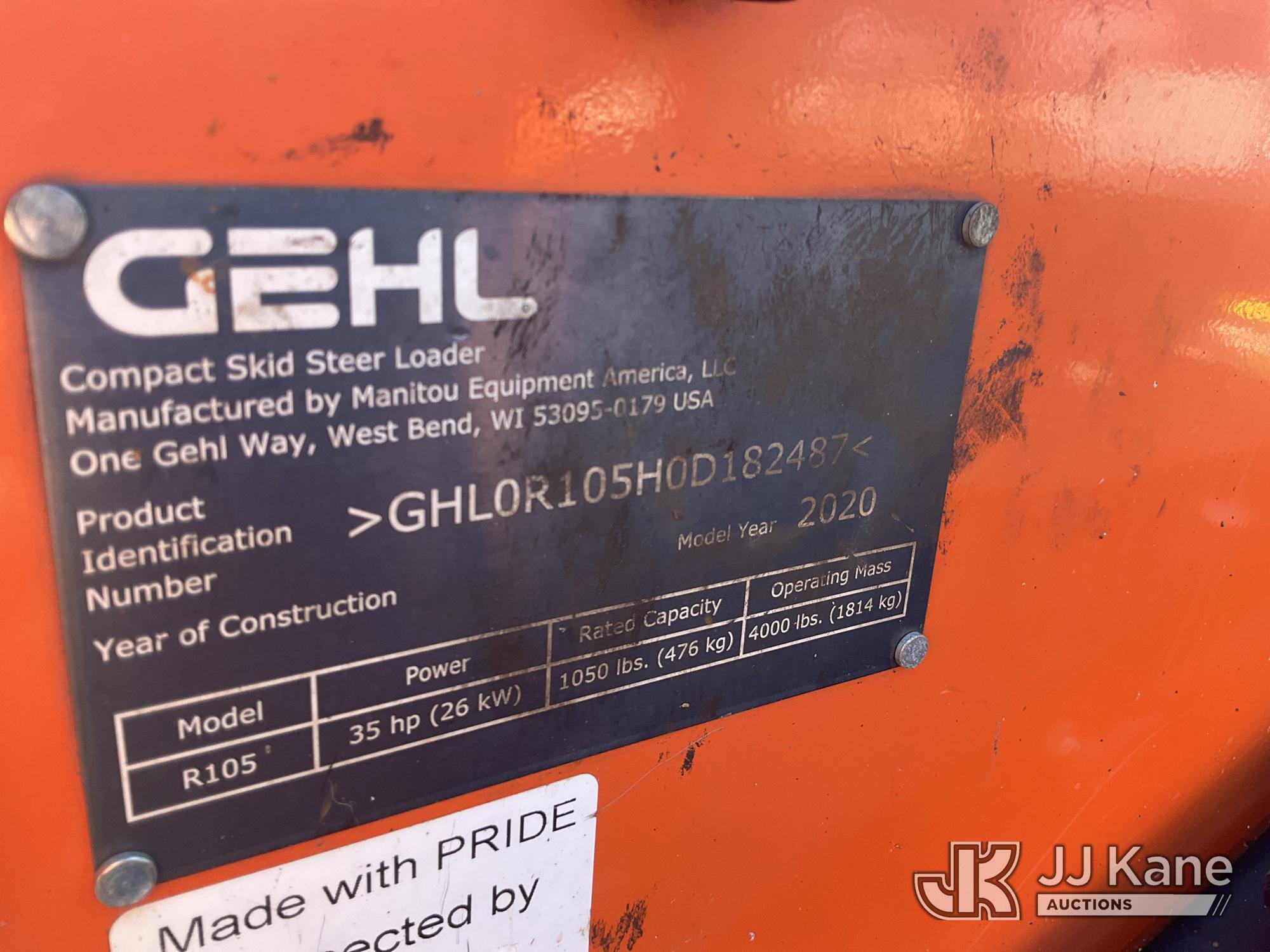2020 Gehl R105 Rubber Tired Skid Steer Loader, s/n GHL0R105H0D182487, Yanmar diesel, Hydrostatic, with QD GP Loader Bucket, Aux Hyd Outlet & ROPS, (Runs & Moves) (Reads 1,164 hours)*
