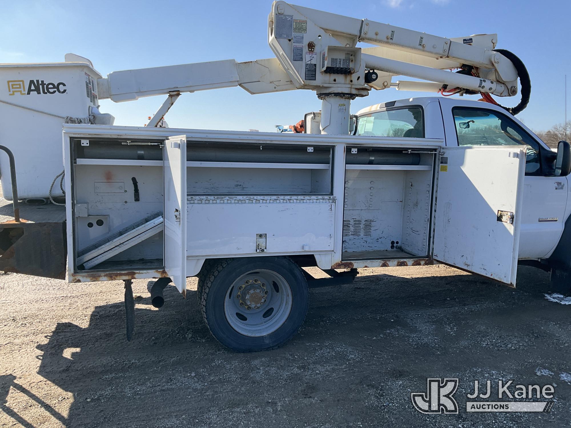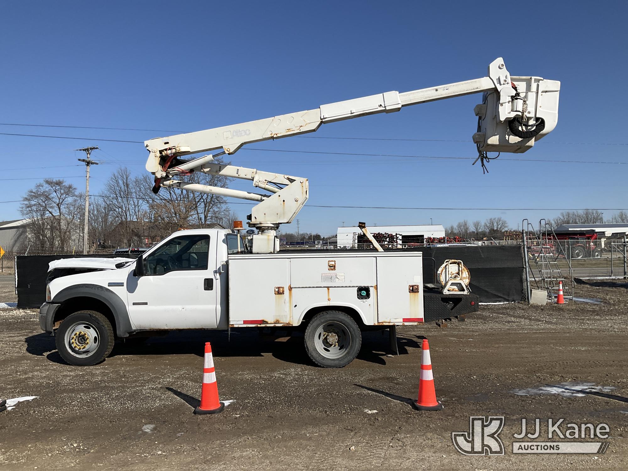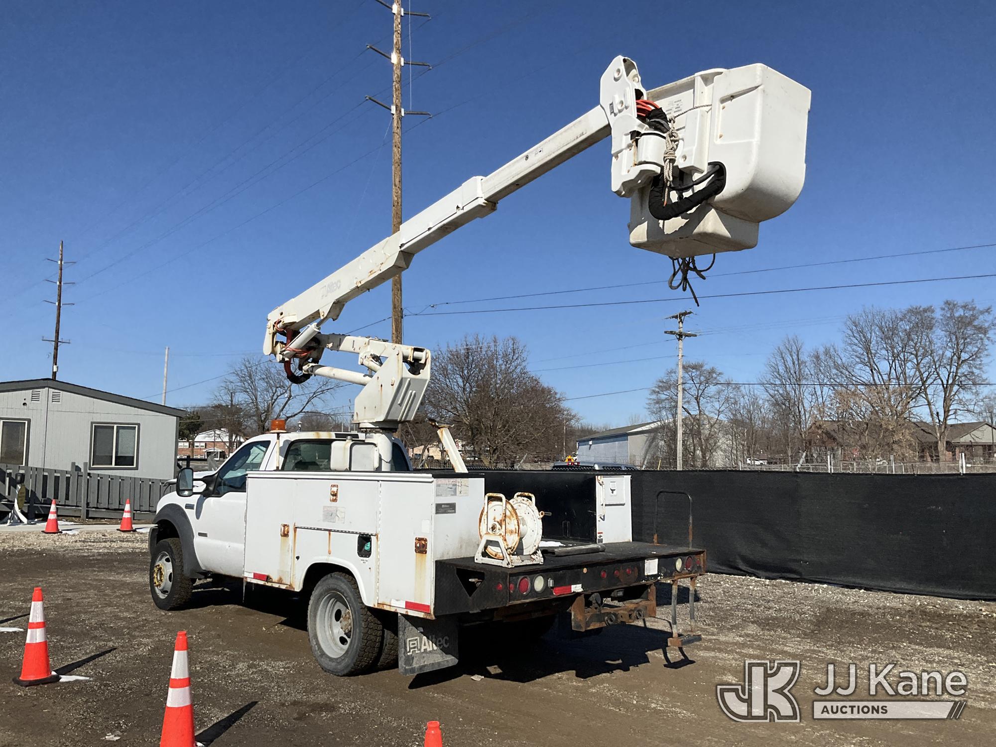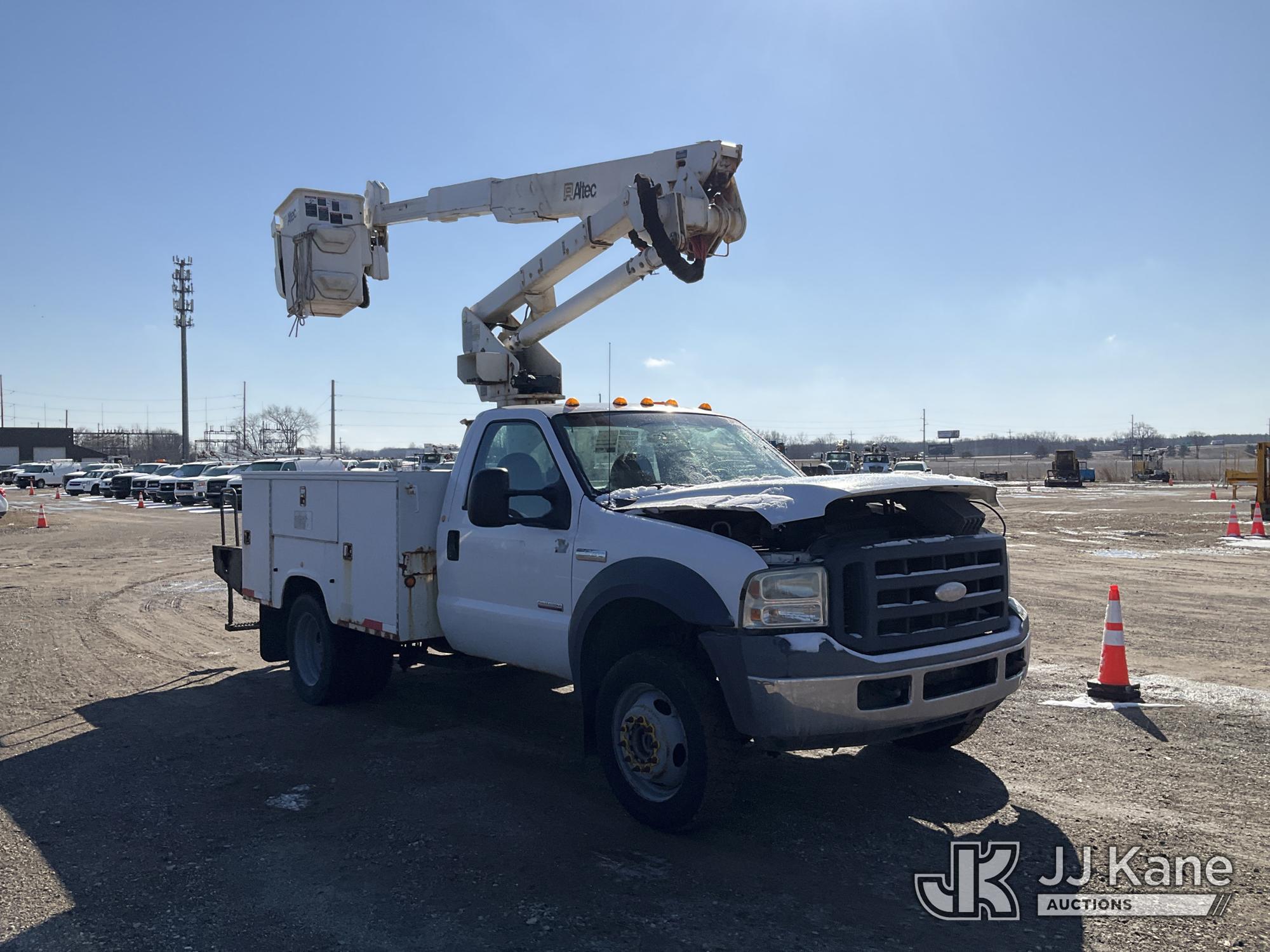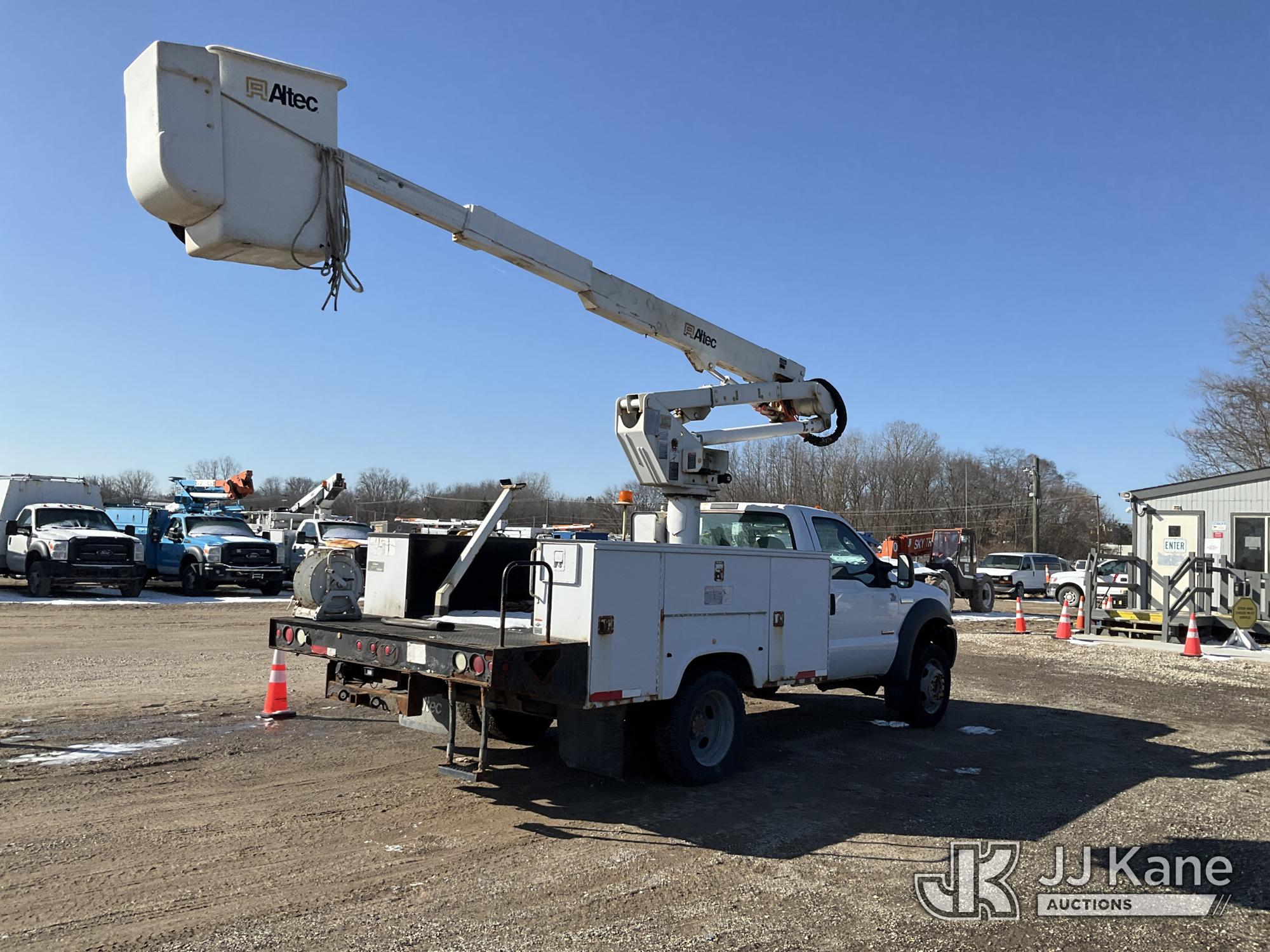Altec AT37G, 42 ft, Articulating & Telescopic Bucket Truck s/n 0605DE5833, with single man bucket, mounted behind cab on 2005 Ford F550 4x4 Service Truck, 6.0L V8 OHV 32V TURBO DIESEL Auto, A/C, (Exempt from Odometer Disclosure - Reads 84,096 miles (unverified)) (Runs, Moves & Operates) (Jump to Start, Won’t Stay Running Without Jump Box, Rust) (The manufacturer has notified JJ Kane that this equipment is subject to an open recall. CSN 520 Counterweight Inspection CSN 535 Articulating Arm Fiberglass Link Inspection for AT3XG CSN-ATC-202 Interlock Handle Replacement The equipment should not be operated until this is addressed. Buyer is responsible for reviewing the recall notice and contacting the manufacturer to schedule the recommended corrective actions. Associated costs may be covered by the manufacturer in some cases.) (Reads 4,791 hours) This is a Titled Item*