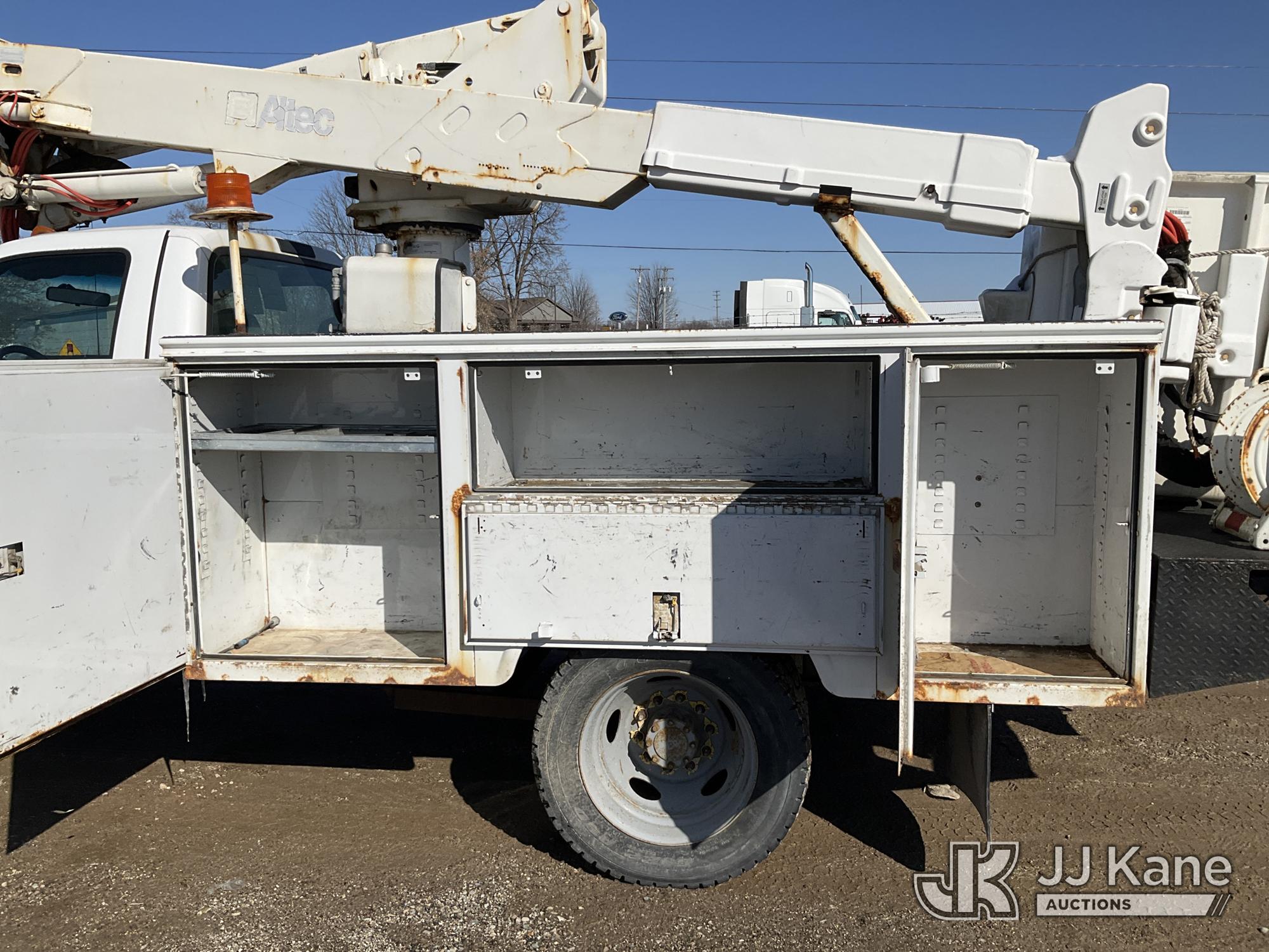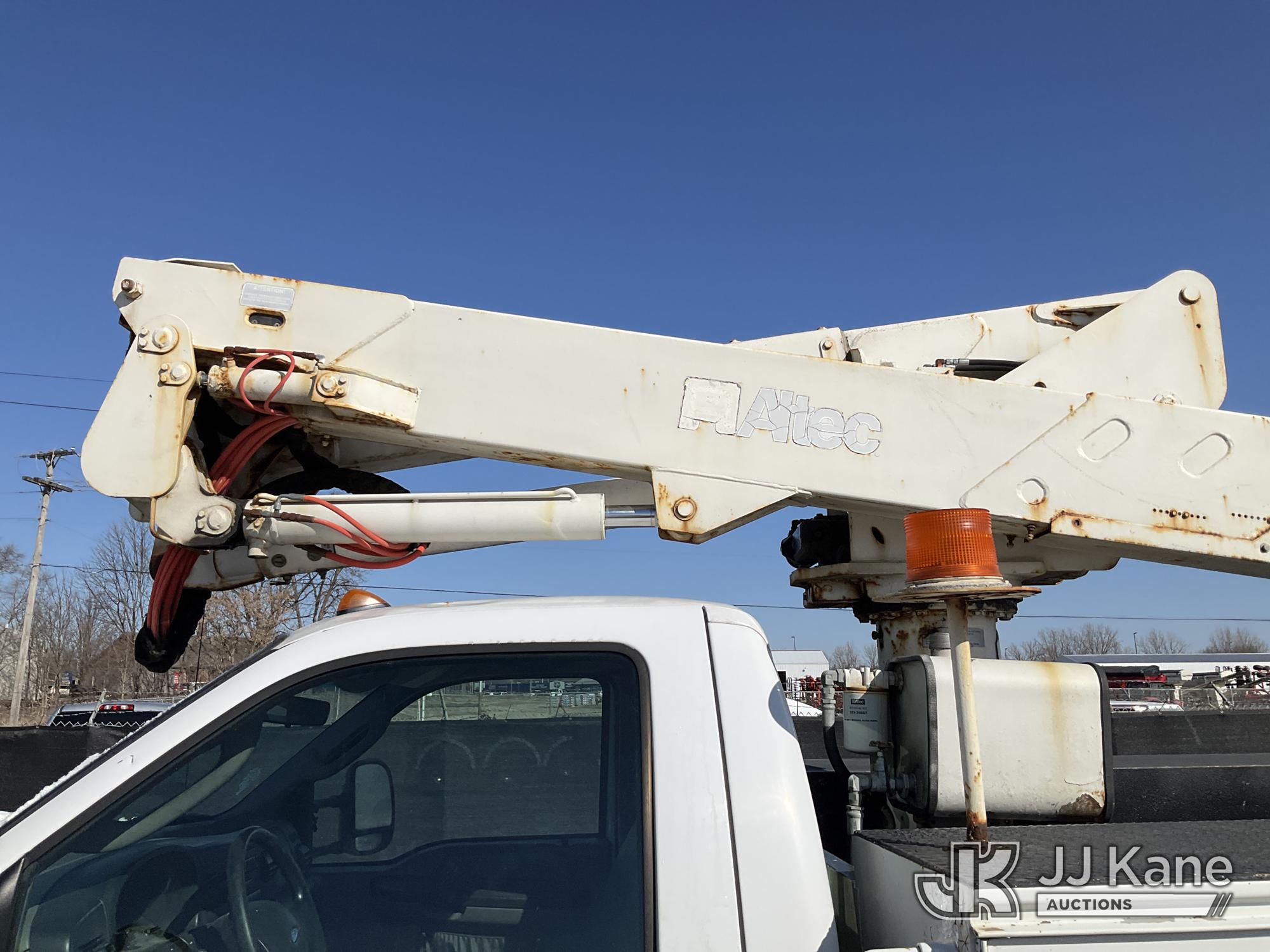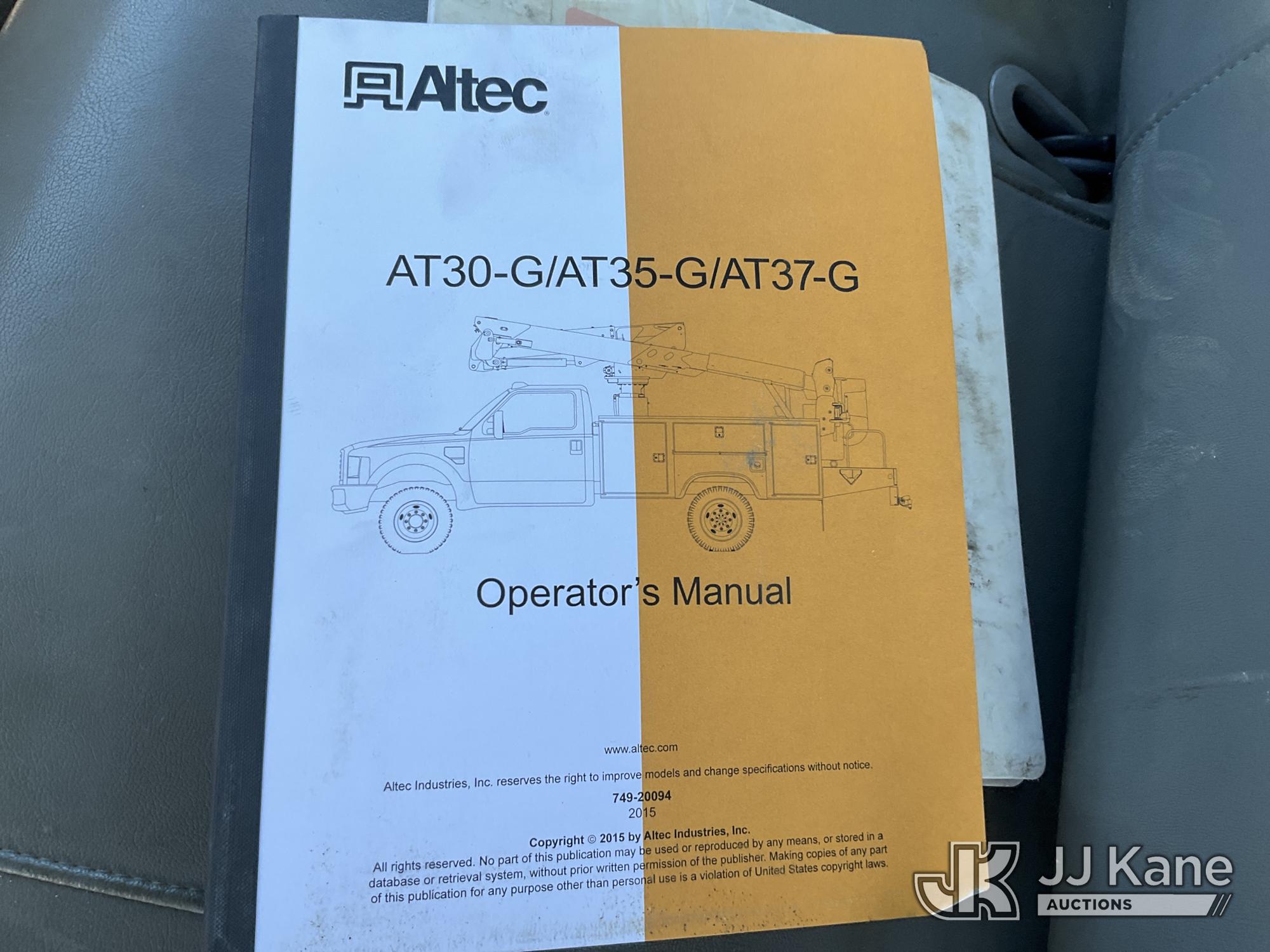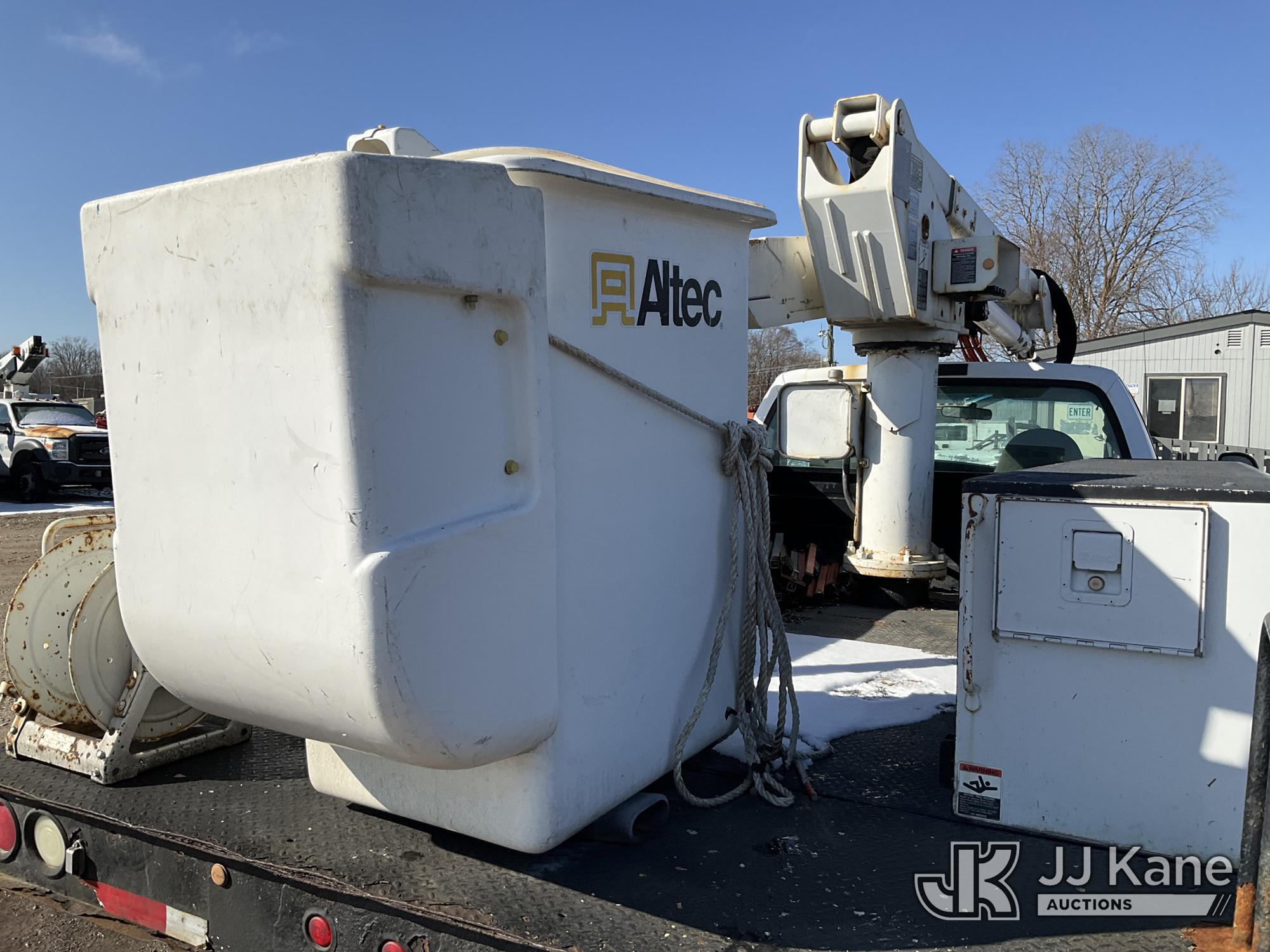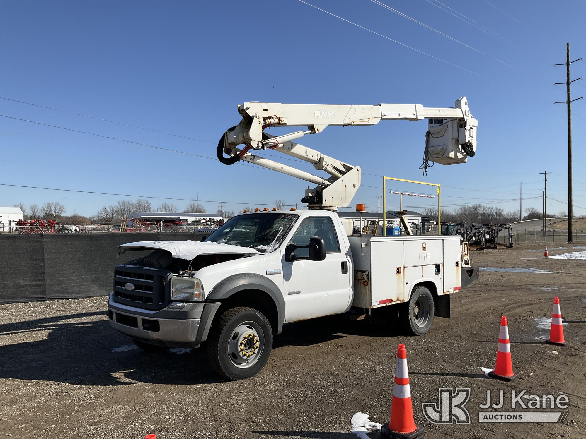 Altec AT37G, 42 ft, Articulating & Telescopic Bucket Truck s/n 0605DE5833, with single man bucket, mounted behind cab on 2005 Ford F550 4x4 Service Truck, 6.0L V8 OHV 32V TURBO DIESEL Auto, A/C, (Exempt from Odometer Disclosure - Reads 84,096 miles (unverified)) (Runs, Moves & Operates) (Jump to Start, Won’t Stay Running Without Jump Box, Rust) (The manufacturer has notified JJ Kane that this equipment is subject to an open recall. CSN 520 Counterweight Inspection CSN 535 Articulating Arm Fiberglass Link Inspection for AT3XG CSN-ATC-202 Interlock Handle Replacement The equipment should not be operated until this is addressed. Buyer is responsible for reviewing the recall notice and contacting the manufacturer to schedule the recommended corrective actions. Associated costs may be covered by the manufacturer in some cases.) (Reads 4,791 hours) This is a Titled Item*