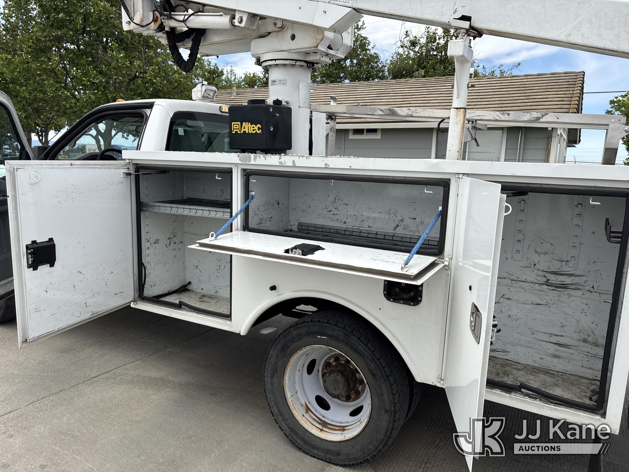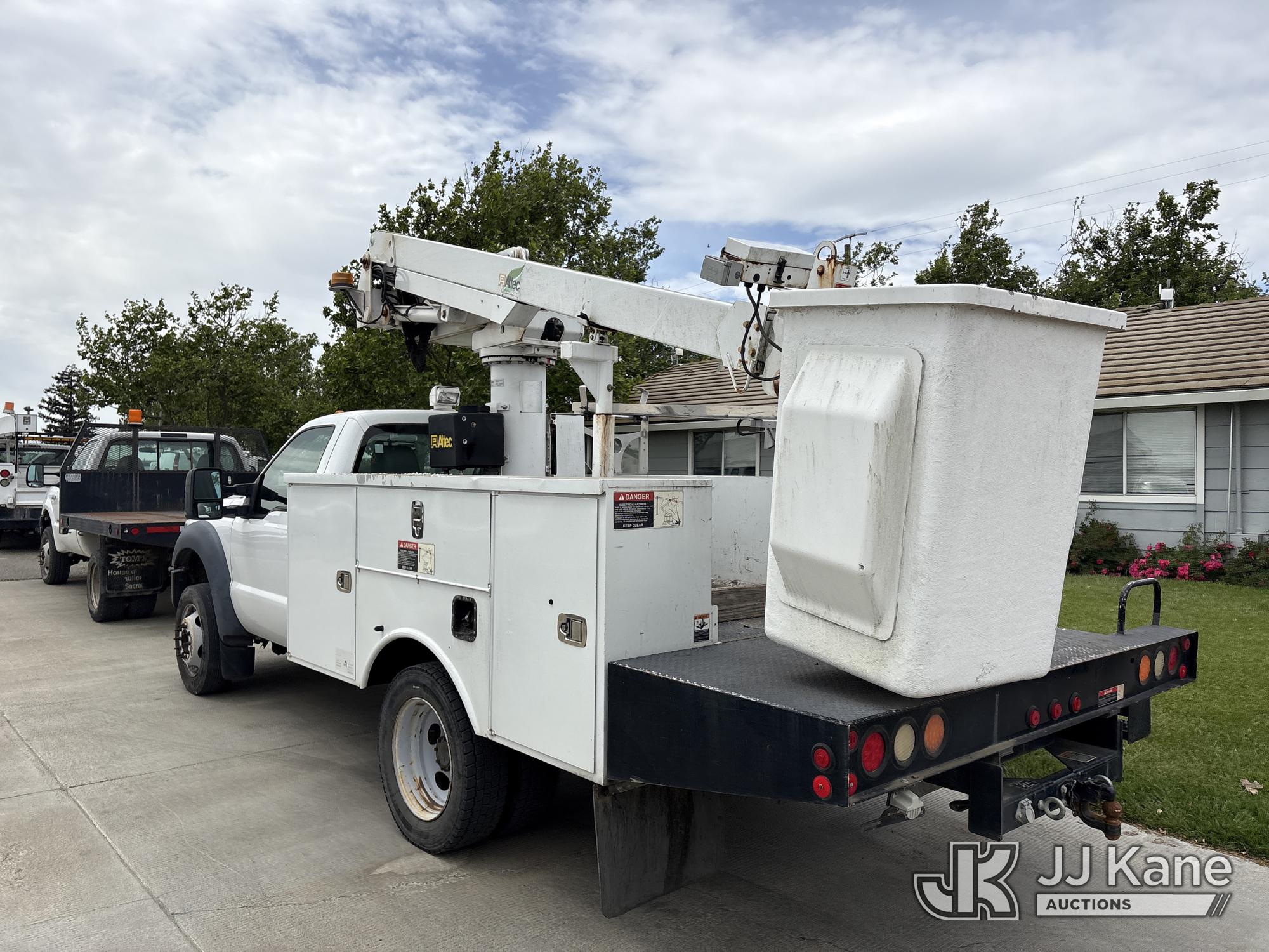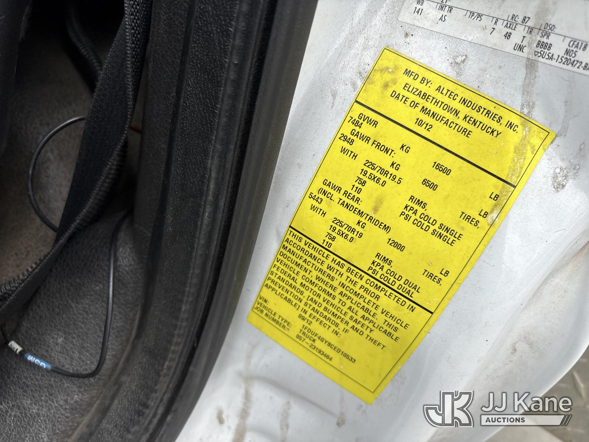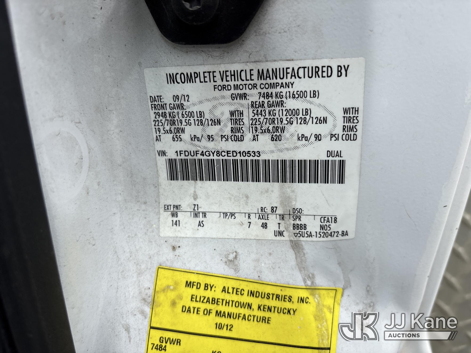 Altec AT235, 40 ft, Articulating & Telescopic Bucket Truck s/n 0912BX5500, with single-man bucket, mounted behind cab on 2012 Ford F-450 SD Regular Cab DRW 2WD Service Truck, s/n 1FDUF4GY8CED10533, 6.8L V10 SOHC 30V RWD, Gas, Auto, A/C, (140,324 miles) (Runs & Moves, Does Not Operate, Immediately Shuts Off When PTO Is Engaged, Passenger Side Windshield Damaged) (Reads 7,231 hours) This is a Titled Item*