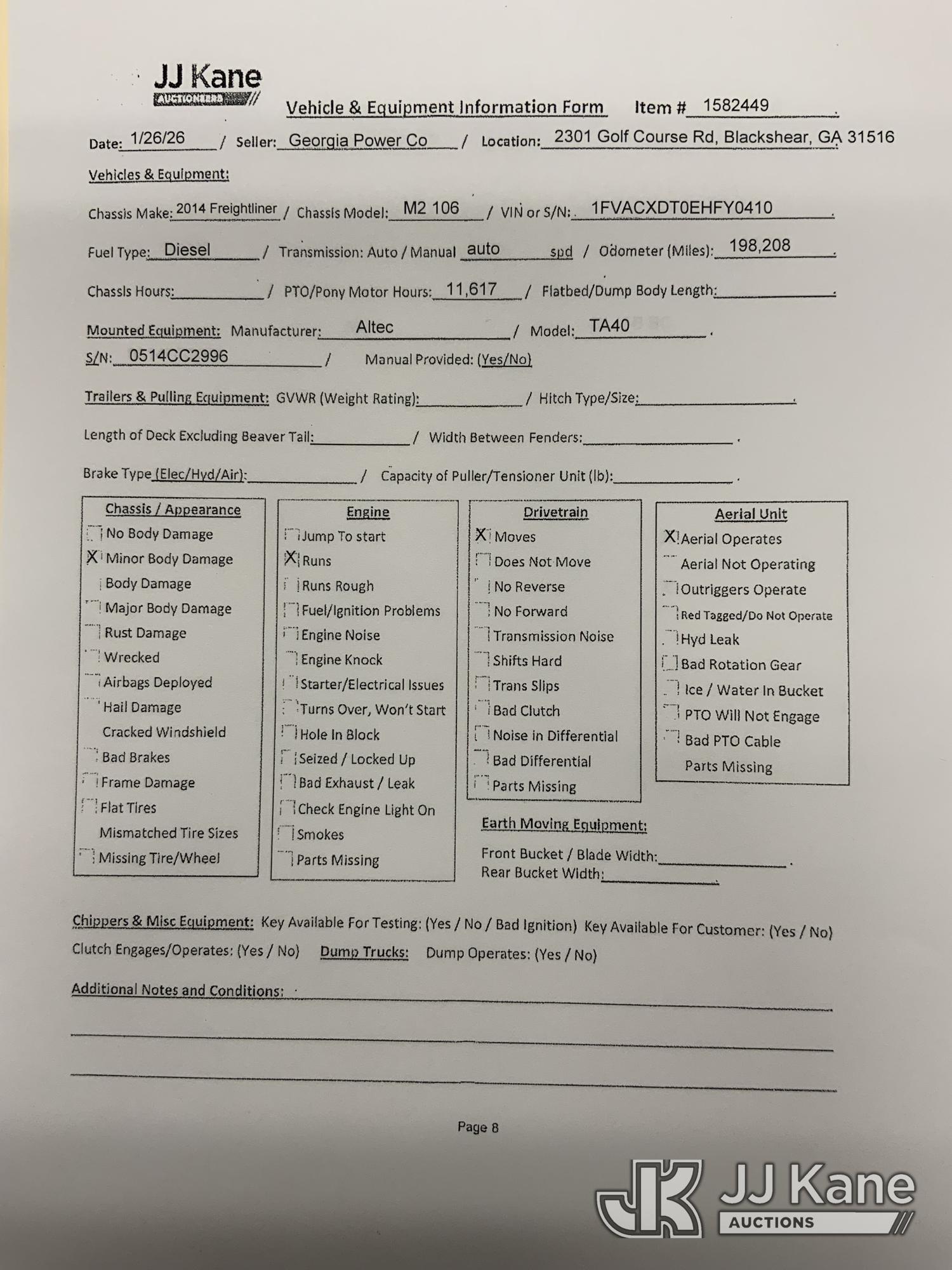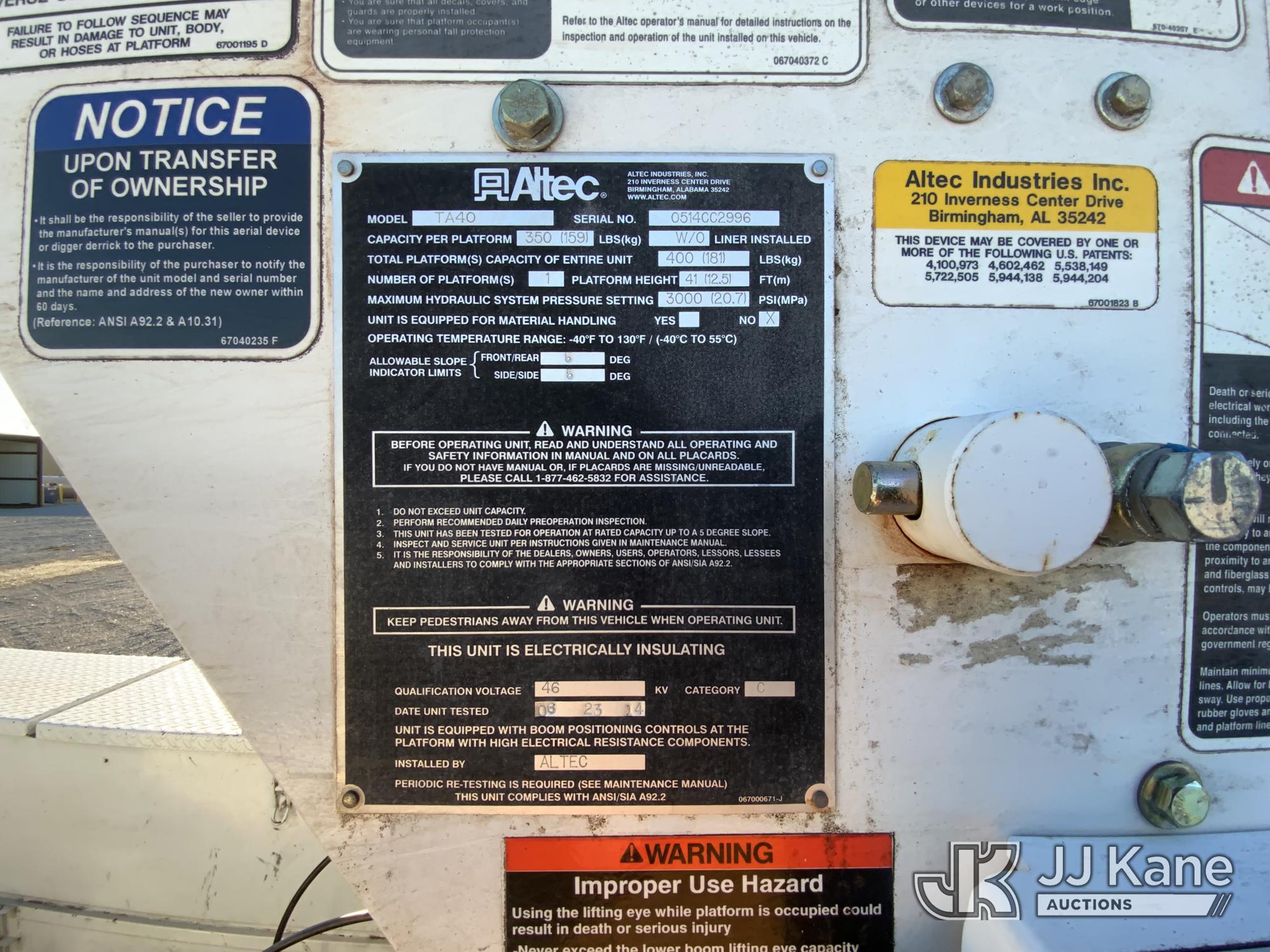 Altec TA40, 46 ft, Articulating & Telescopic Bucket Truck s/n 0514CC2996, with single man bucket, mounted behind cab on 2014 Freightliner M2 106 Utility Truck, 6.7L diesel, 4X2, Auto, A/C, (198,208 miles) (GA Power Unit) (Runs, Moves & Upper Operates) This is a Titled Item*