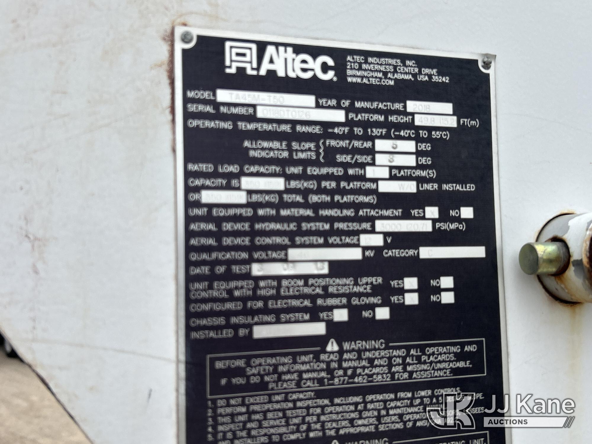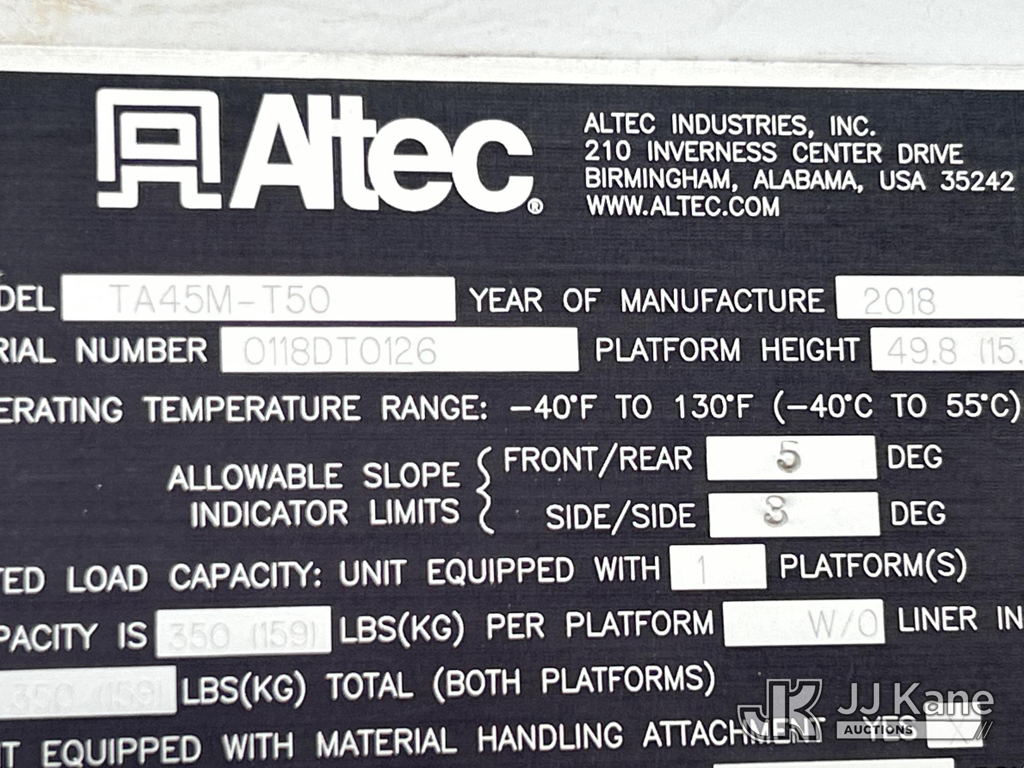Altec TA45M-T50, 55 ft, Articulating & Telescopic Material Handling Bucket Truck s/n 0118DT0126, with 4 hyd outriggers, single man bucket, mounted behind cab on 2018 Freightliner M2 Utility Truck, 6.7L diesel, Auto, A/C, (58,944 miles) (Runs, Moves & Upper Operates) (Reads 7,057 hours) This is a Titled Item*