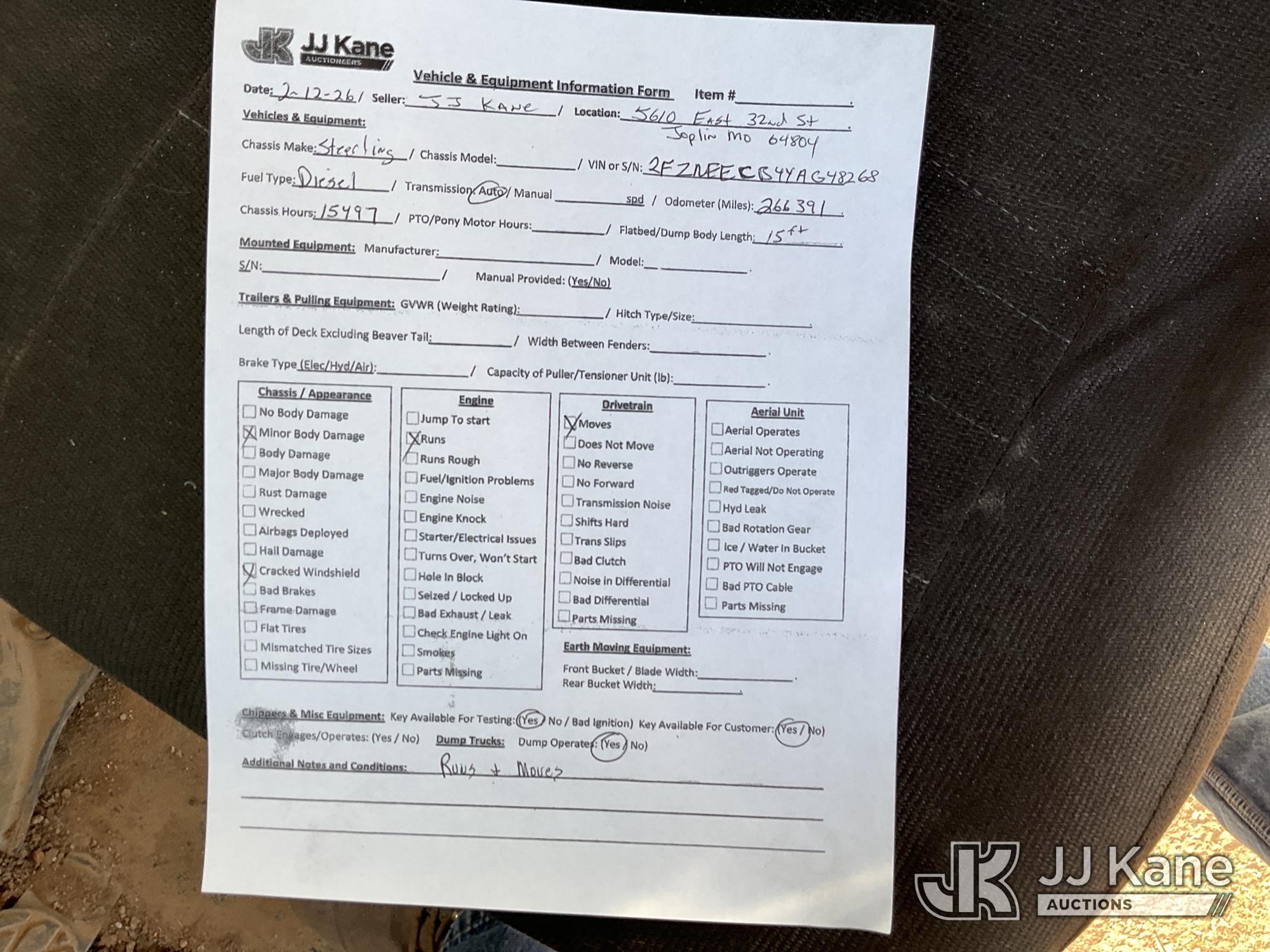 2000 Sterling LT9500 T/A Dump Truck, 10.3L L6 DIESEL 6X4, Auto, A/C, (Exempt from Odometer Disclosure - Reads 266,391 miles) (Runs & Moves) (Has Minor Body Damage, Cracked Windshield) (Reads 15,497 hours) This is a Titled Item*