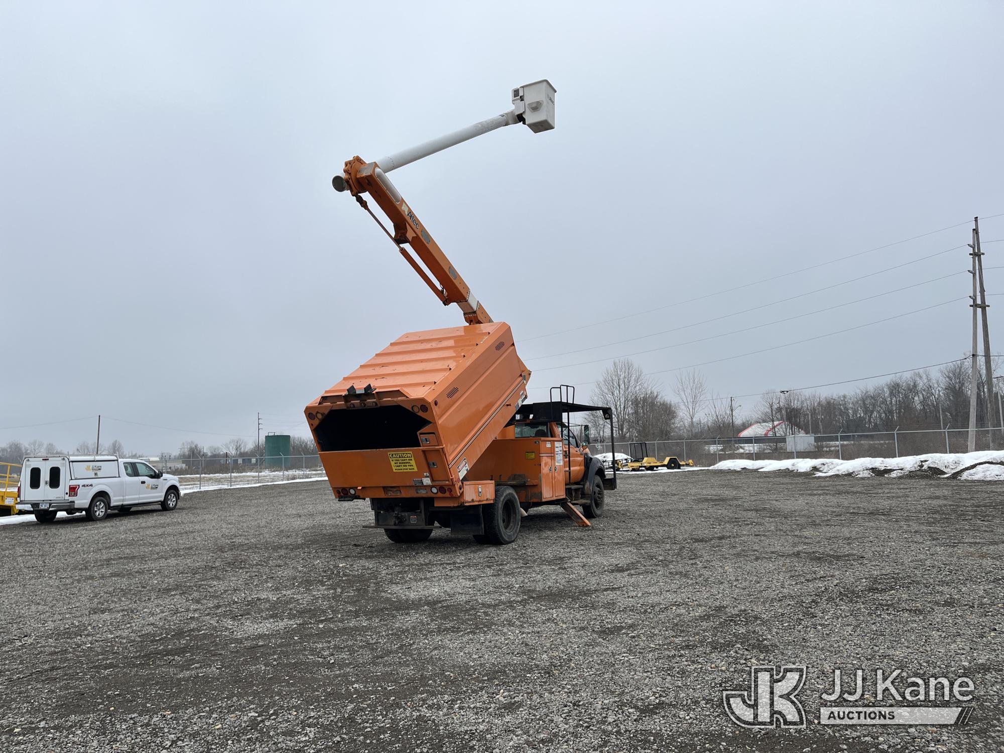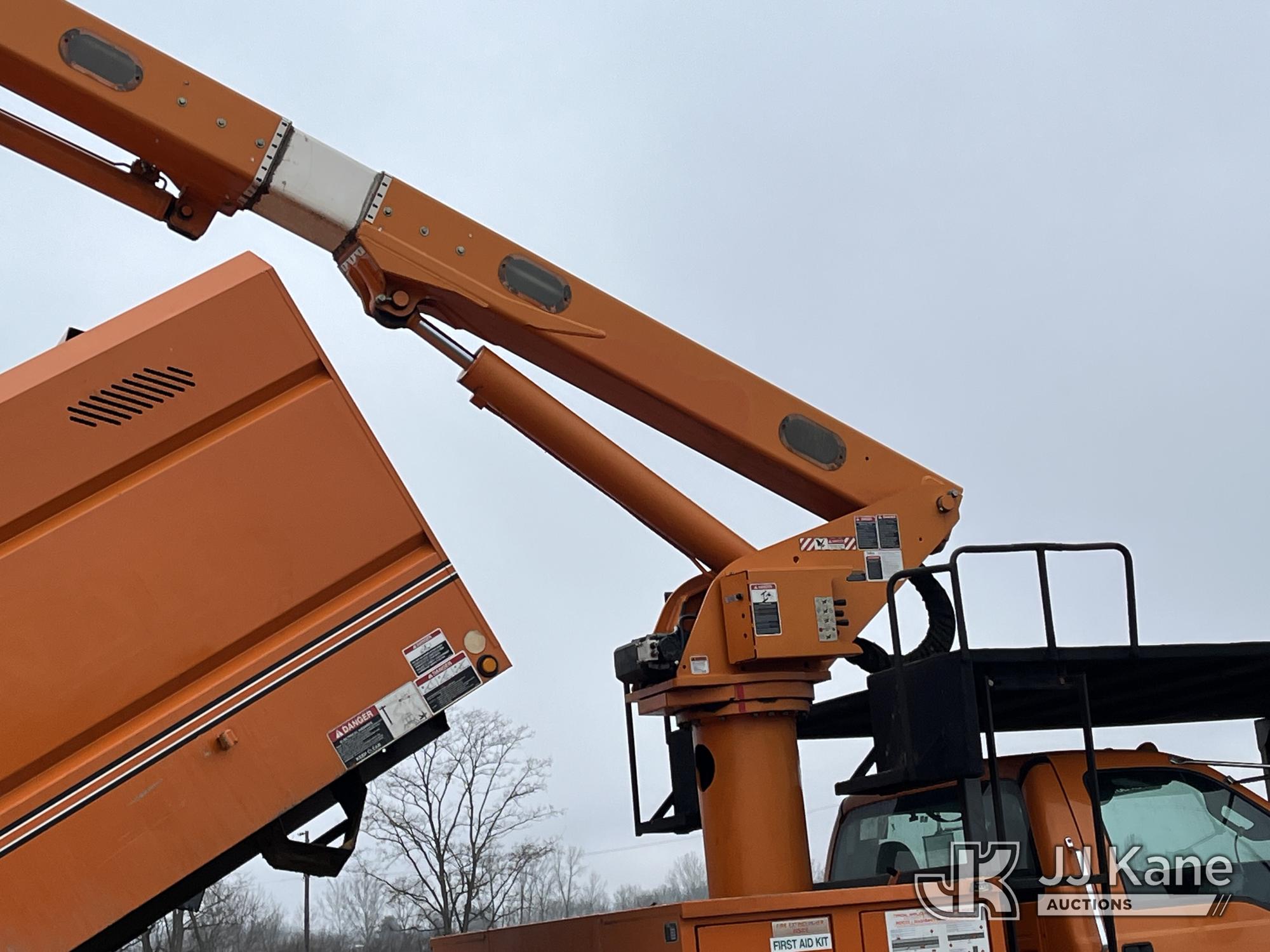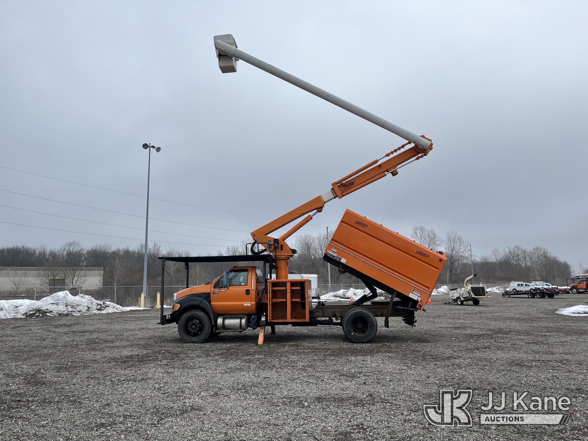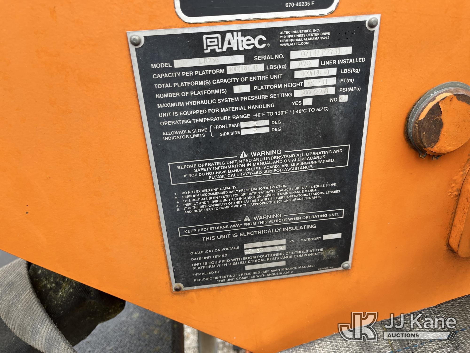 Altec LR756, 61 ft, Over-Center Bucket Truck s/n 0714FF2731, with single-man bucket & 2 hyd outriggers, mounted behind cab on 2013 Ford F-750 Chipper Dump Truck, 6.7L L6 diesel, Auto, (85,238 miles) (Runs & Moves, Engine Light On, Engine Wrench Light On, Upper Operates, Out Rigger Lever Missing, Body & Rust Damage) (Seller Stats Transmission Issues kicking out of gear.) This is a Titled Item*