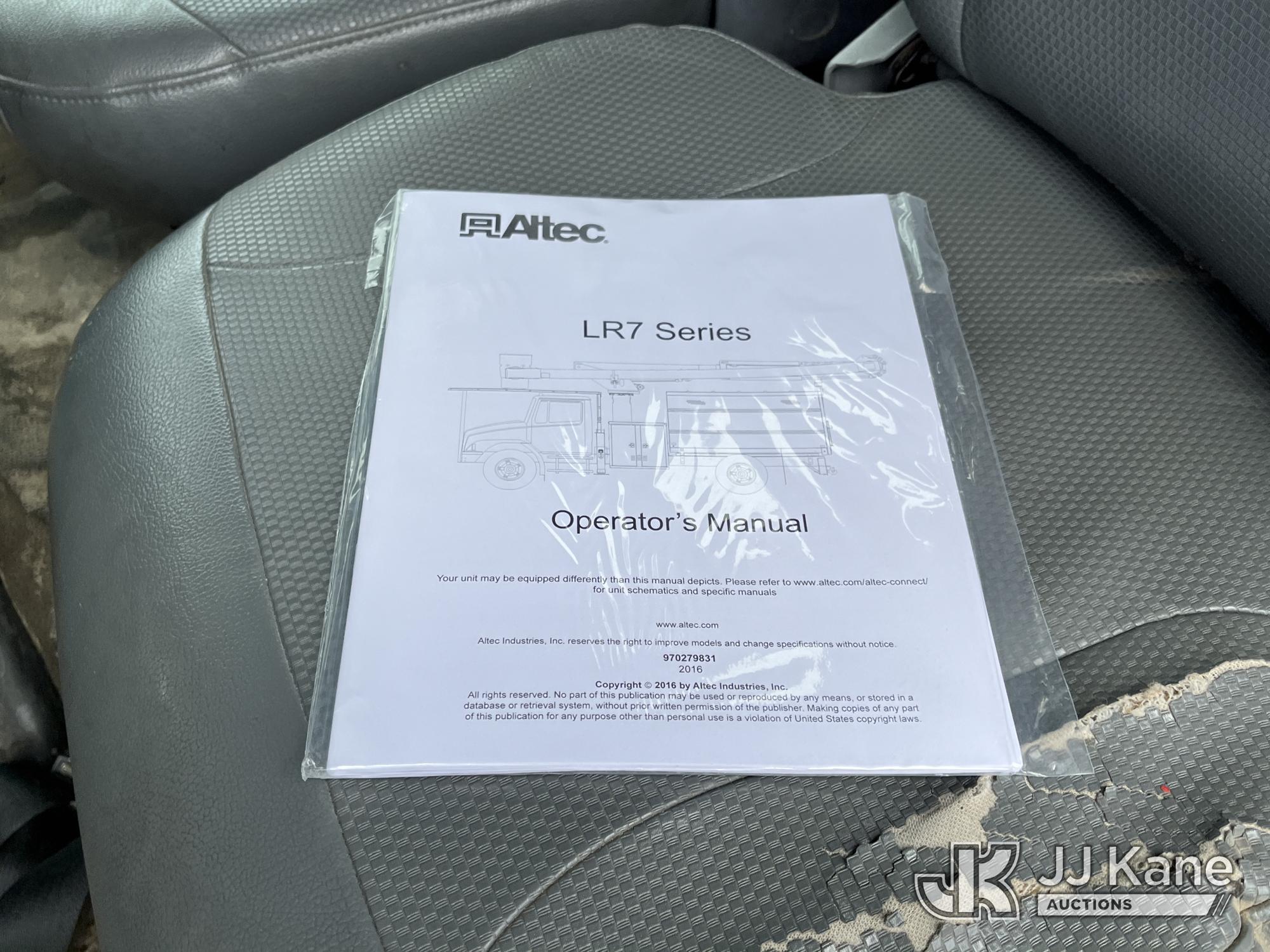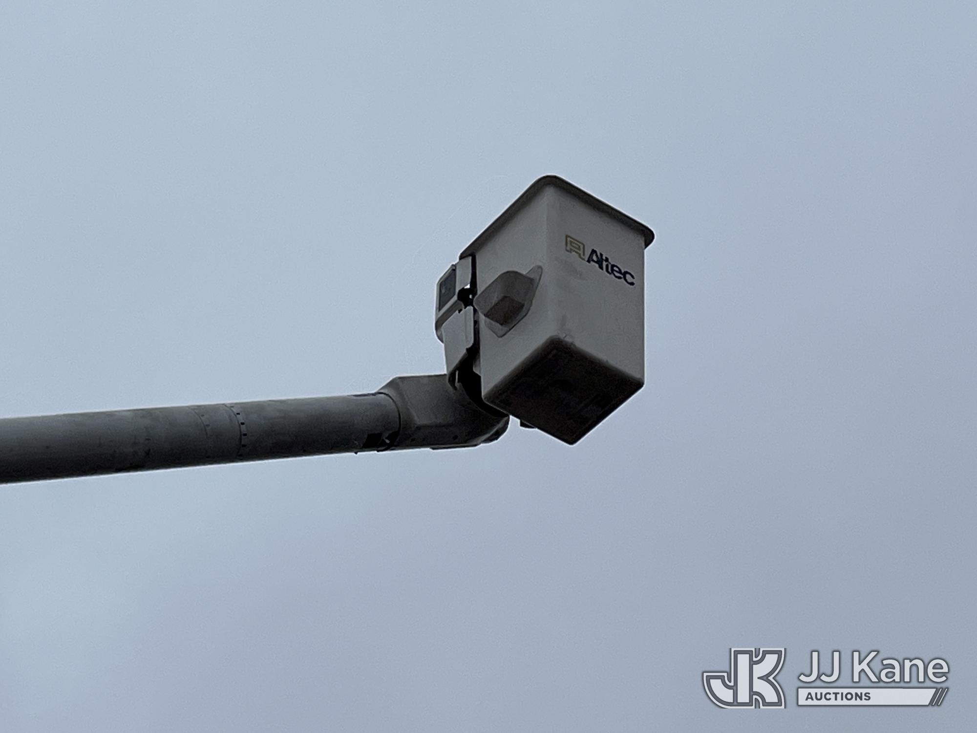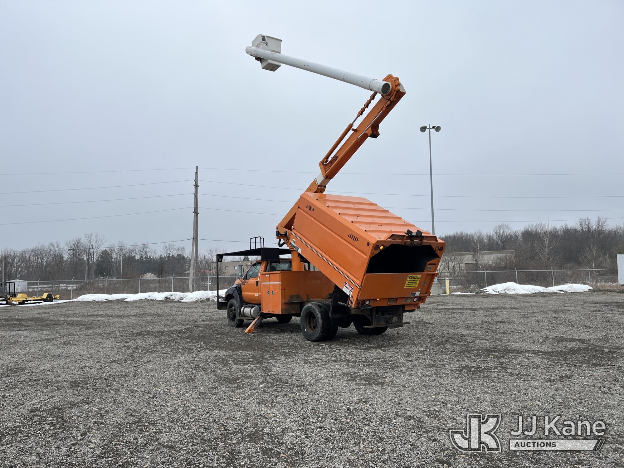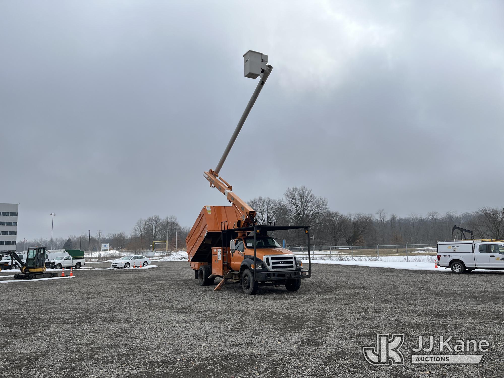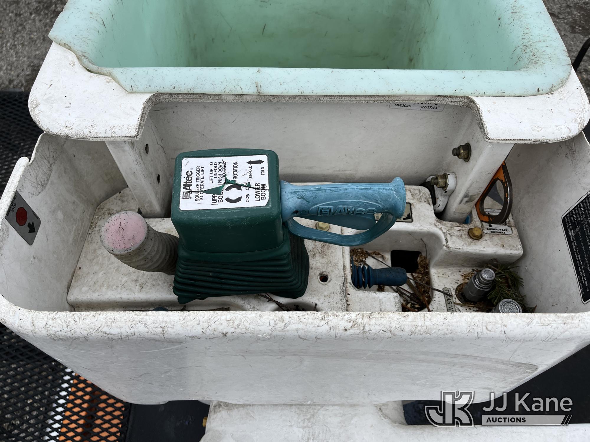Altec LR756, 61 ft, Over-Center Bucket Truck s/n 0714FF2731, with single-man bucket & 2 hyd outriggers, mounted behind cab on 2013 Ford F-750 Chipper Dump Truck, 6.7L L6 diesel, Auto, (85,238 miles) (Runs & Moves, Engine Light On, Engine Wrench Light On, Upper Operates, Out Rigger Lever Missing, Body & Rust Damage) (Seller Stats Transmission Issues kicking out of gear.) This is a Titled Item*