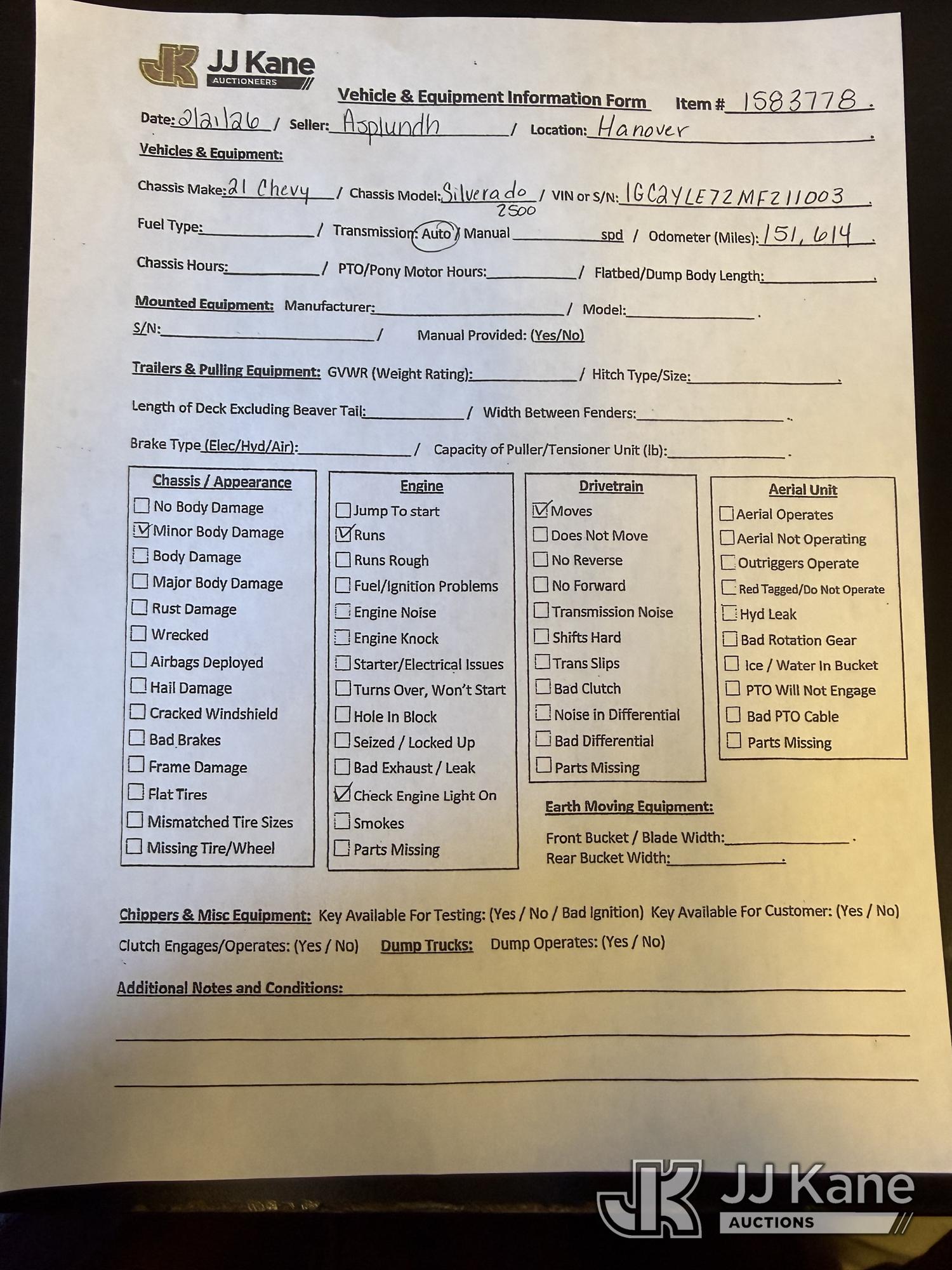 2021 Chevrolet Silverado 2500HD 4x4 Extended-Cab Pickup Truck, 6.6L V8 16V OHV gas, 6-Speed Automatic, A/C, (151,614 miles) (Runs & Moves) (Check Engine Light On, Traction Control Light On, Service Parking Brake Light On, Body Damage) (Seller States: Misses Problem Unknown) This is a Titled Item*