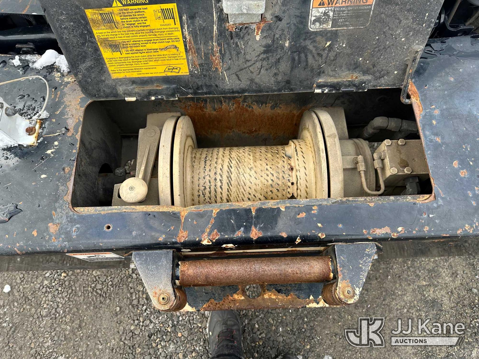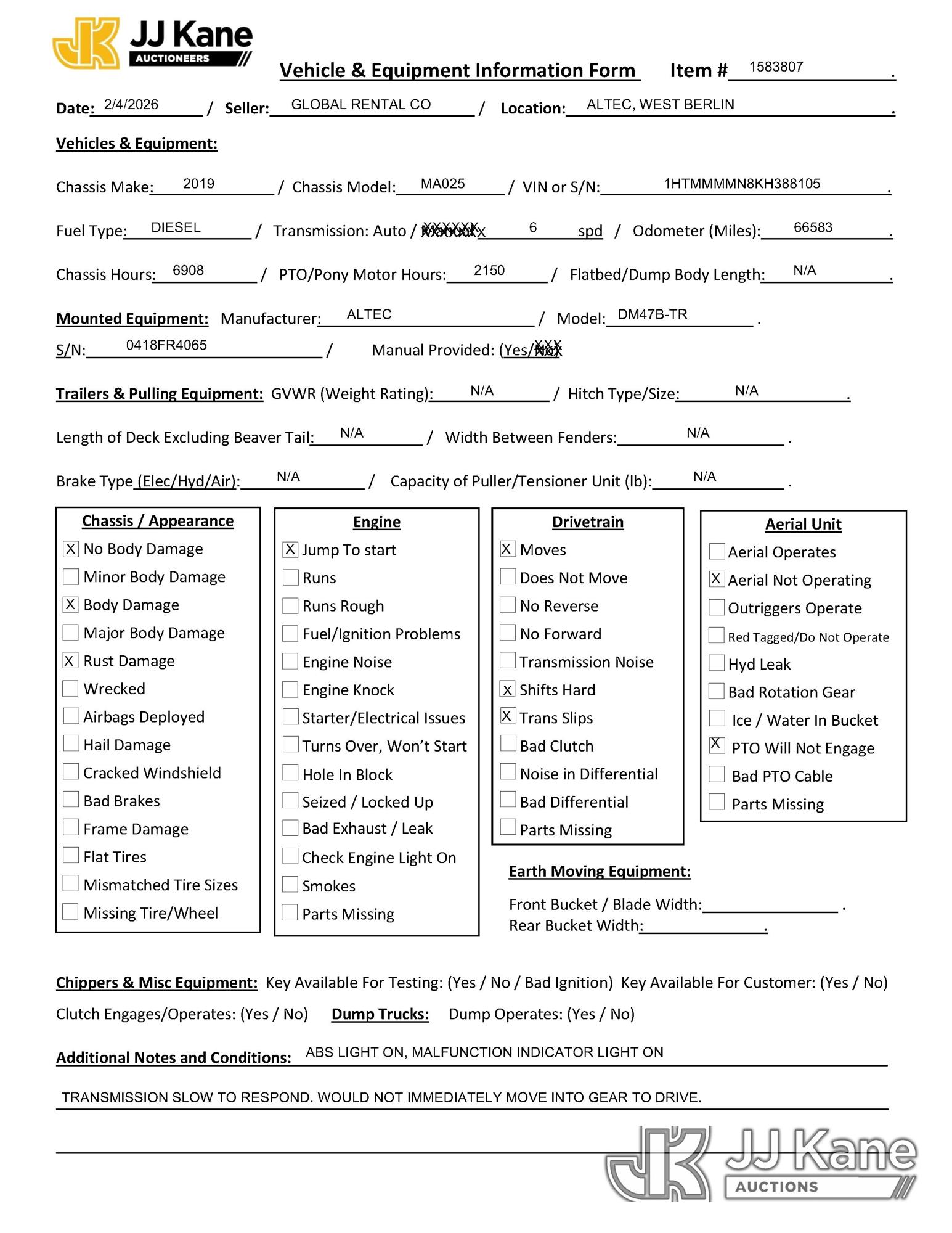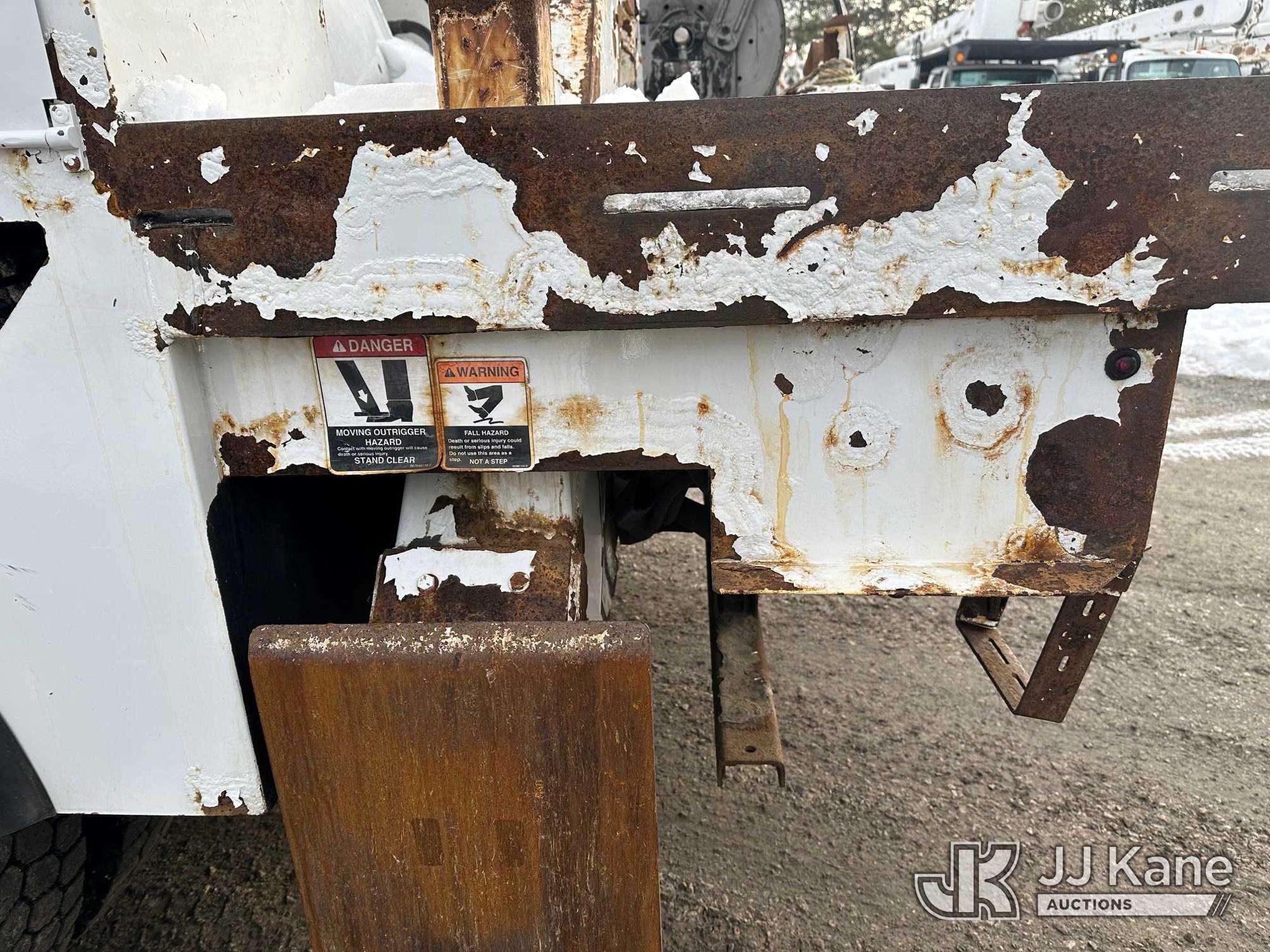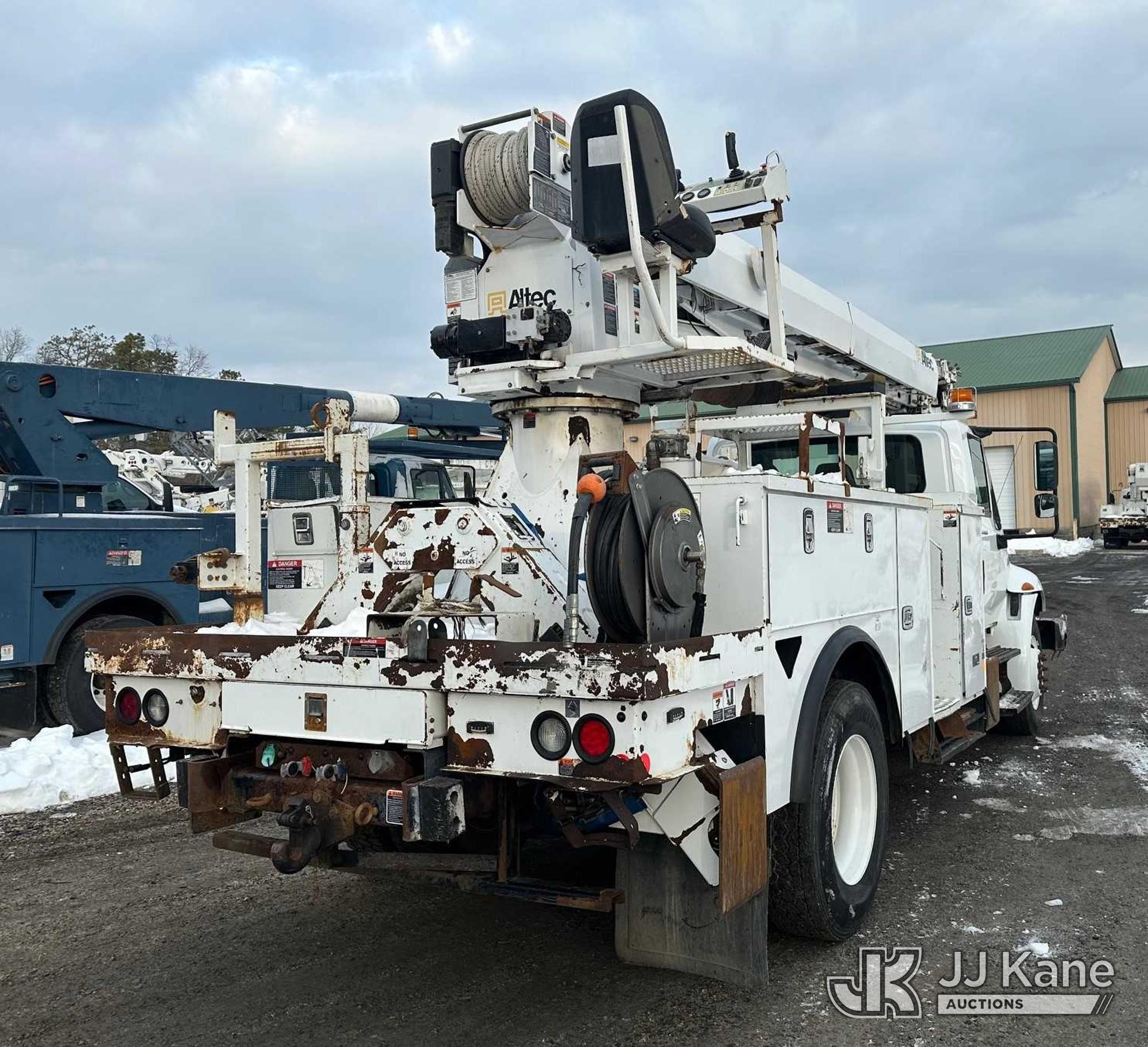 Altec DM47B-TR, 23,790 Lb Digger Derrick s/n 0418FR4065, with 47 ft. sheave height, 3 section hyd boom, 2 spd digger, heel winch, pole guides, riding console & 4 hyd outriggers, rear mounted on 2019 International 4300 Utility Truck, 6.7L diesel, 4X2, Auto, A/C, with front winch, capstan, (66,583 miles) (Jump To Start, Runs, Moves, Shifts Hard, Trans Slips, Upper Not Operating, PTO Will Not Engage, ABS Light On, Malfunction Indicator Light On, Transmission Slow To Respond, Body/Rust Damage) This is a Titled Item*