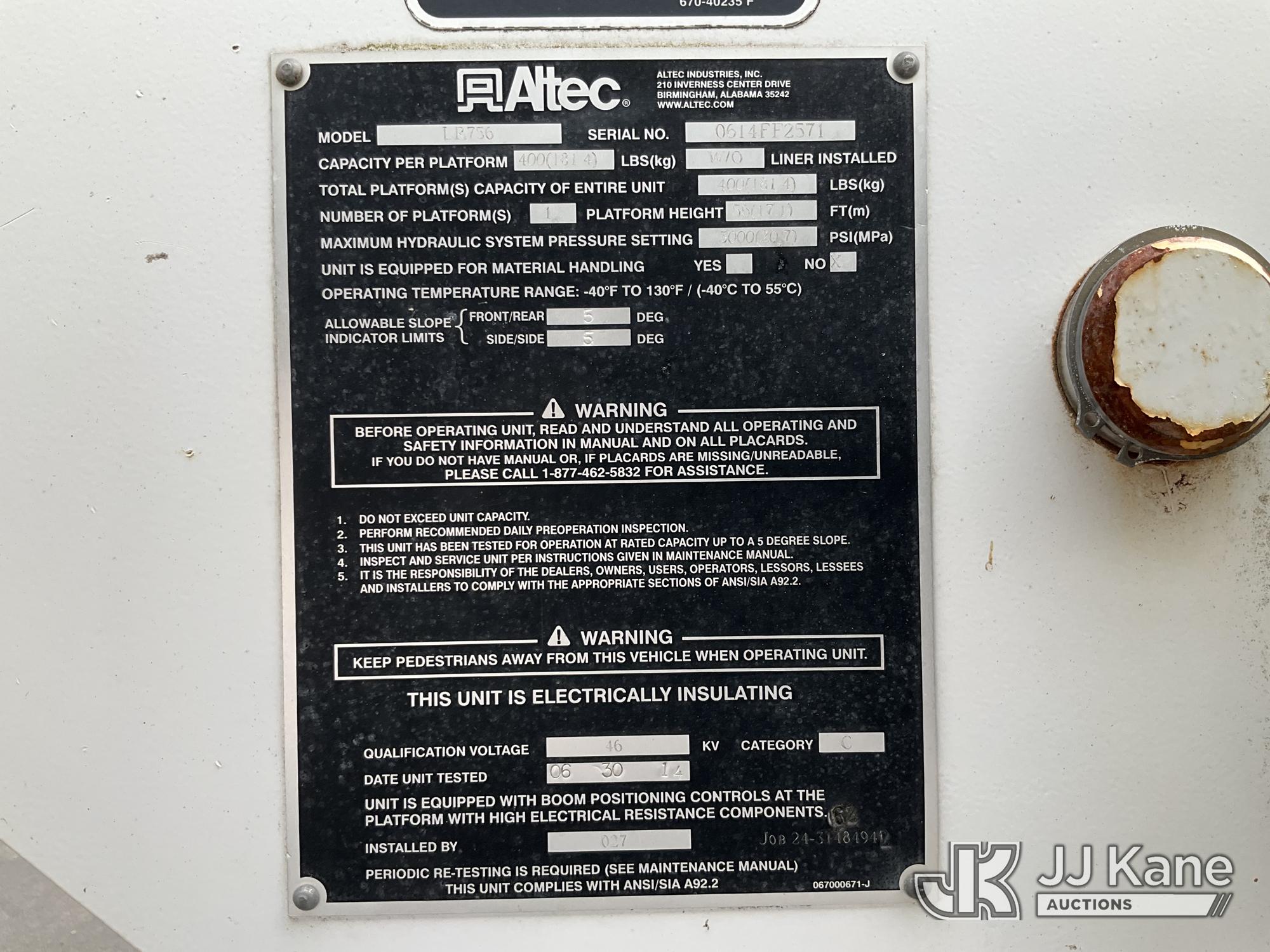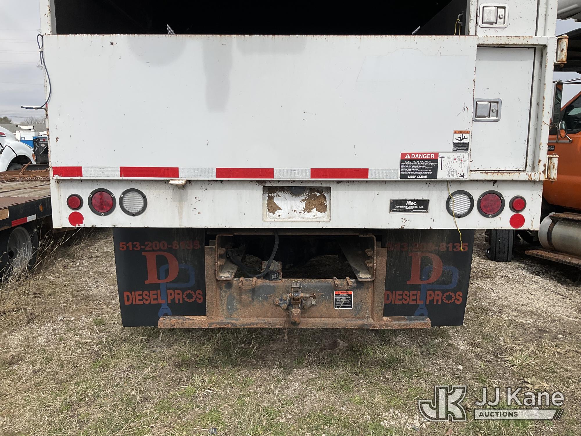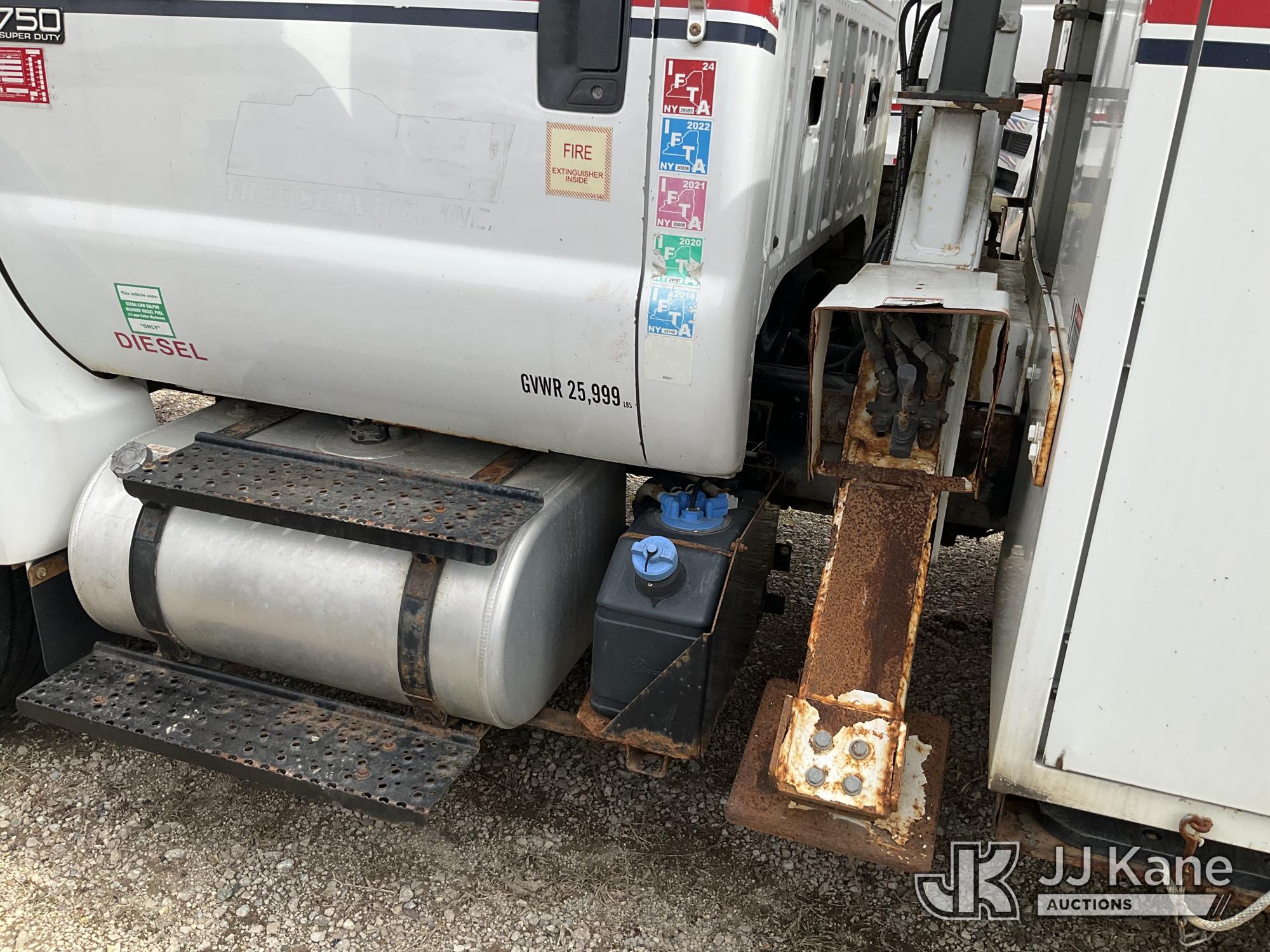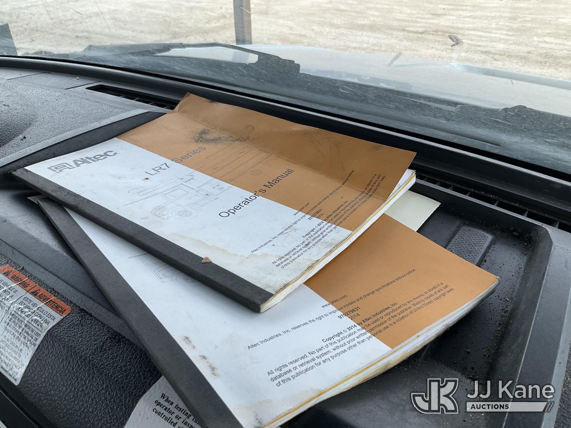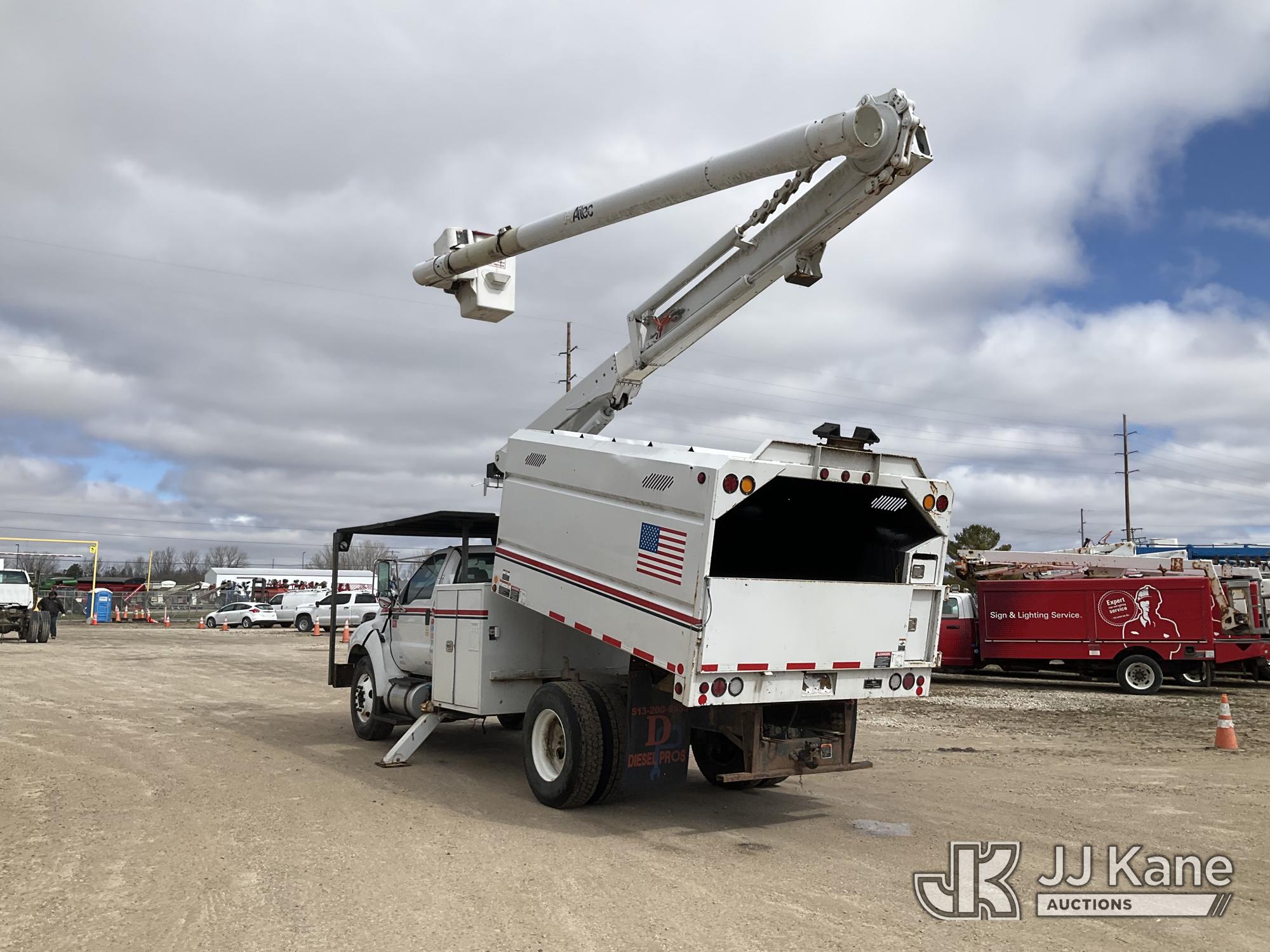 Altec LR756, 61 ft, Over-Center Bucket Truck s/n 0614FF2571, with single-man bucket & 2 hyd outriggers, mounted behind cab on 2015 Ford F-750 Chipper Dump Truck, Cummins 6.7L 4X2, diesel, 6-spd, A/C, with 25,999 lbs GVWR, (54,164 miles) (Runs, Moves, Operates) (Jump to Start, Engine Light, Engine Light, Hydraulic Leak at Bucket, Wire Harnesses Dangling Below Cab, Some Components Missing In Engine Bay)) This is a Titled Item*