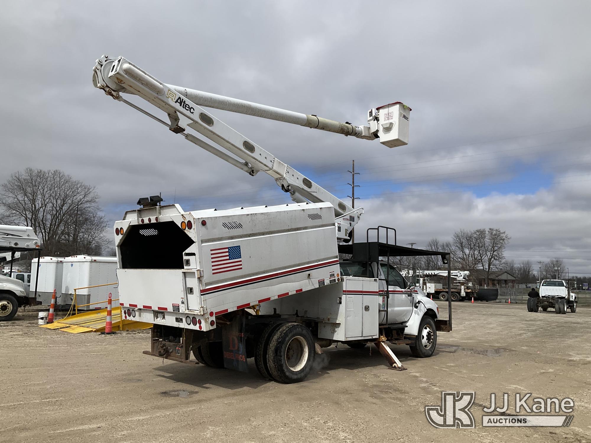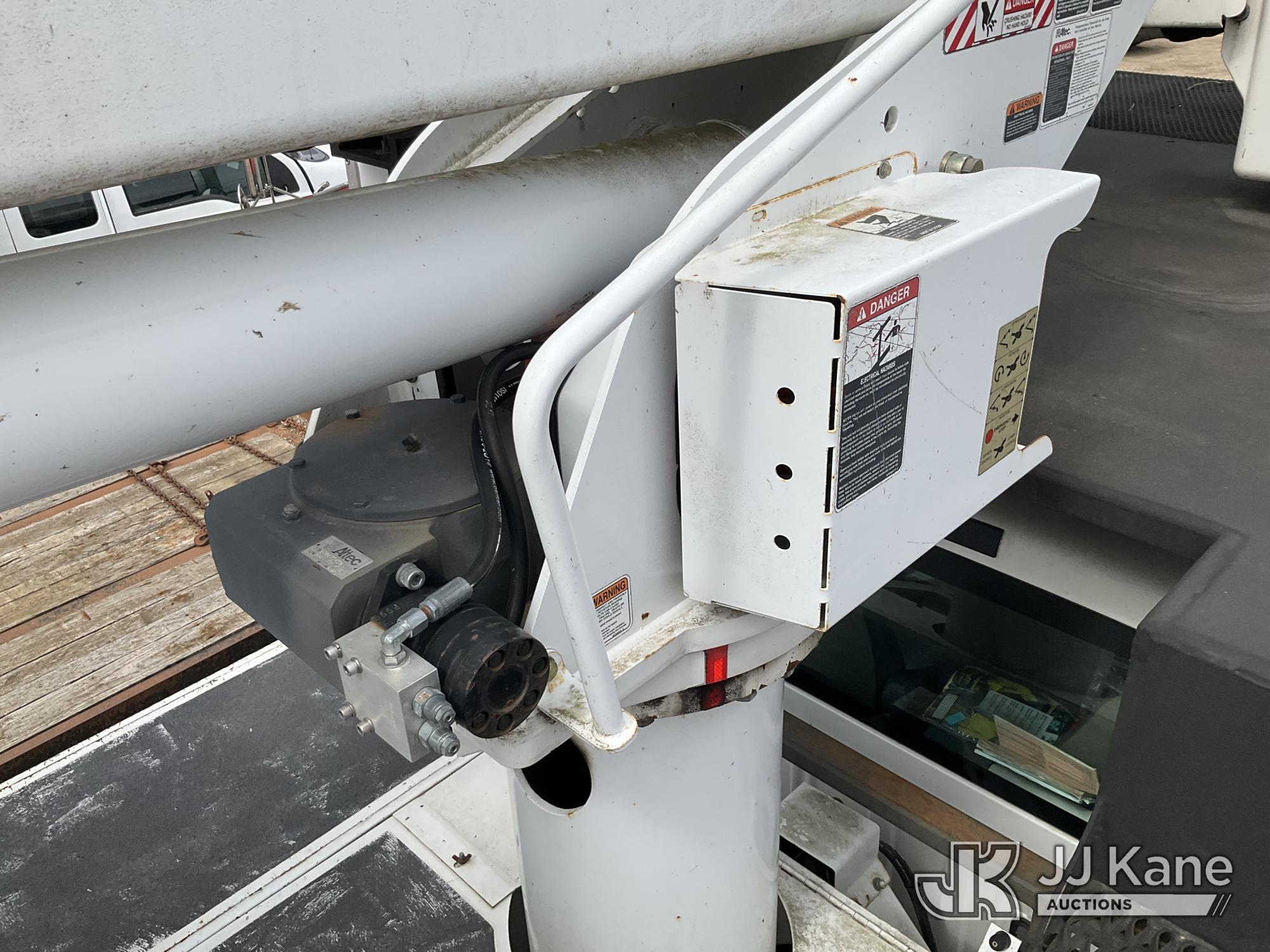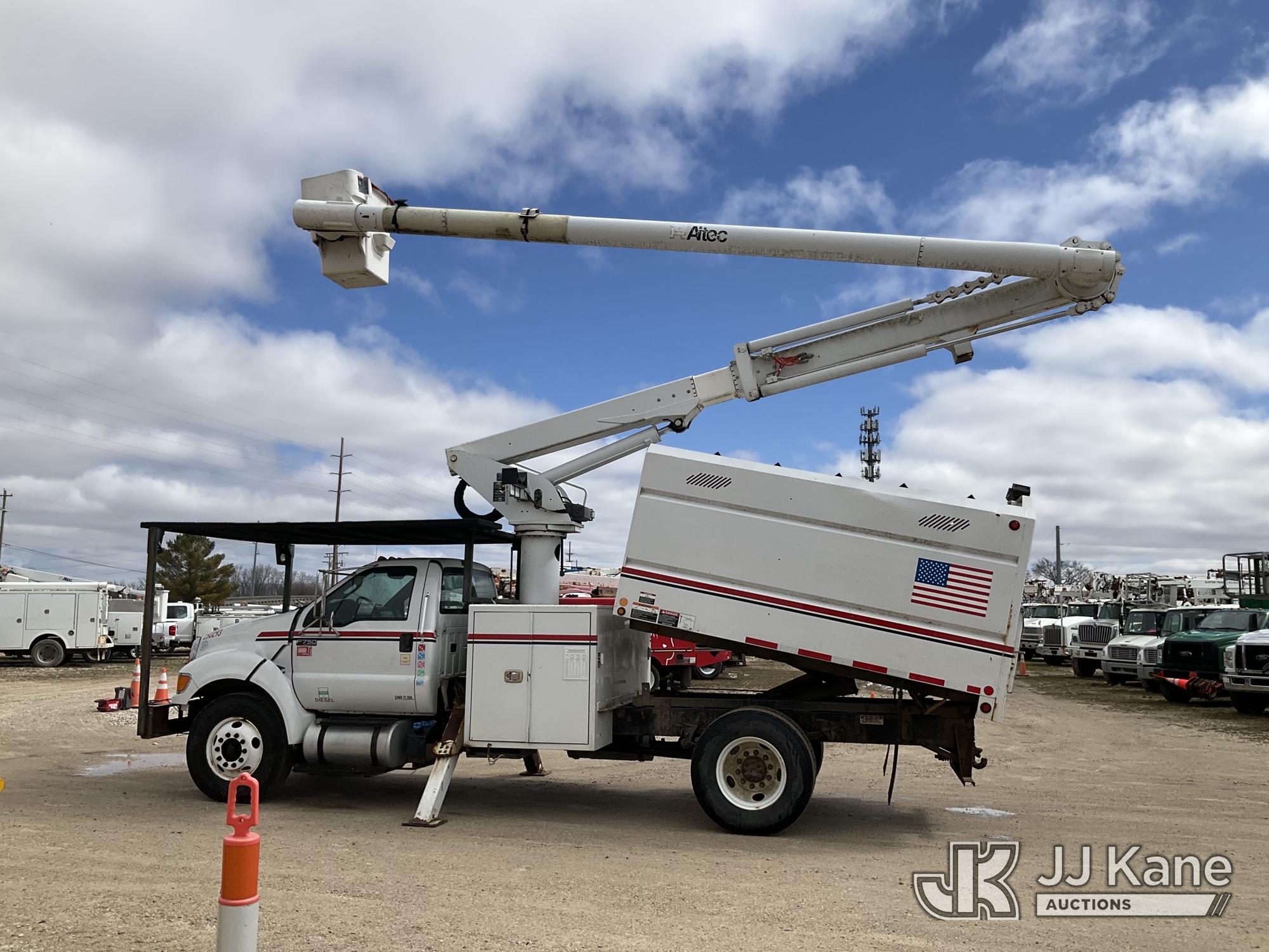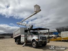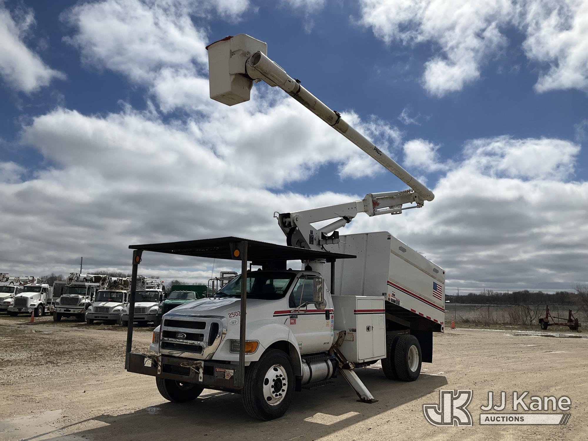 Altec LR756, 61 ft, Over-Center Bucket Truck s/n 0614FF2571, with single-man bucket & 2 hyd outriggers, mounted behind cab on 2015 Ford F-750 Chipper Dump Truck, Cummins 6.7L 4X2, diesel, 6-spd, A/C, with 25,999 lbs GVWR, (54,164 miles) (Runs, Moves, Operates) (Jump to Start, Engine Light, Engine Light, Hydraulic Leak at Bucket, Wire Harnesses Dangling Below Cab, Some Components Missing In Engine Bay)) This is a Titled Item*