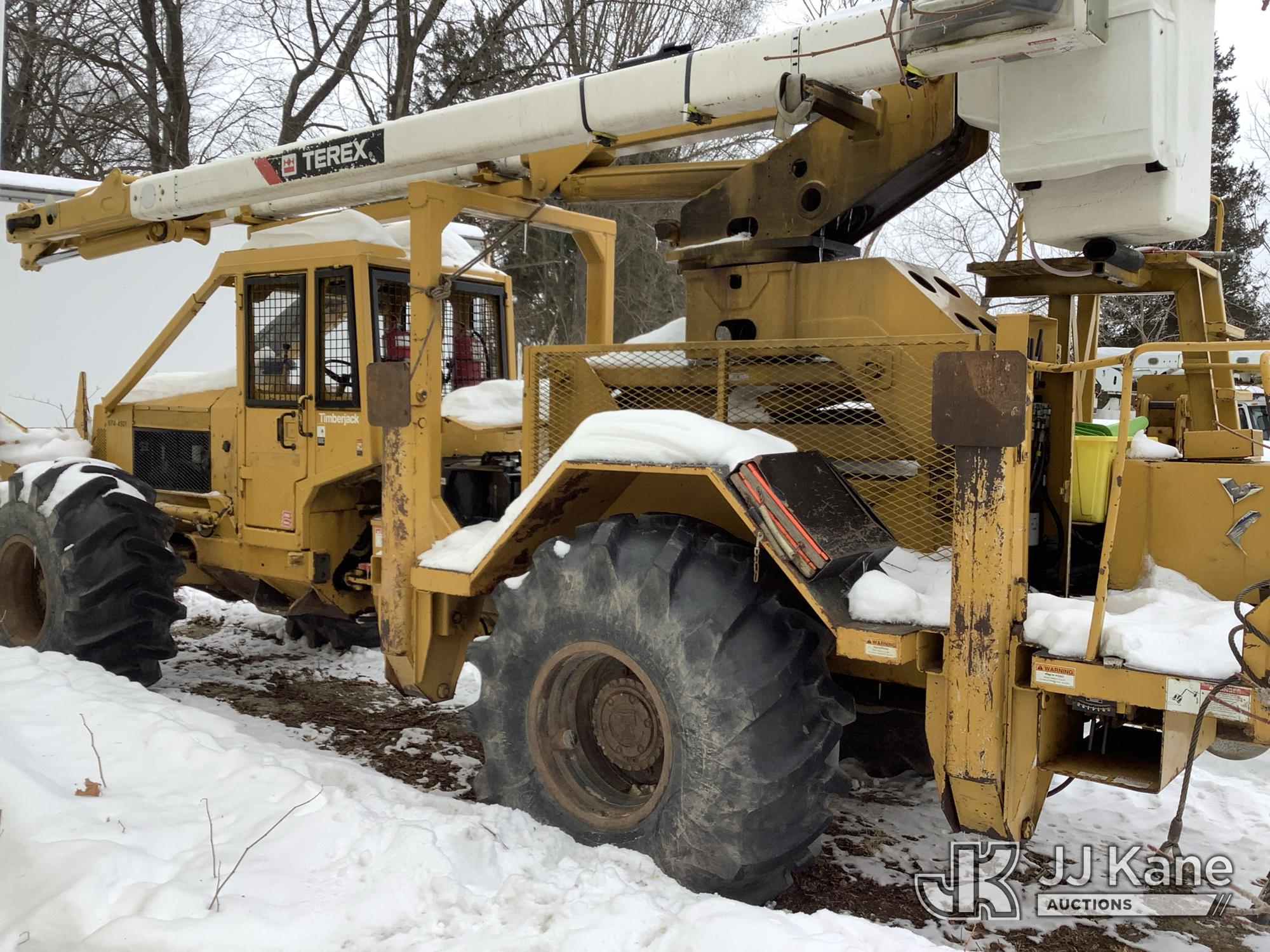 Terex XT60/70, 75 ft, Over-Center Elevator Bucket s/n 2140151124, with single-man bucket (4114 PTO Hours, mounted on 2014 Timberjack 460 Articulating Log Skidder, s/n 00000000000CE4374, Kubota diesel, Hydrostatic, with push blade & EROPS, (Starts But Won’t Stay Running, Pony Motor Starts, But Won’t Stay Running, Upper Condition Unknown) (Seller States: Entire Hydraulic System Needs Replaced For The Boom And Outriggers) (Reads 897 hours)*