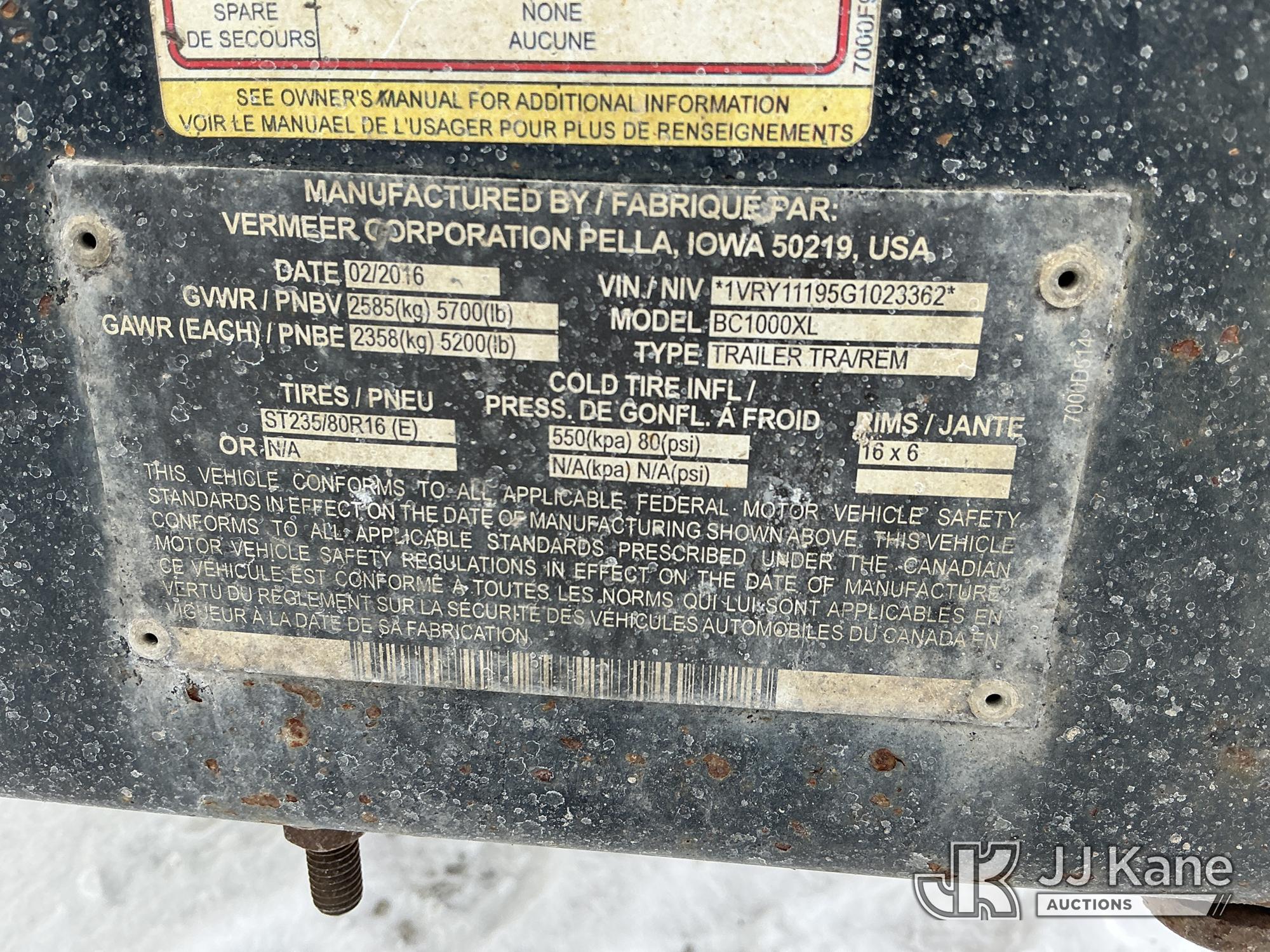 2016 Vermeer BC1000XL Chipper (12in Disc), s/n 1VRY11195G1023362, gas, (No Title) (Runs) (No Key, Body Damage) (Reads 889 hours)*