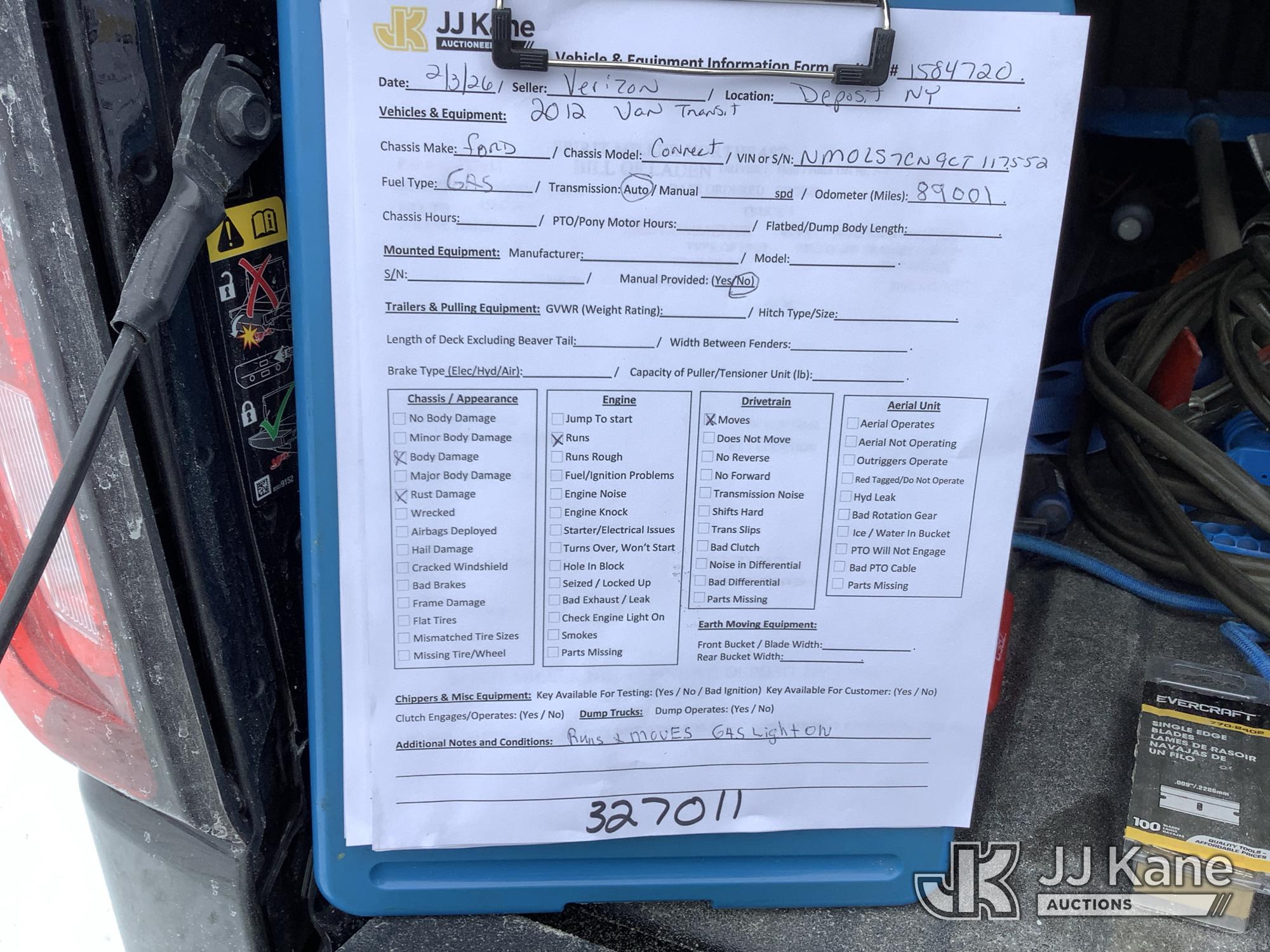 2012 Ford Transit Connect XL with Side and Rear Door Glass Cargo Van, 4-cyl gas, FWD, Auto, A/C, (89,001 miles) (Runs & Moves) (Fuel & Tire Pressure Light On) This is a Titled Item*