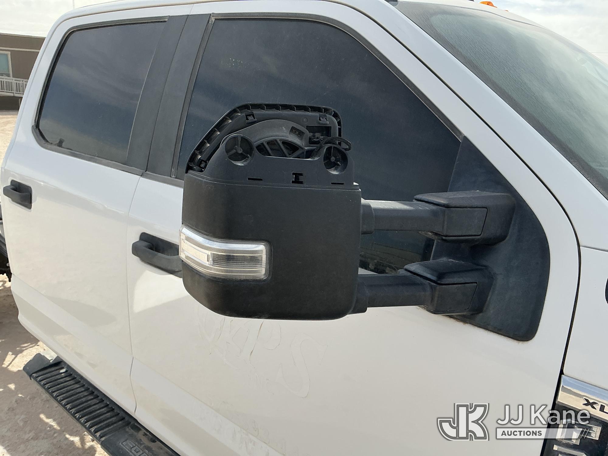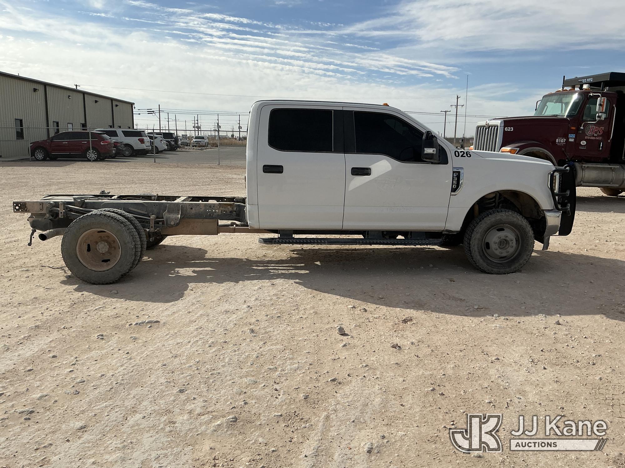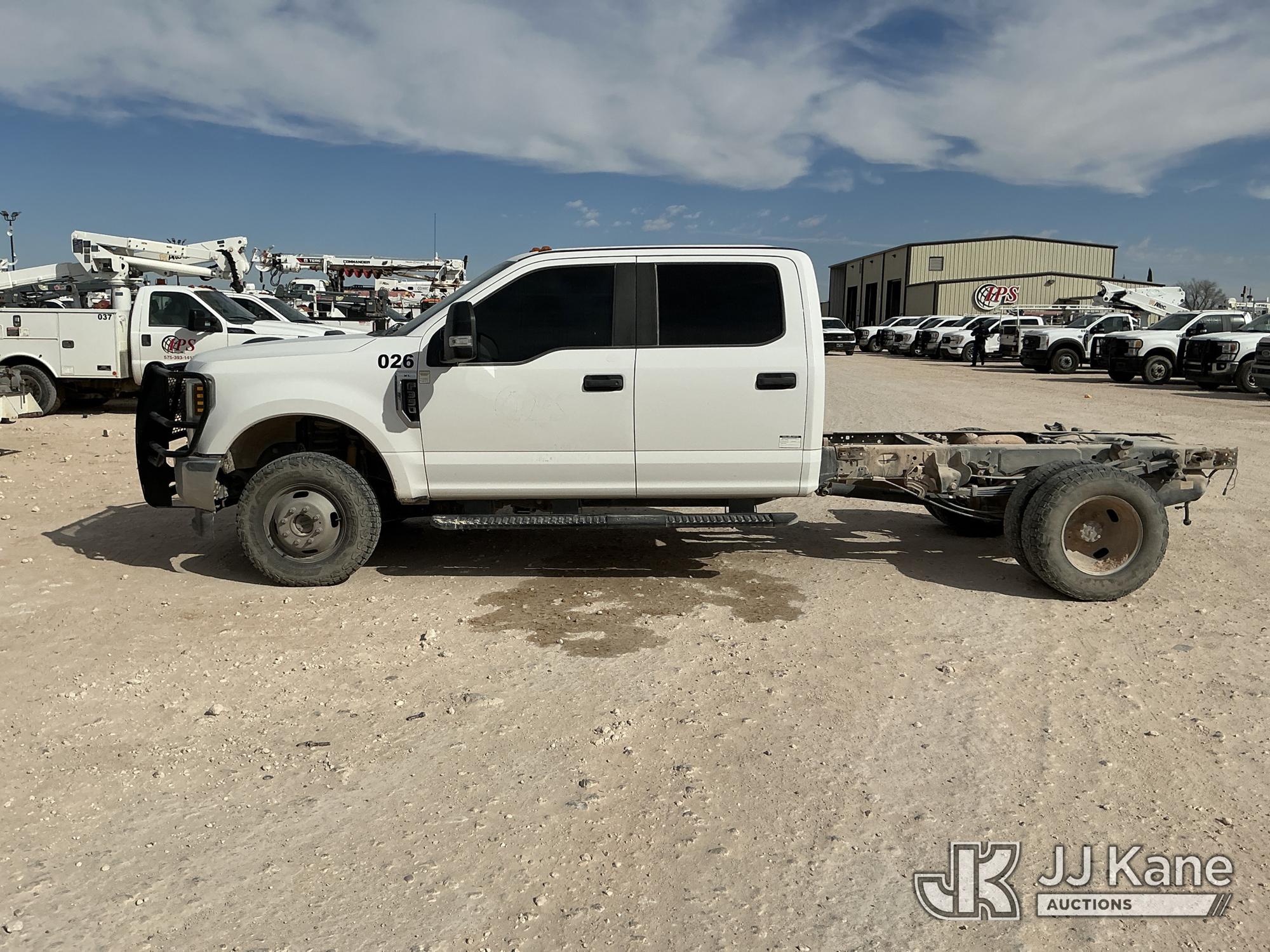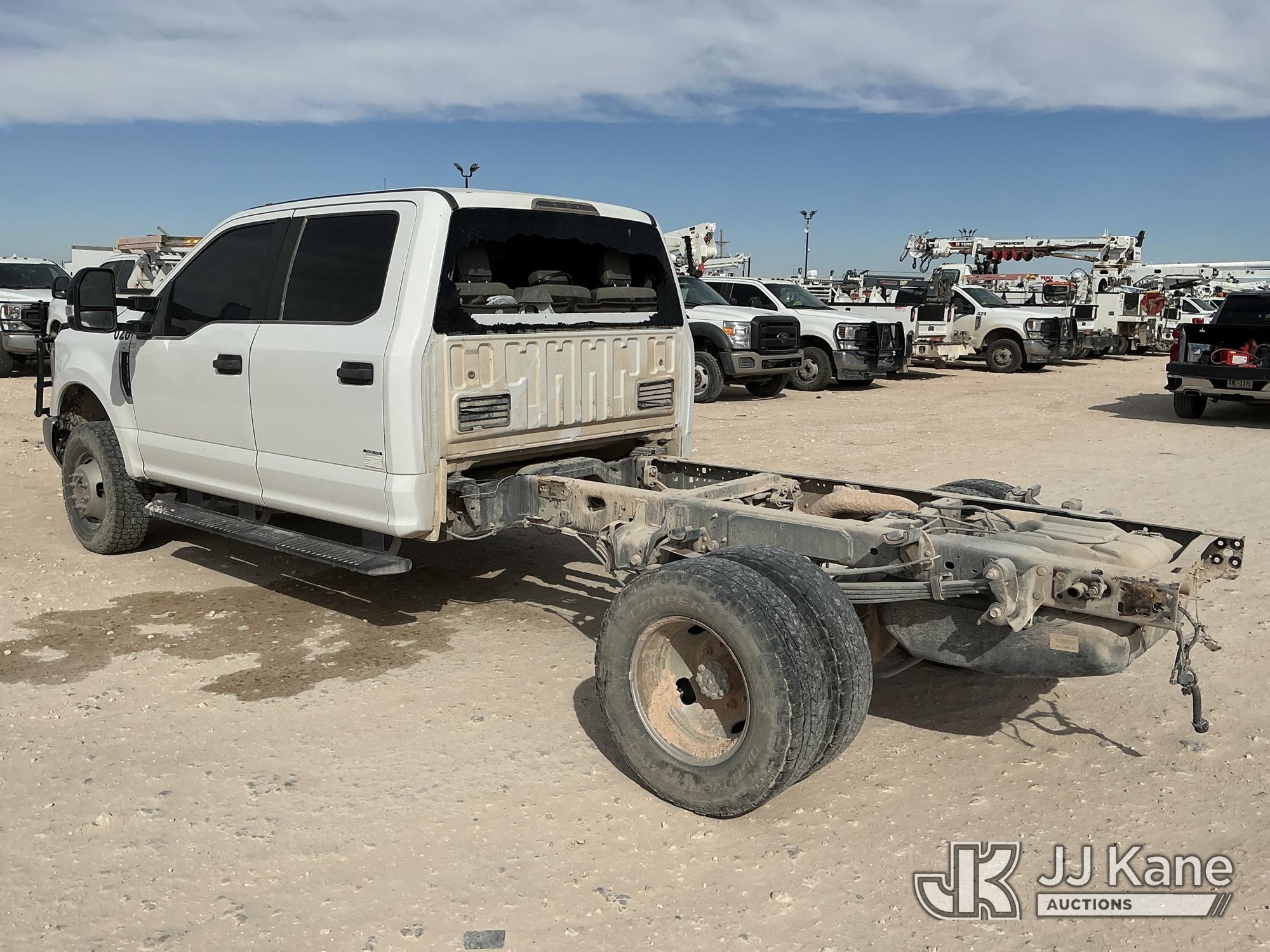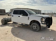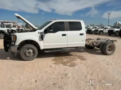 2019 Ford F-350 SD Crew-Cab Chassis, 8-cyl gas, 4wd, 6-Speed Automatic, A/C, with Heavy Duty Front Bumper w/ Grill Guard, (259,501 miles) (Runs & Moves) (Jump To Start, Check Engine Light On, Engine Knocks While In Park, Windshield Cracked, Busted Rear Window, Paint & Body Damage) This is a Titled Item*