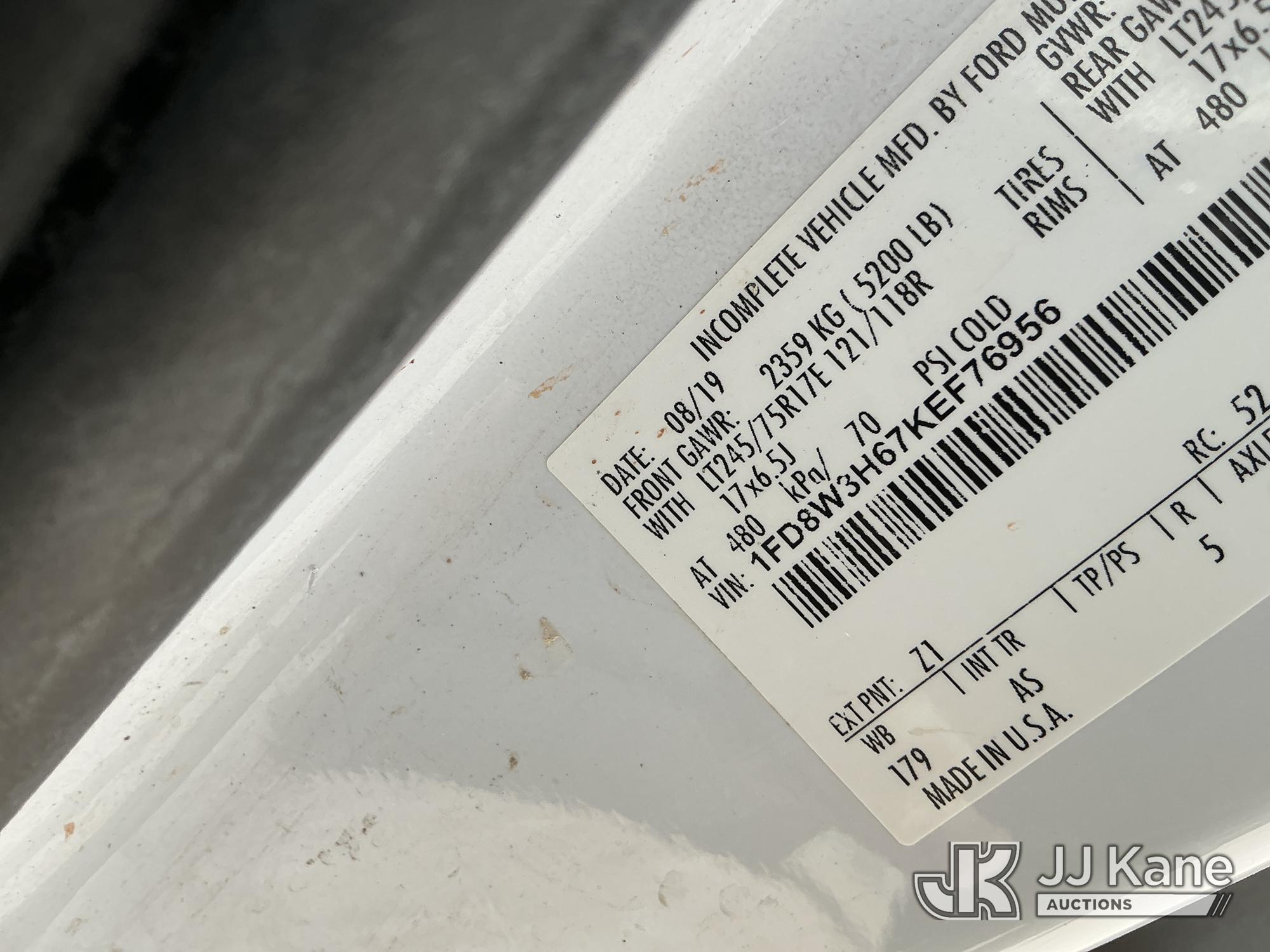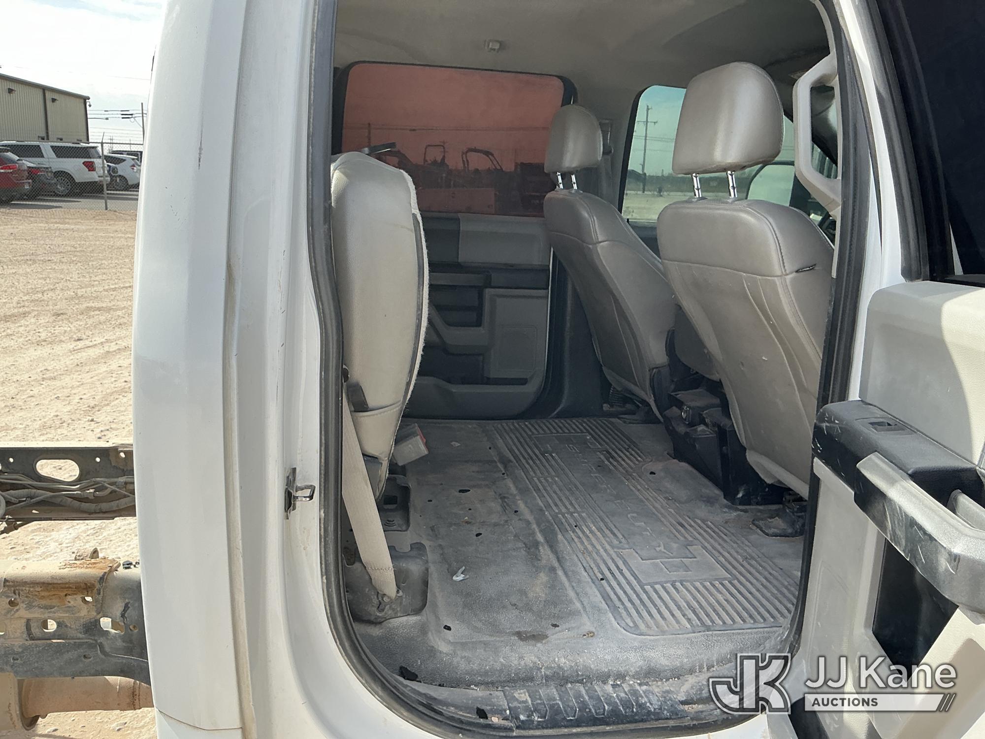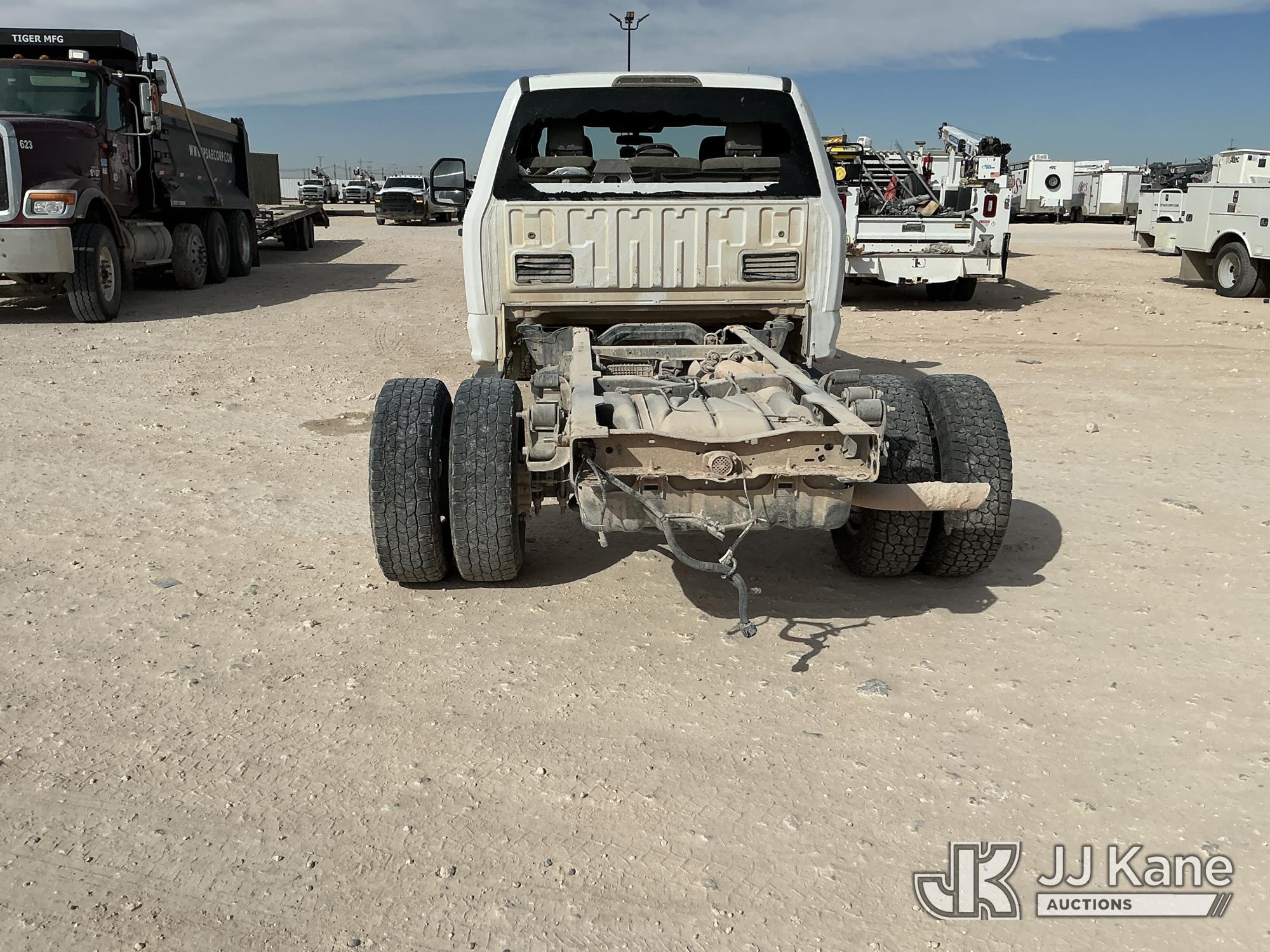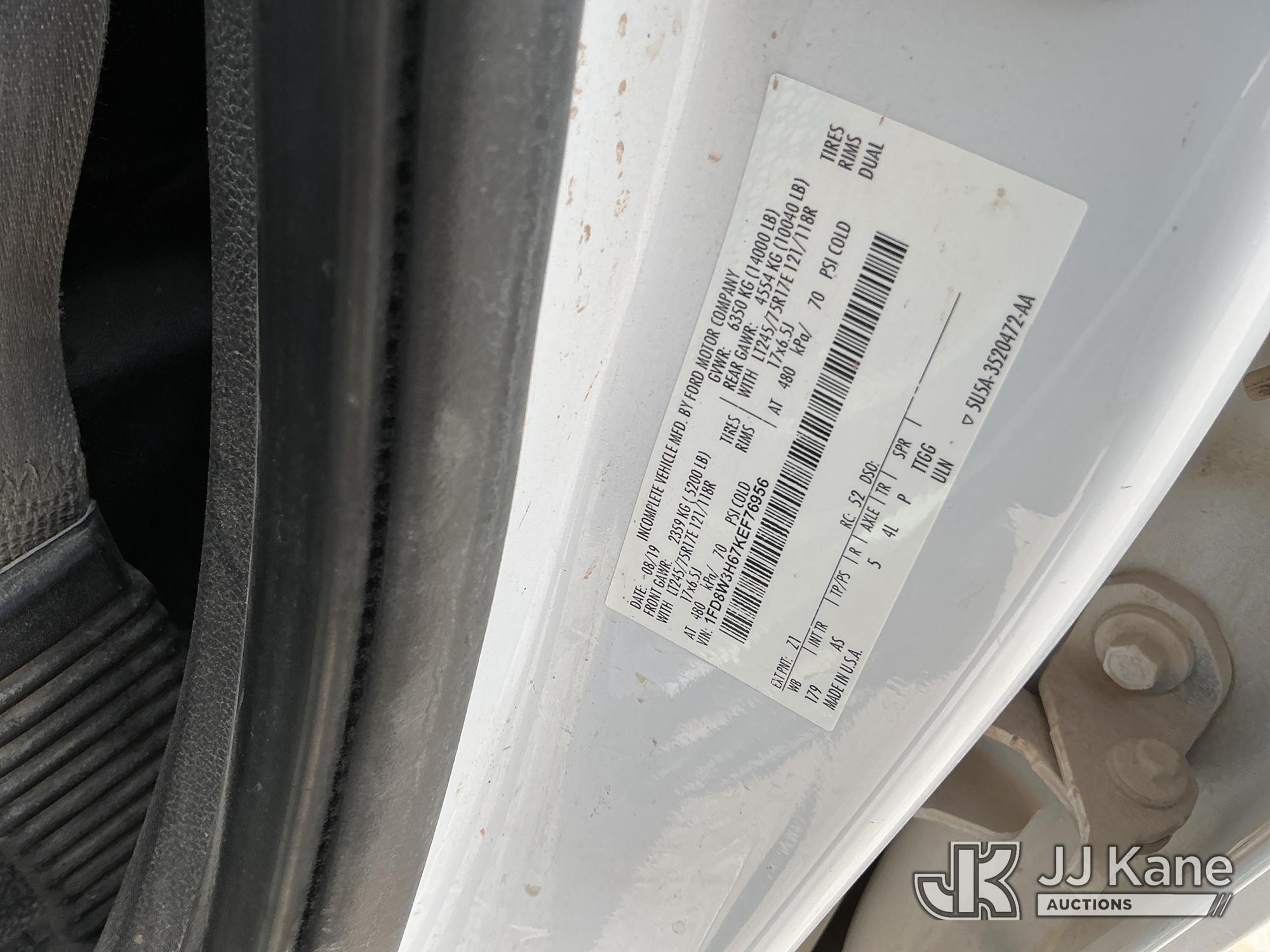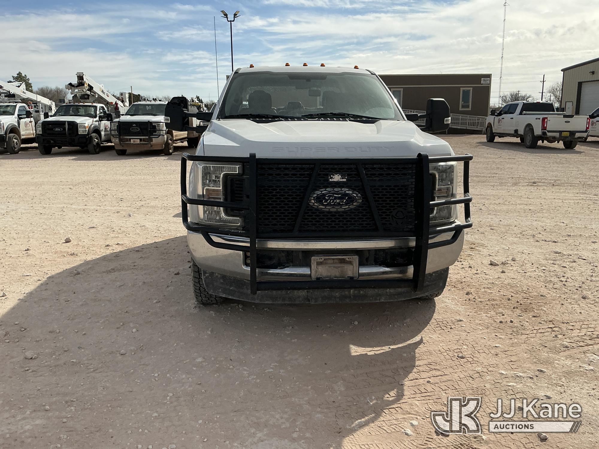 2019 Ford F-350 SD Crew-Cab Chassis, 8-cyl gas, 4wd, 6-Speed Automatic, A/C, with Heavy Duty Front Bumper w/ Grill Guard, (259,501 miles) (Runs & Moves) (Jump To Start, Check Engine Light On, Engine Knocks While In Park, Windshield Cracked, Busted Rear Window, Paint & Body Damage) This is a Titled Item*