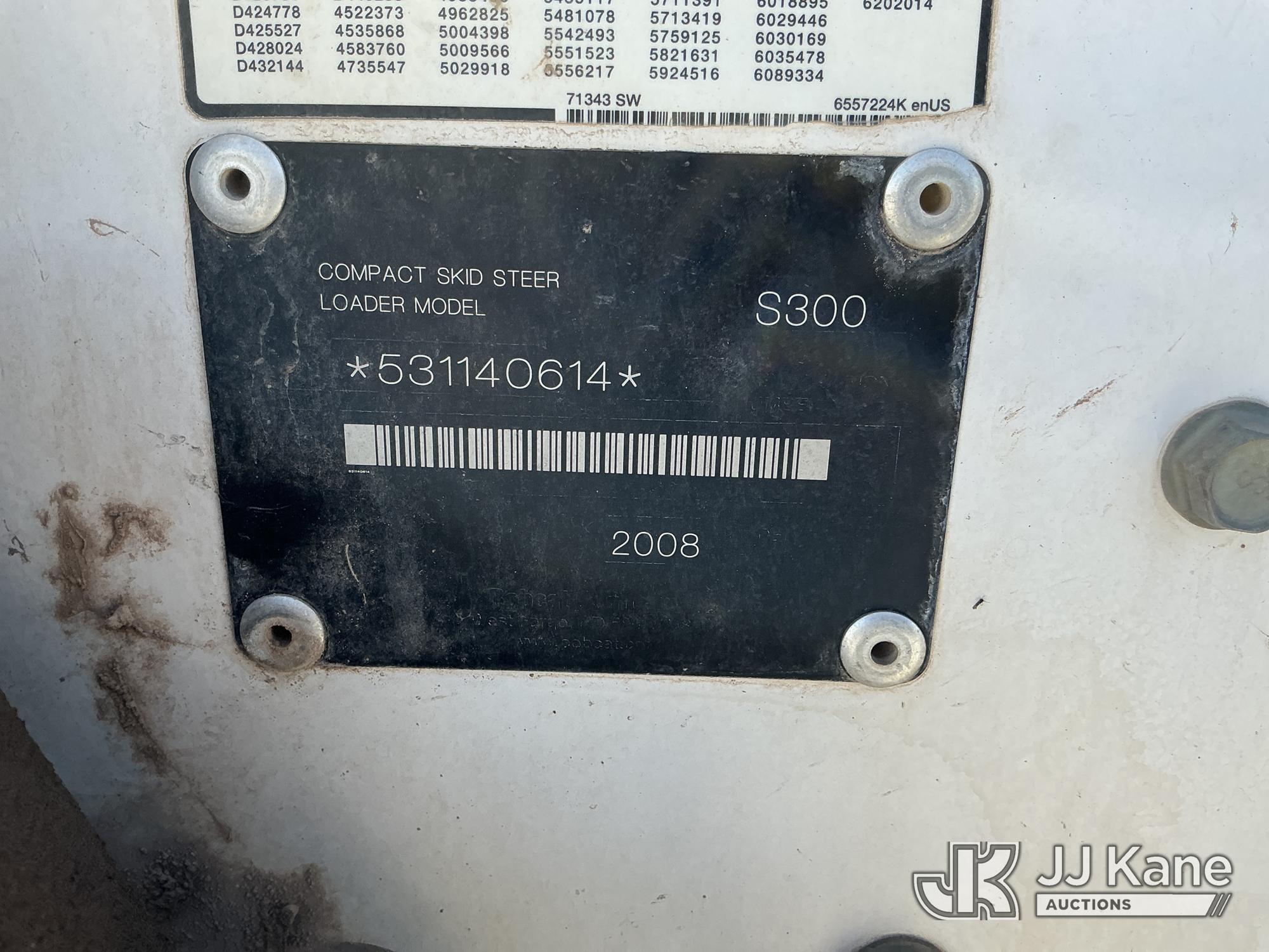 2008 Bobcat S300 Rubber Tired Skid Steer Loader, s/n 531140614, diesel, Hydrostatic, with Rops, Hand & Foot Controls, Auxiliary Hydraulic, Smooth Bucket, (Runs & Operates) ( Rear Door Does Not Release To Open) (Reads 2,567 hours)*