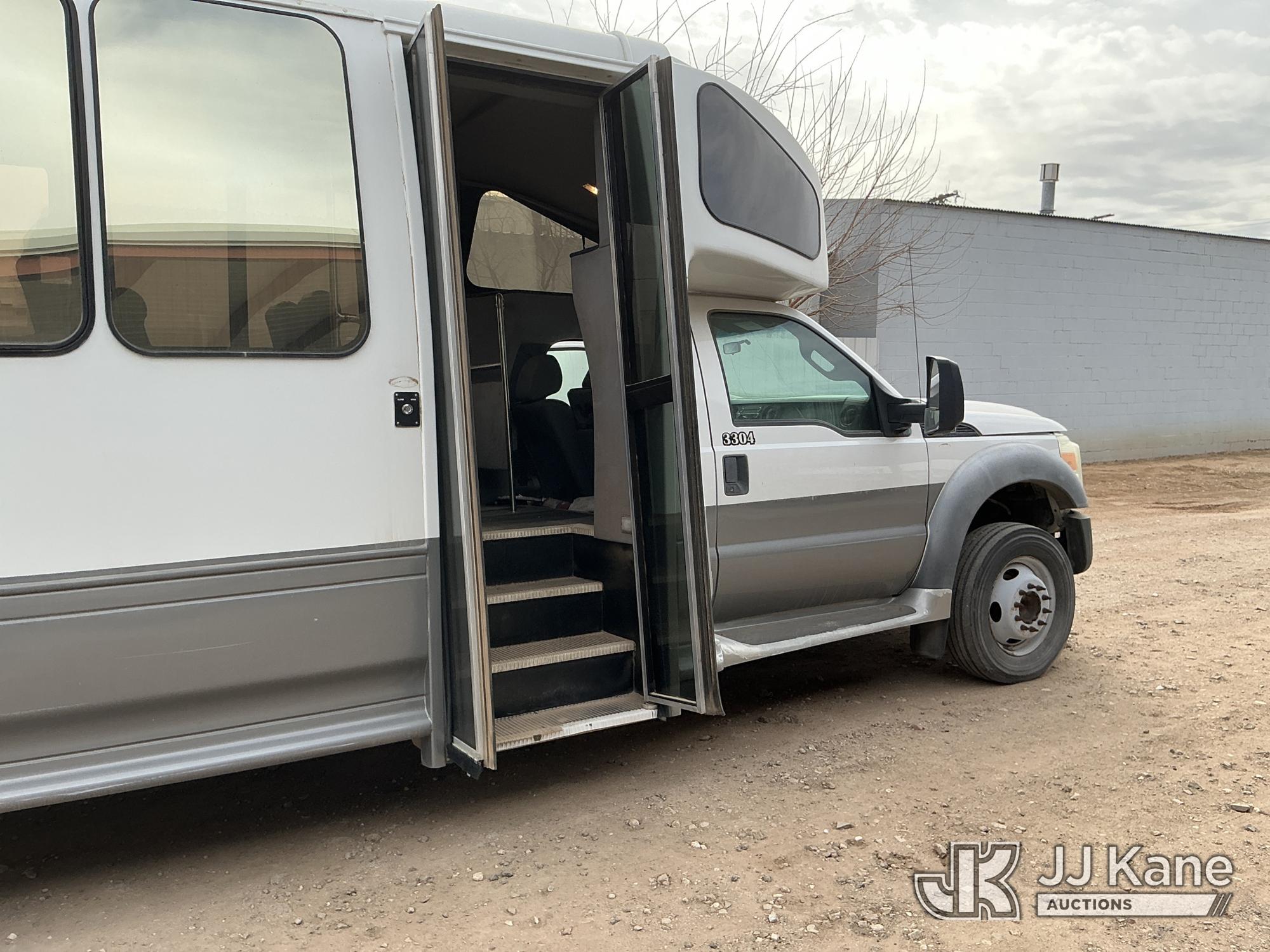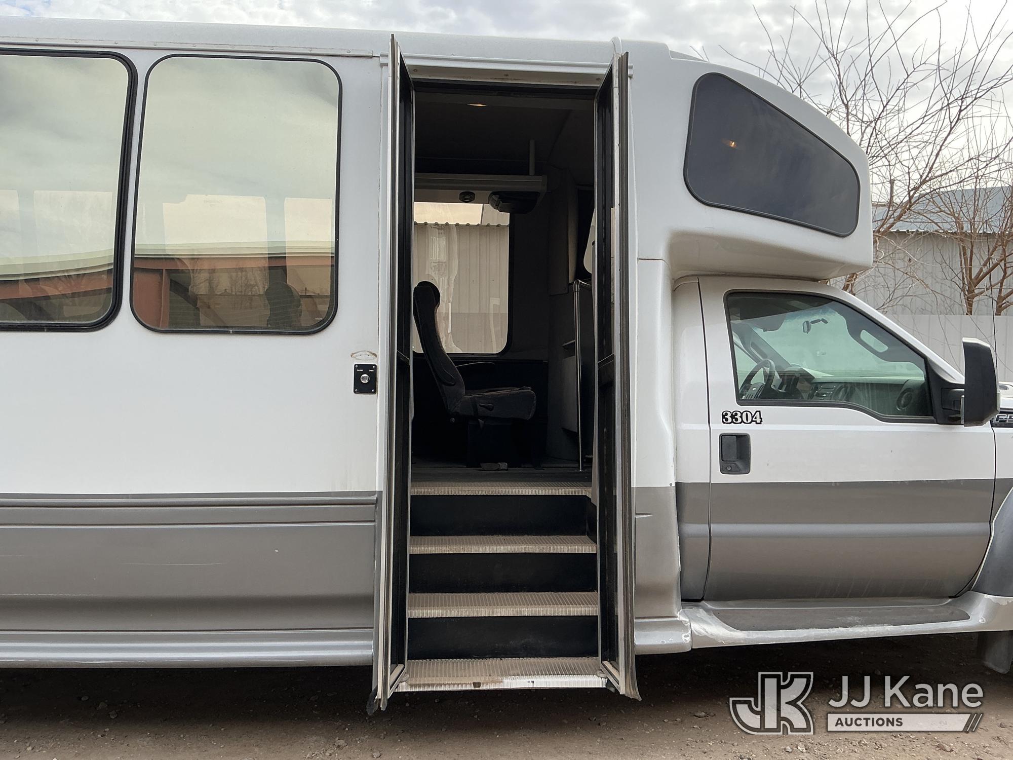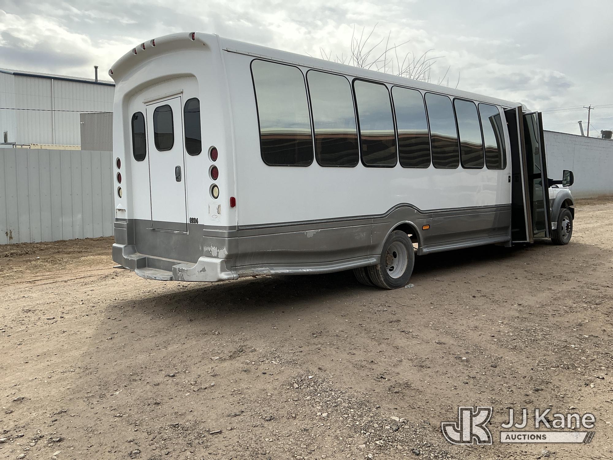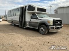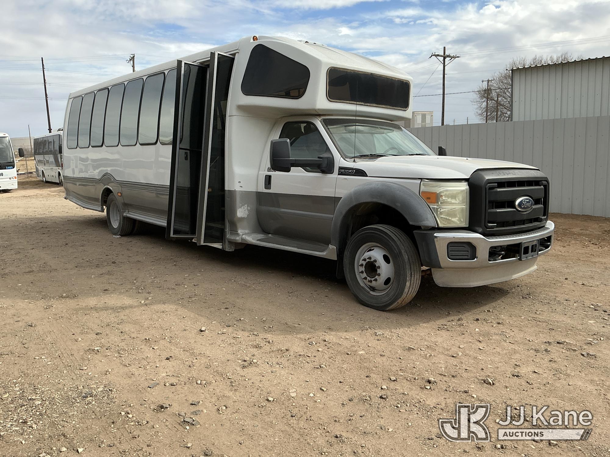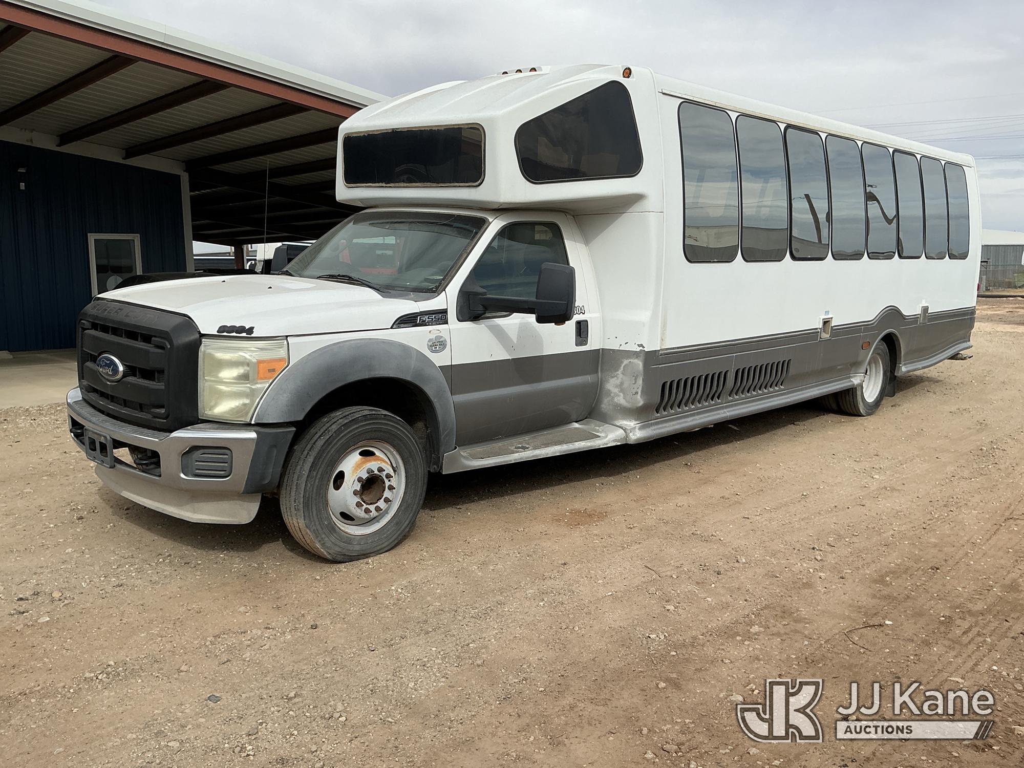 2012 Ford F-550 Regular Cab DRW 2WD Bus, 6.7L V8 OHV 16V DIESEL RWD, Auto, A/C, with 33 Person capacity, (202,652 miles) (Runs & Moves)(Jump To Start, Check Engine Light Is On, Windshield Cracked, Body Damage Scratches Paint Peeling And Other Damage At Right Rear, And The Rear Exhaust Pipe Is Damaged ) This is a Titled Item*