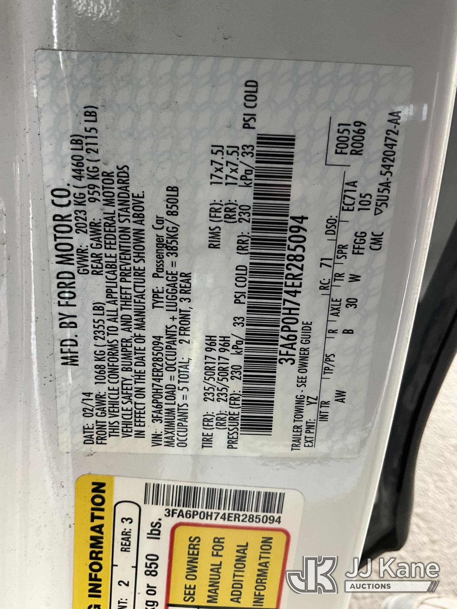 2014 Ford Fusion 4-Door Sedan, s/n 3FA6P0H74ER285094, 4-cyl, FWD, gas, 5-Speed Automatic, A/C, (115,642 miles) (Runs & Moves) This is a Titled Item*