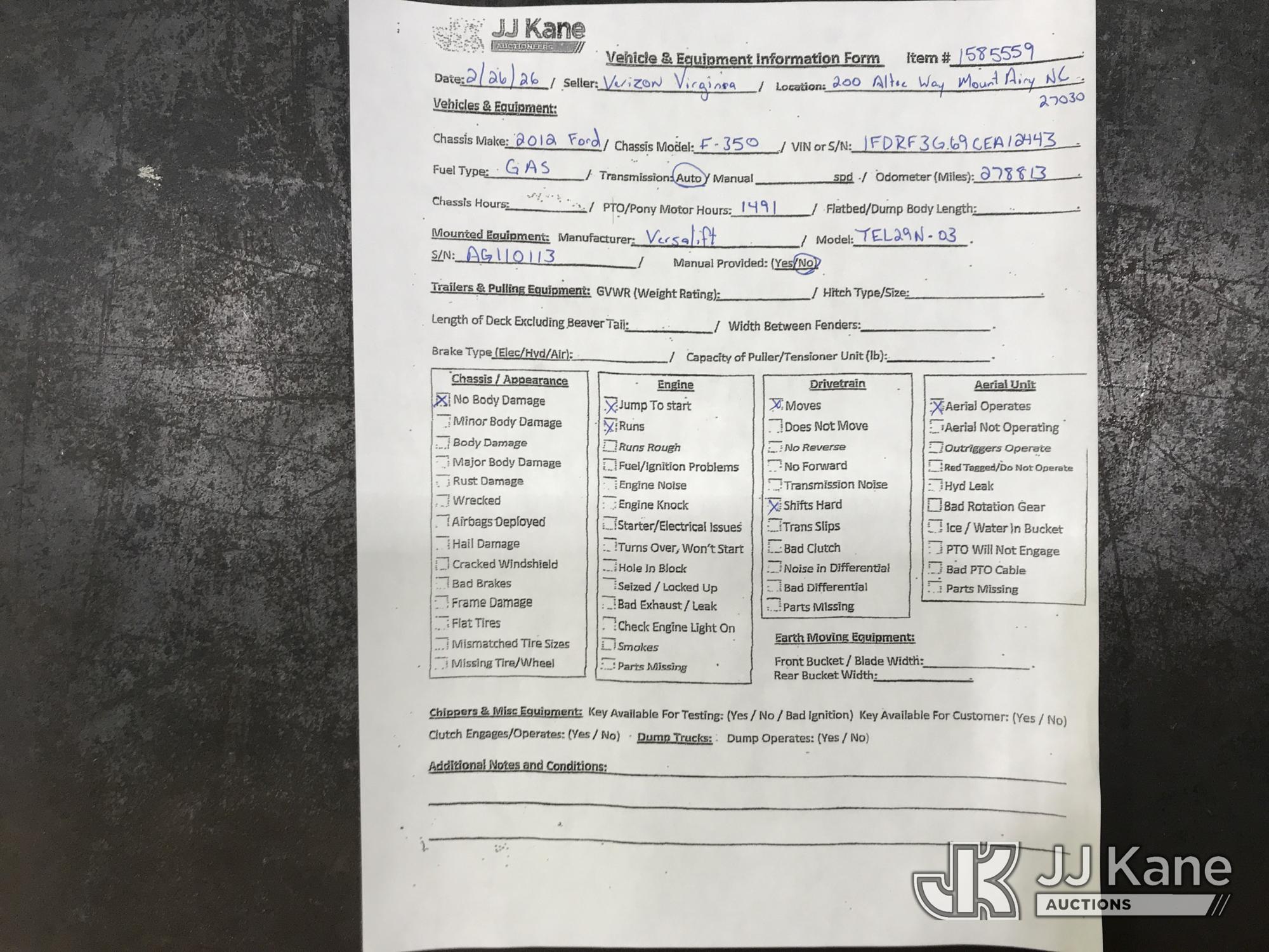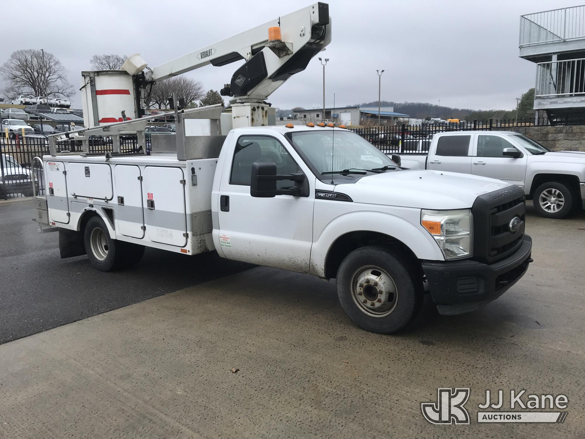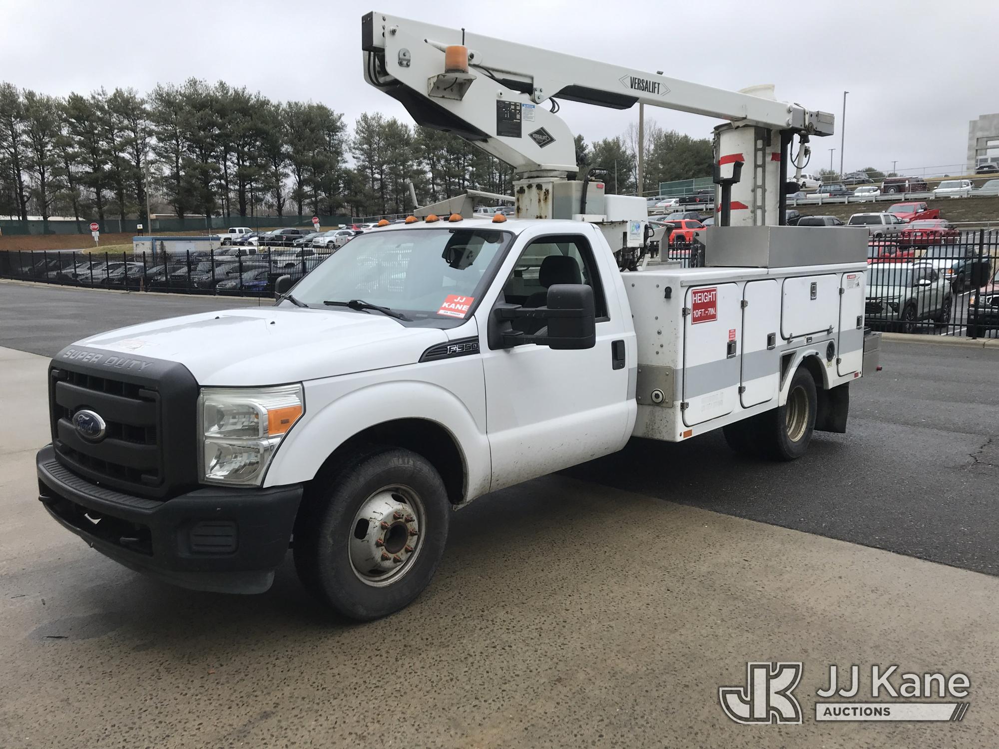 Versalift TEL29NE03, 34 ft, Telescopic Non-Insulated Bucket Truck s/n AG110113, with single-man bucket, mounted behind cab on 2012 Ford F-350 SD Service Truck, 6.2L V8 OHV 16V RWD, Gas, 6-Speed Automatic, A/C, with fiberglass body, (278,813 miles) (Runs, Moves & Upper Operates, Shifts Hard) (Reads 1,491 hours) This is a Titled Item*