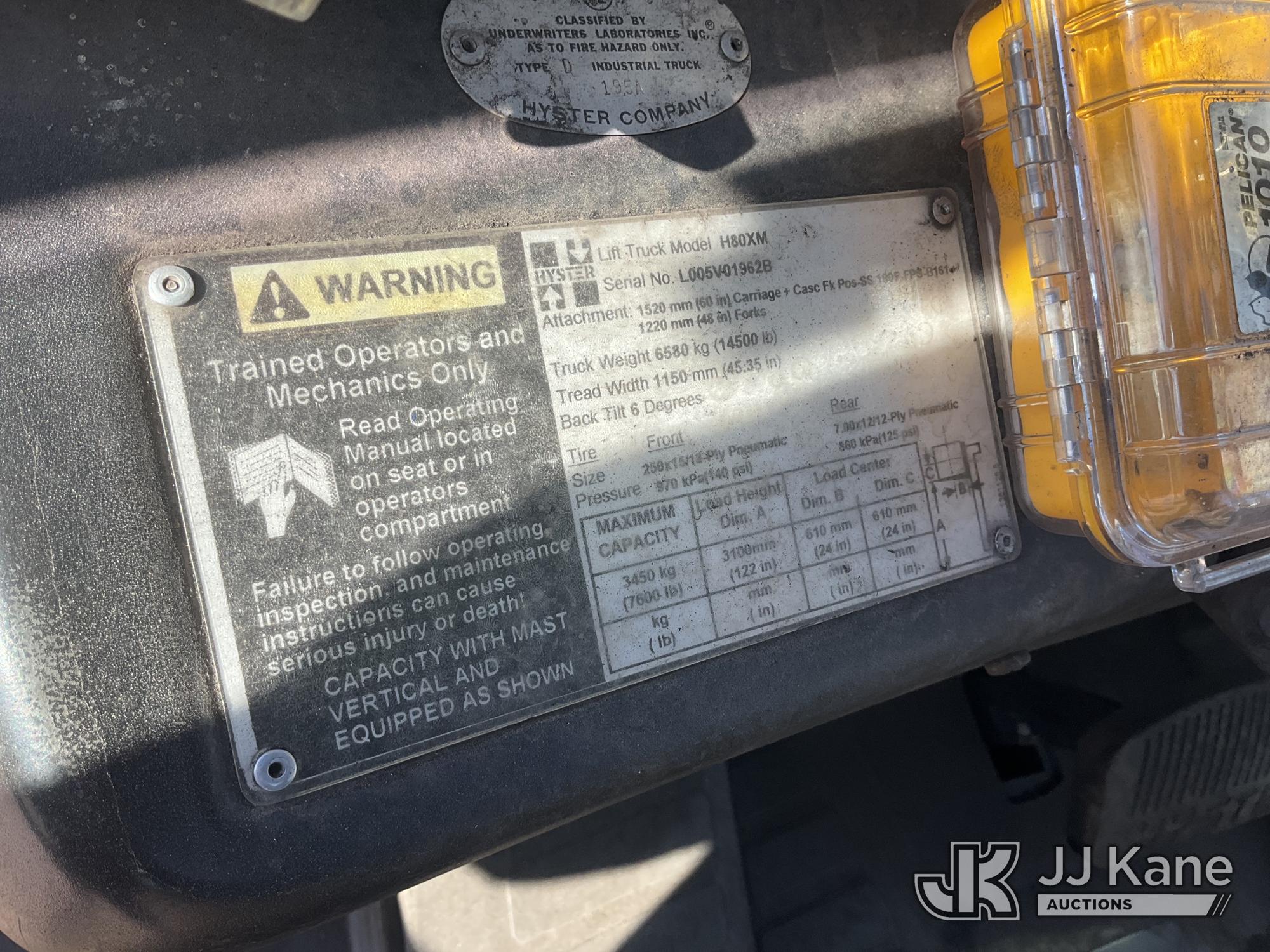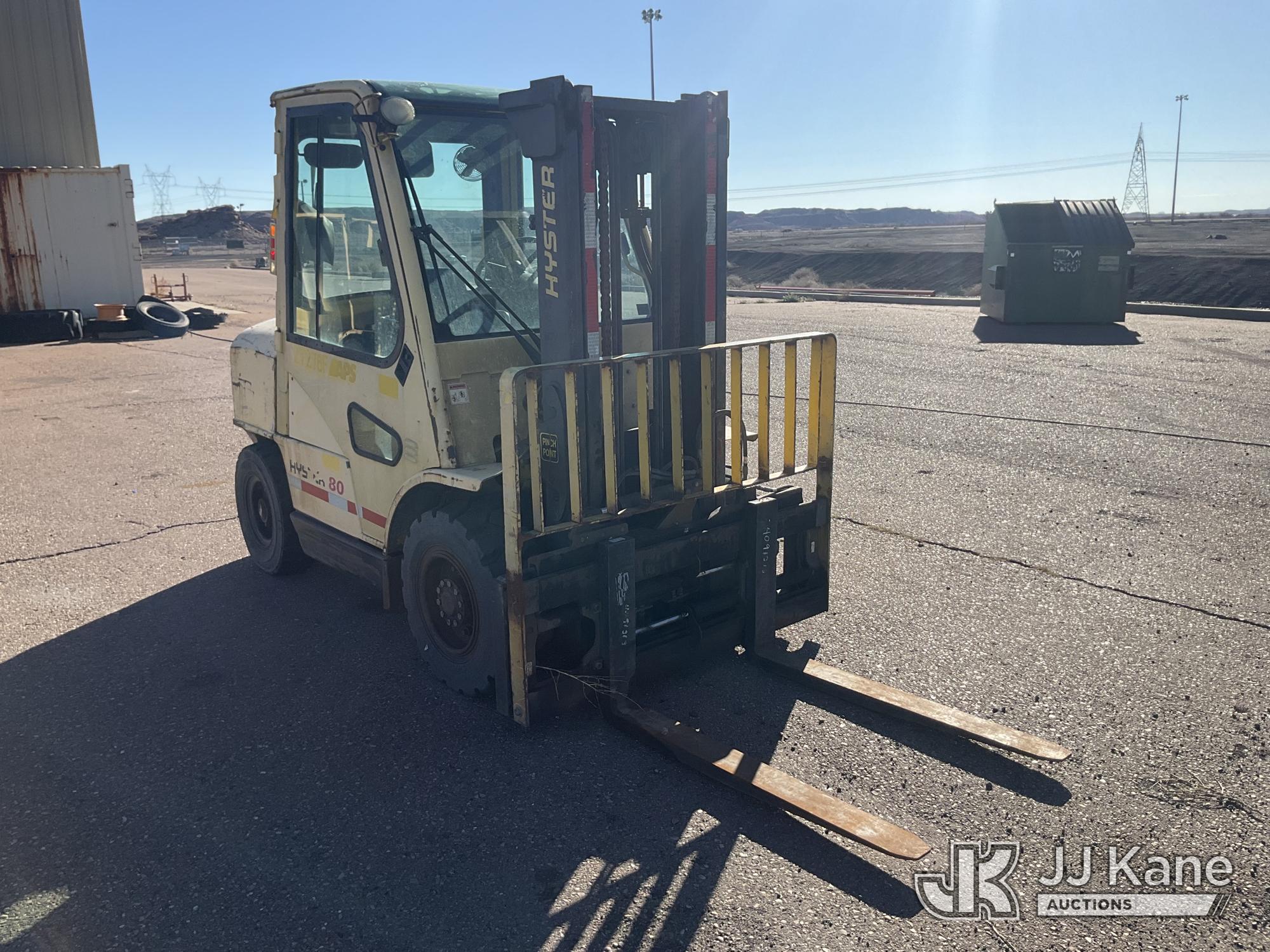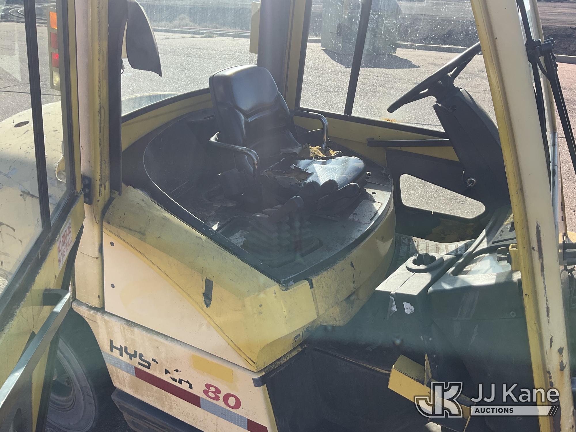 2004 Hyster H80XM Pneumatic Tired Forklift, s/n L005V01962B, diesel, Shuttle, with 7600 lbs max capacity, 122in fork height, enclosed cab, (Runs, Moves, & Operates) (Reads 5,067 hours)*