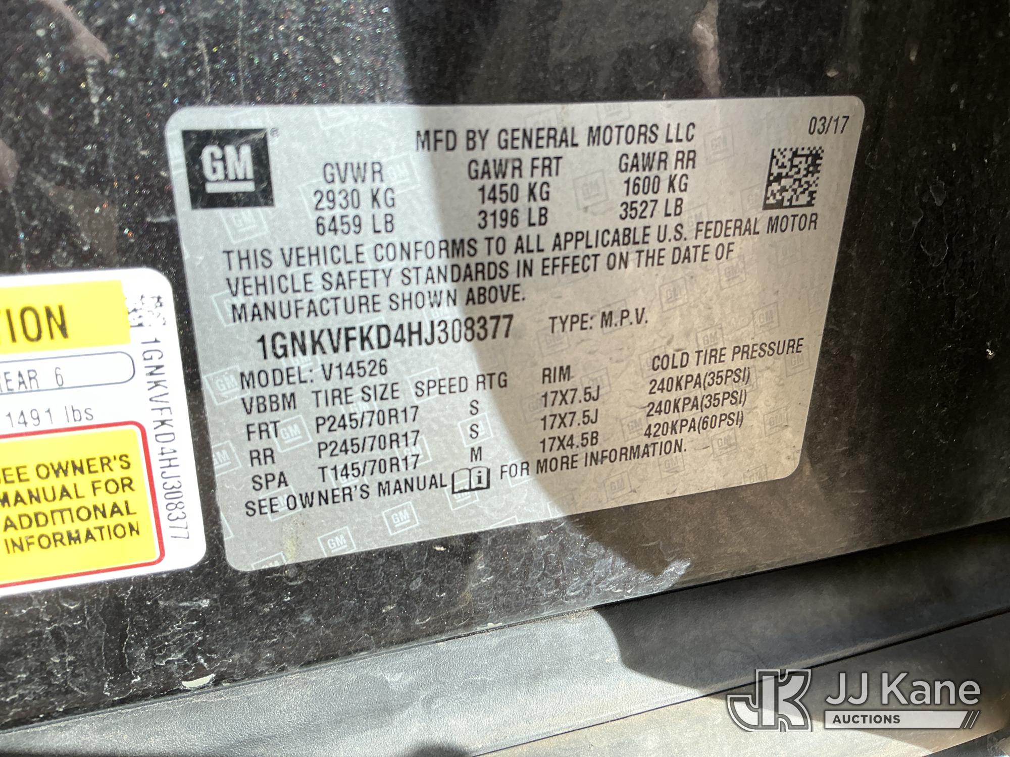 2017 Chevrolet Traverse AWD 4-Door Sport Utility Vehicle, 3.6L V6 DOHC 24V gas, 6-Speed Automatic, A/C, (104,092 miles) (Runs & Moves) (Jump To Start, Shuts Off When Jump Removed, Drivers Side Brake/Reverse Lights Out, Body Damage) (Non Drive Away Removal Only: Fails Safety Inspection) This is a Titled Item*