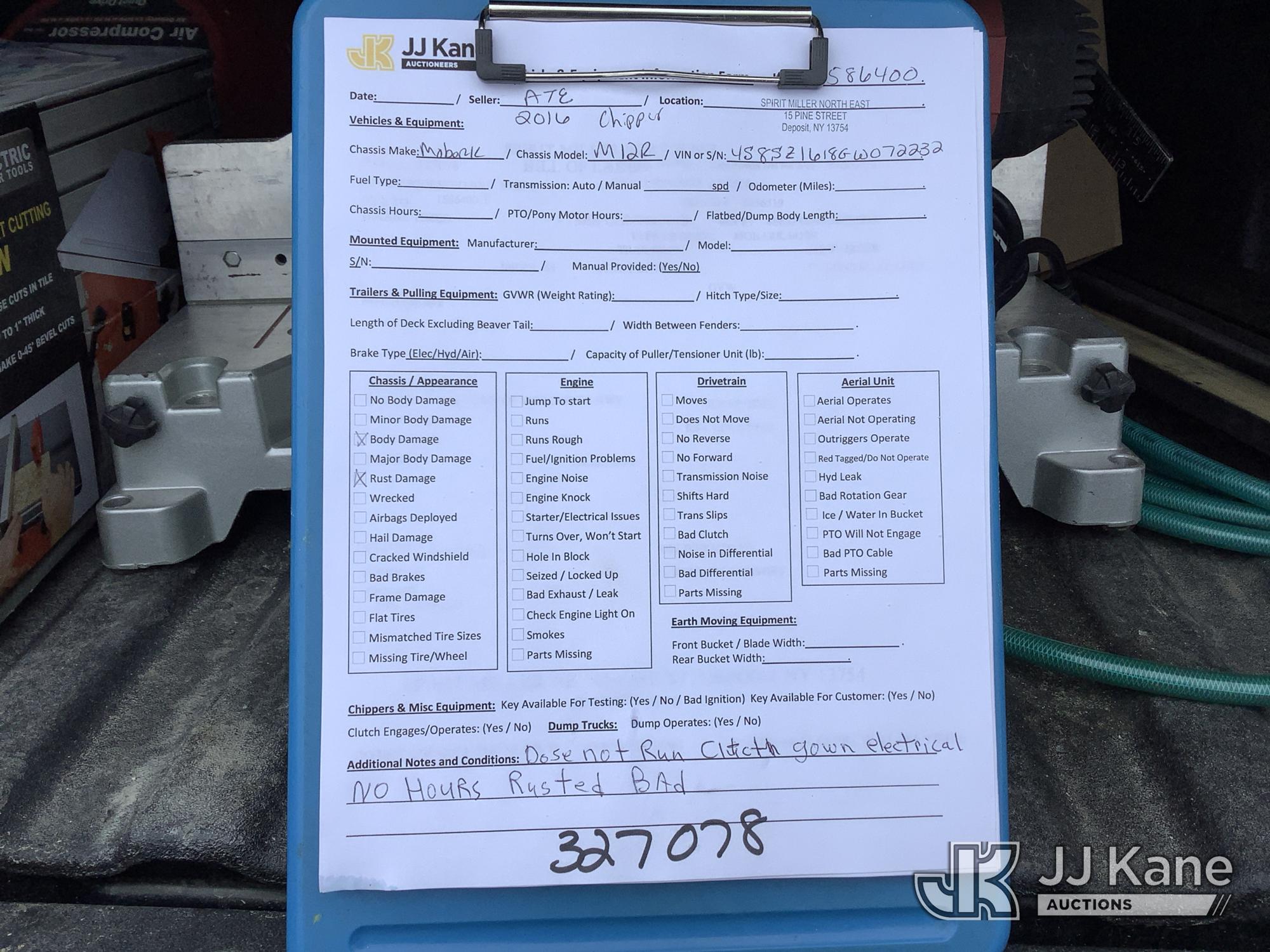 2016 Morbark M12R Chipper (12in Drum), s/n 4S8SZ1618GW072232, diesel, trailer mtd. (No Title) (Not Running, Clutch Gone, Electrical Issue, Hours Unknown, Body/Rust Damage) (Seller States: Blown head gasket, clutch and electrical system failure)*