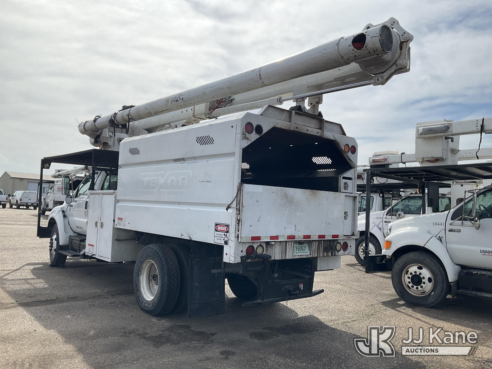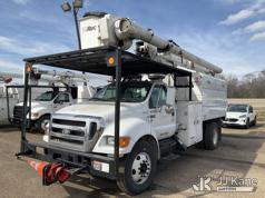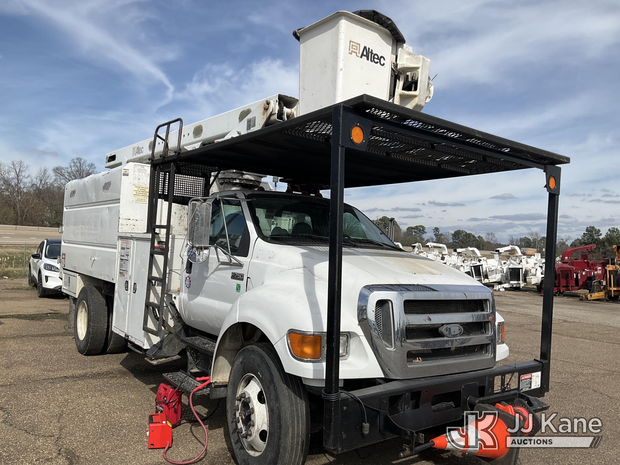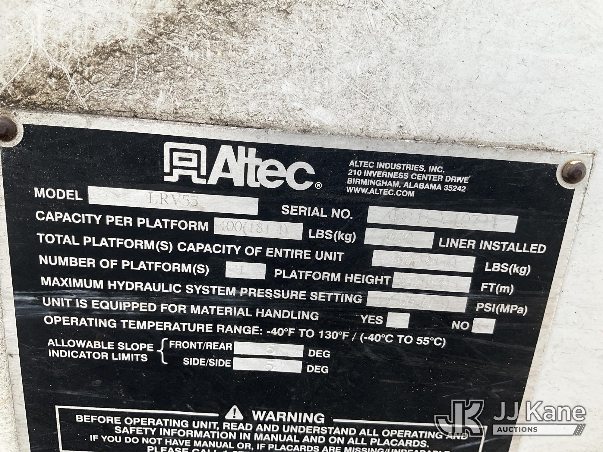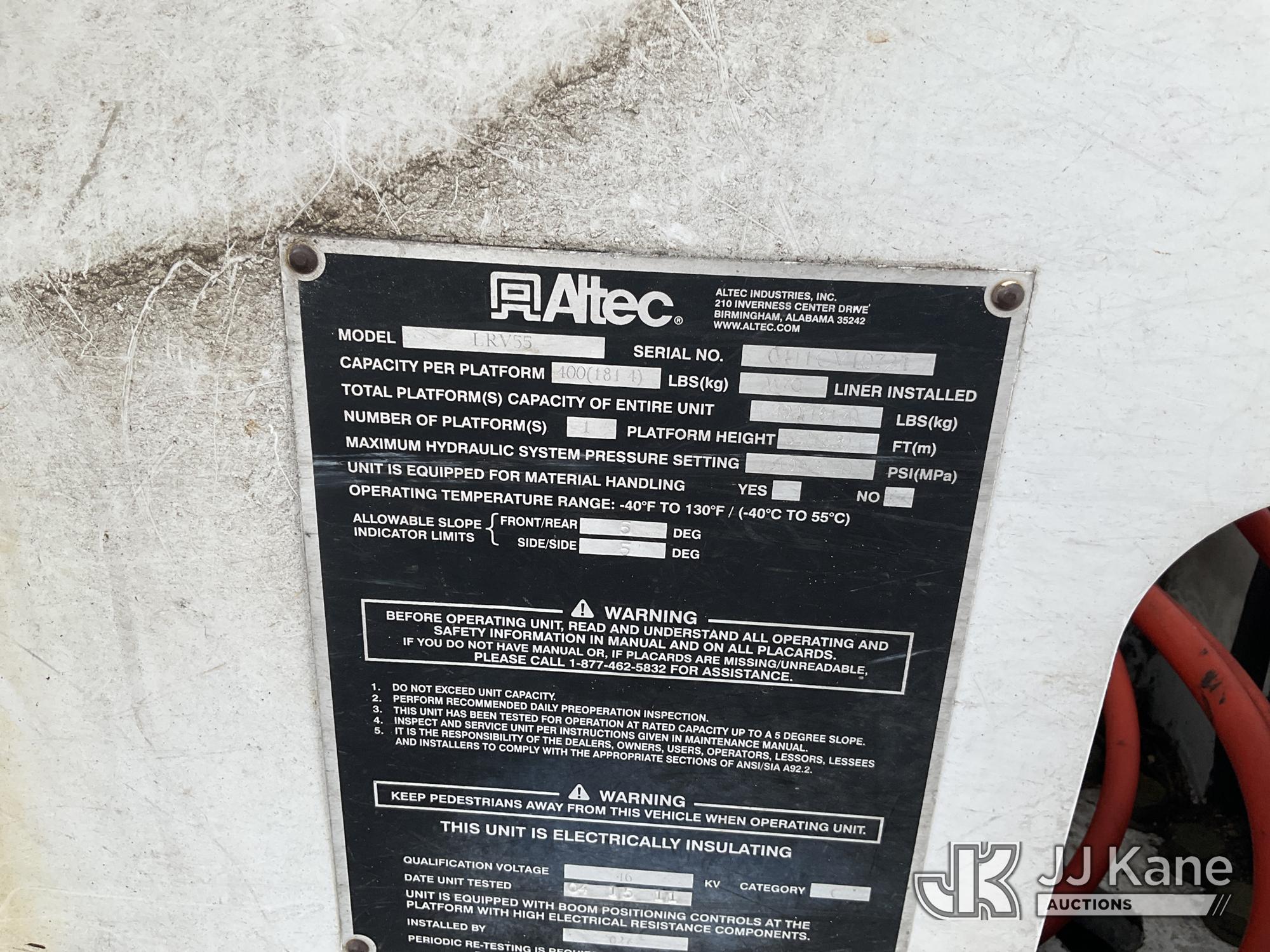 Altec LRV-55, 60 ft, Over-Center Bucket Truck s/n 0411CV10724, with Single-Man Bucket, mounted behind cab on 2010 Ford F-750 Chipper Dump Truck, 6.7L L6 DIESEL 4X2, manual, (61,337 miles) (Per Seller Tag “All taillights, Brake Lights, and Reverse Lights are inoperable. Parking Brake Inoperative, Lower Boom Lift cylinder retaining Buckeye Broken “ Runs, Moves, PTO Not Engaging, Upper Conditions Unknown) (Jump to Start, NO PARKING BRAKE!, Further Conditions Unknown, Dies When Jump Box is Disconnected, Suggest Tow Away The manufacturer has notified JJ Kane that this equipment is subject to an open recall. CSN 672 LRV/LR7 Leveling Yoke Inspection The equipment should not be operated until this is addressed. Buyer is responsible for reviewing the recall notice and contacting the manufacturer to schedule the recommended corrective actions. Associated costs may be covered by the manufacturer in some cases.) This is a Titled Item*