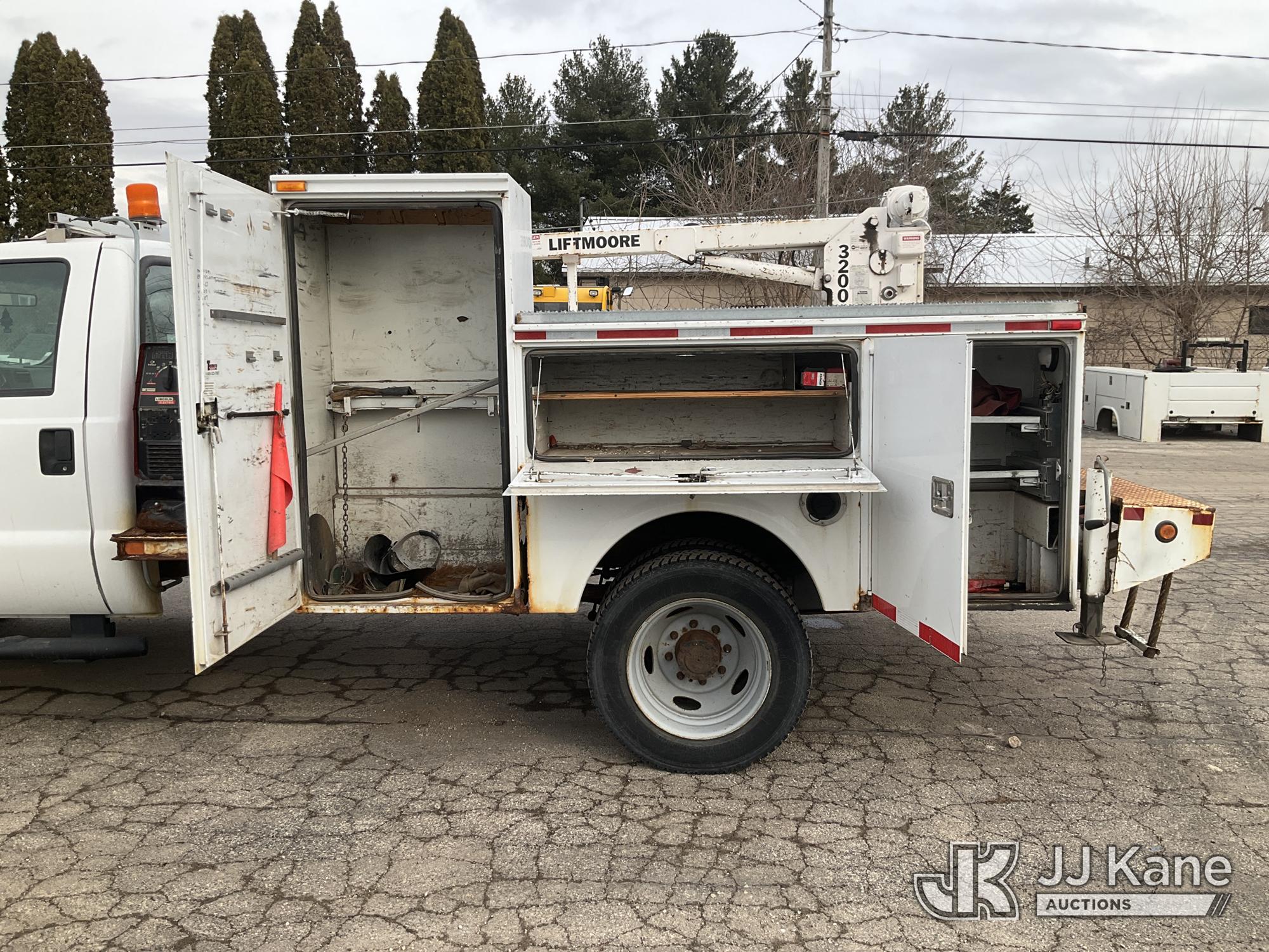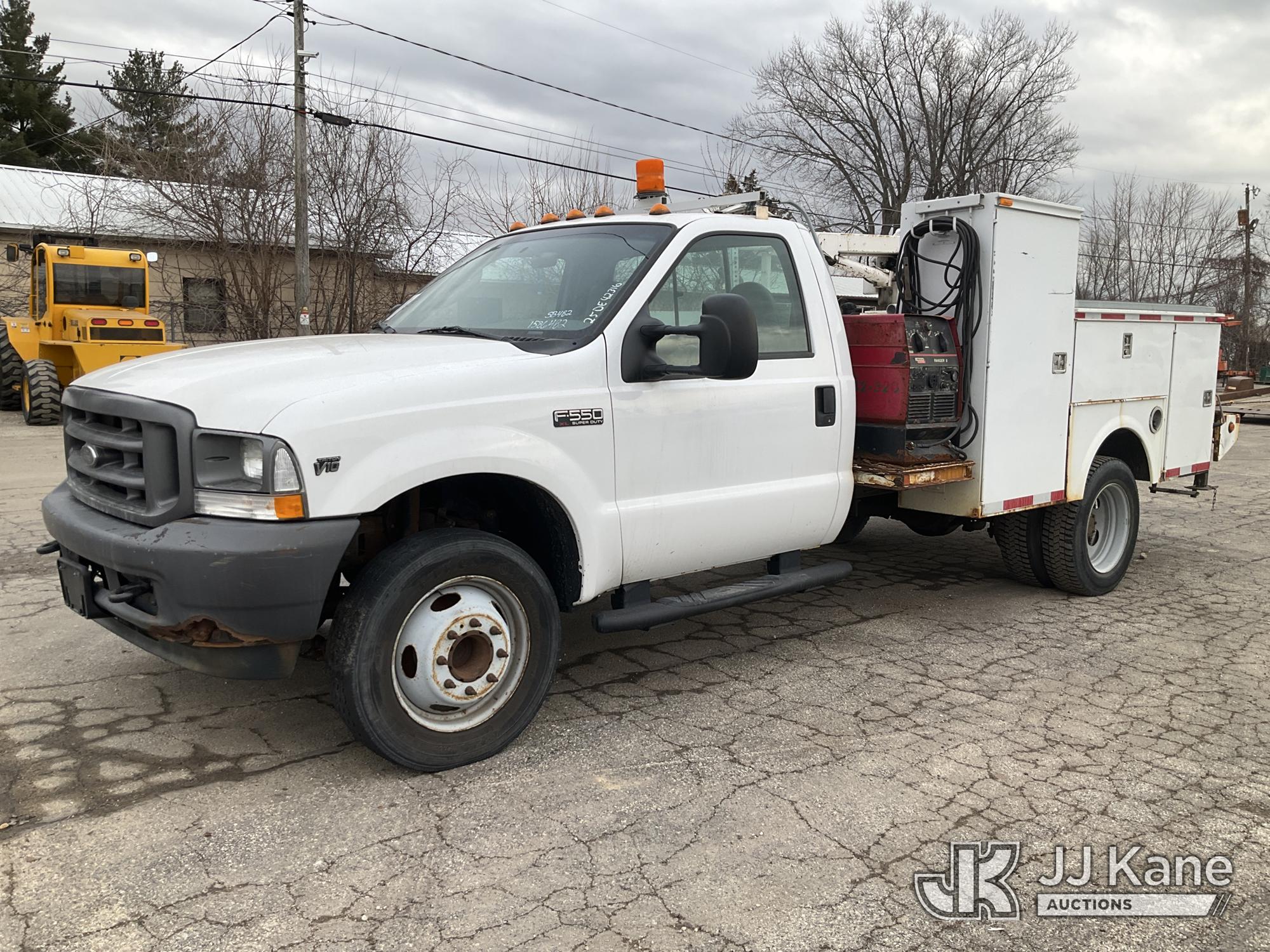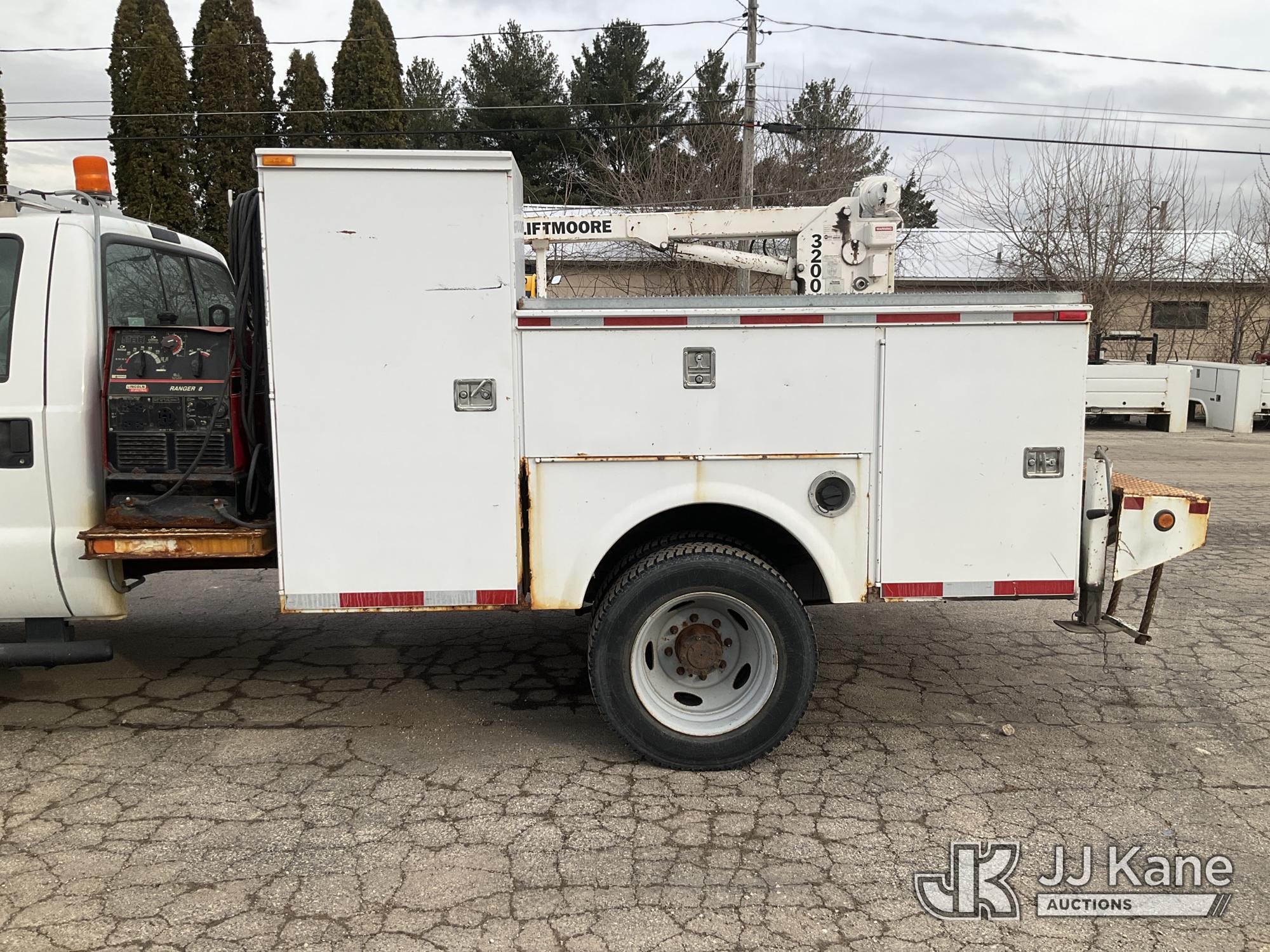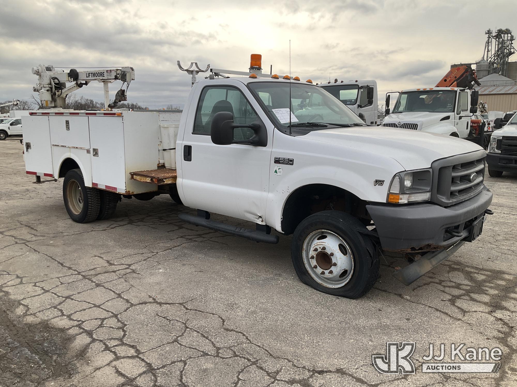 2003 Ford F-550 Welder Truck, 10-cyl gas, Auto, with Liftmoore Crane, Lincoln Ranger 8 Welder, (Exempt from Odometer Disclosure - Reads 57,467 miles) (Runs & Moves) (Front Tire Flat-Broken Belt-Not Roadworthy, Body Damage)(Missing Crane Remote-Crane Condition Unknown, Welder Cranks-Does Not Start-Condition Unknown) This is a Titled Item*